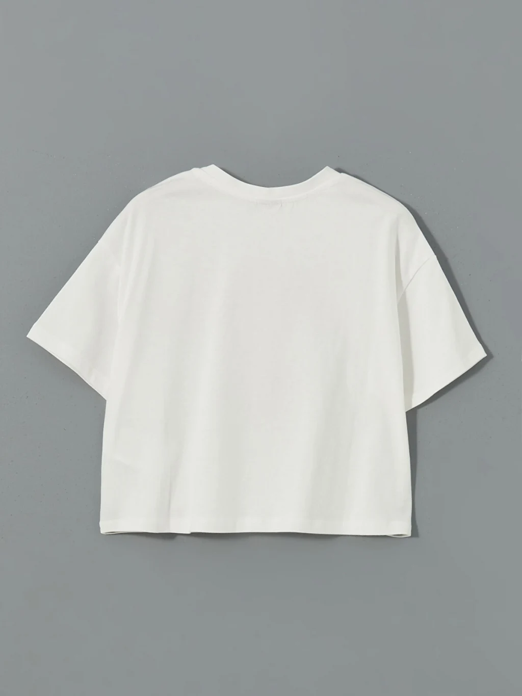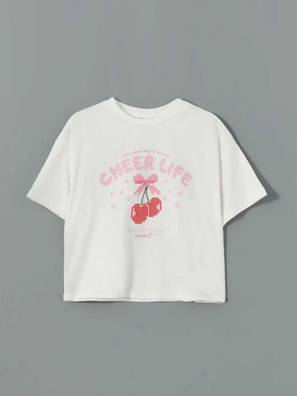 Kız çocuk tişört, %100 pamuklu penye kumaştan üretilmiştir. Bisiklet yaka, kısa kollu ve bol kalıplıdır. Önünde baskı detayı bulunur.