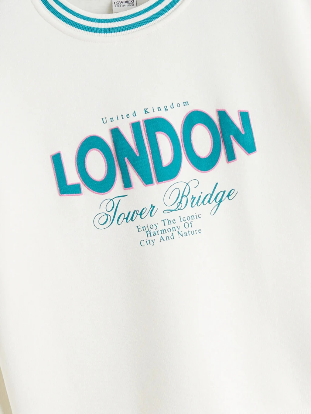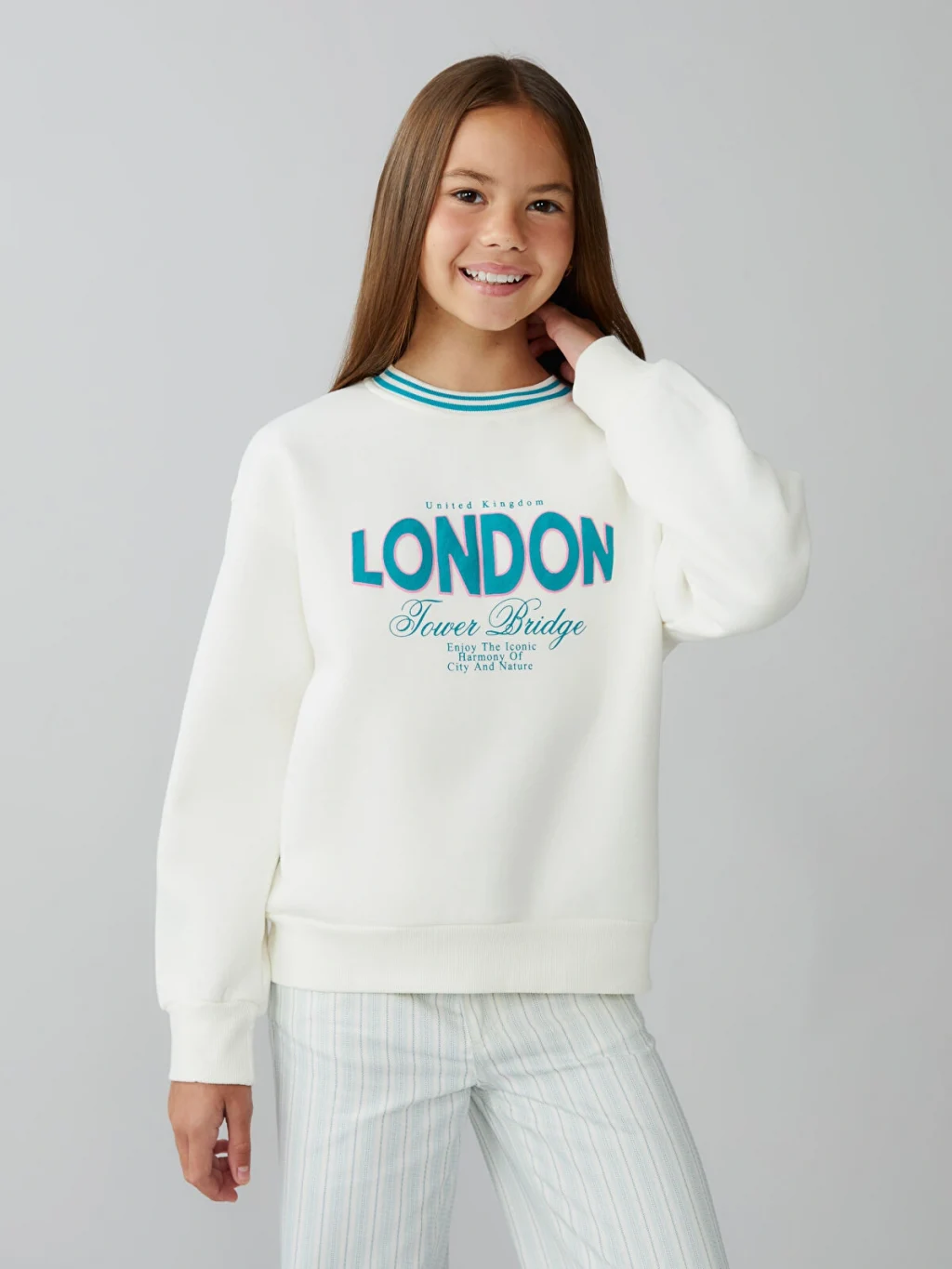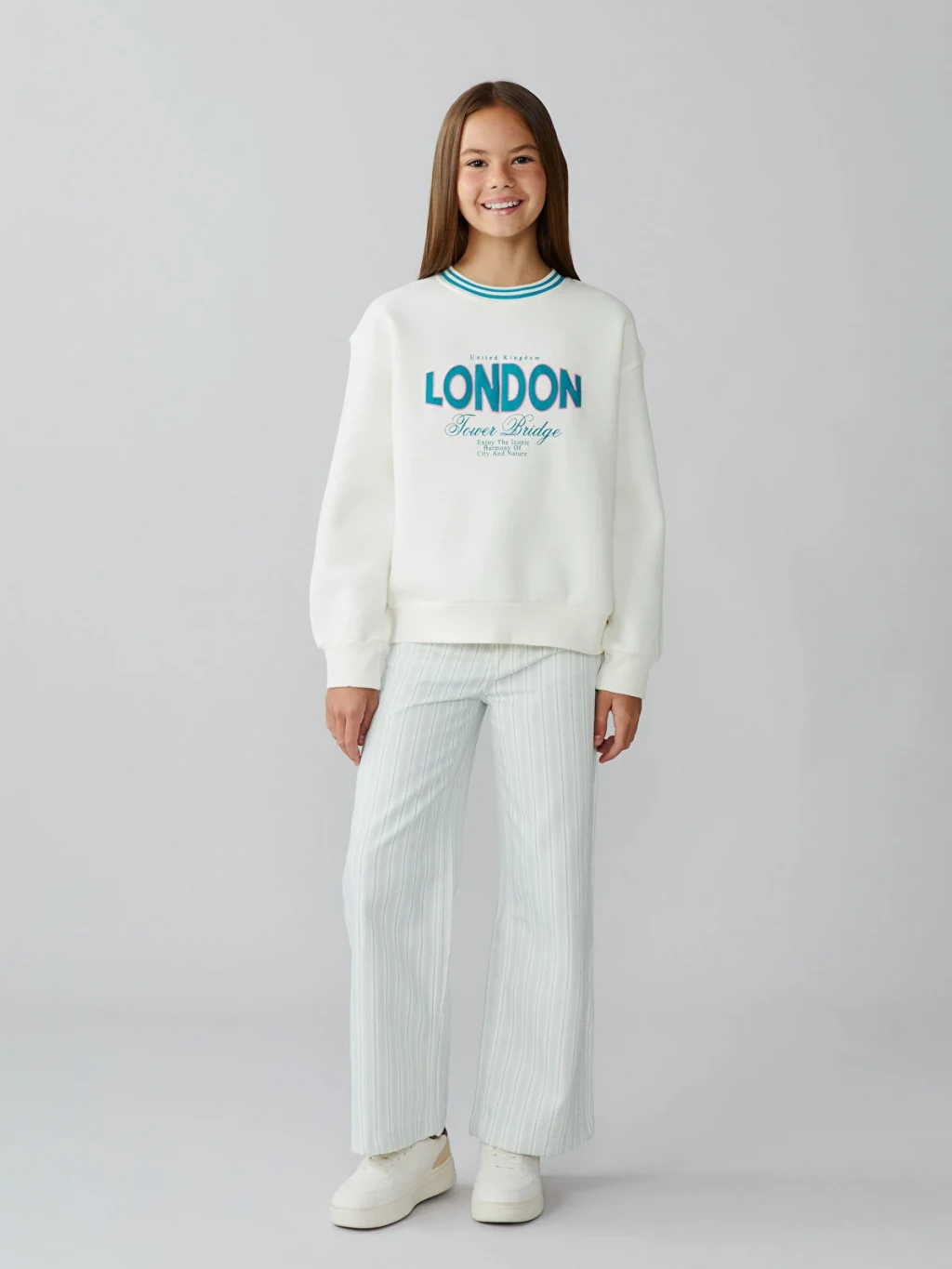 Çizgili ribanalı bisiklet yakalı, uzun kollu kız çocuk sweatshirt, kalın 3 iplik şardonlu kumaştan üretilmiştir. Önü yazı baskılıdır.