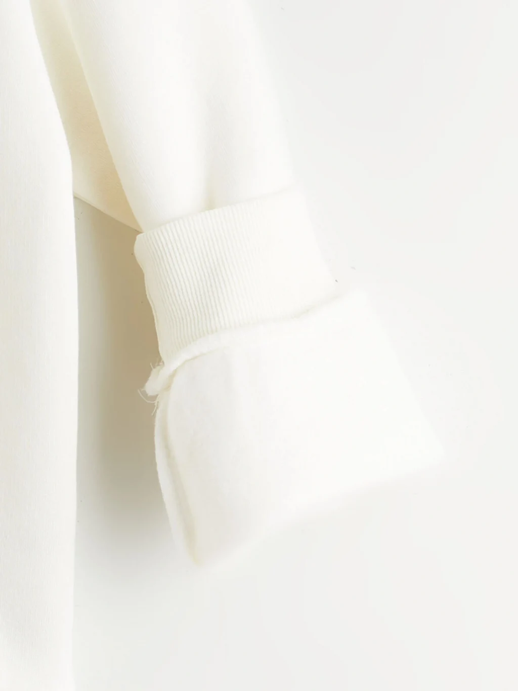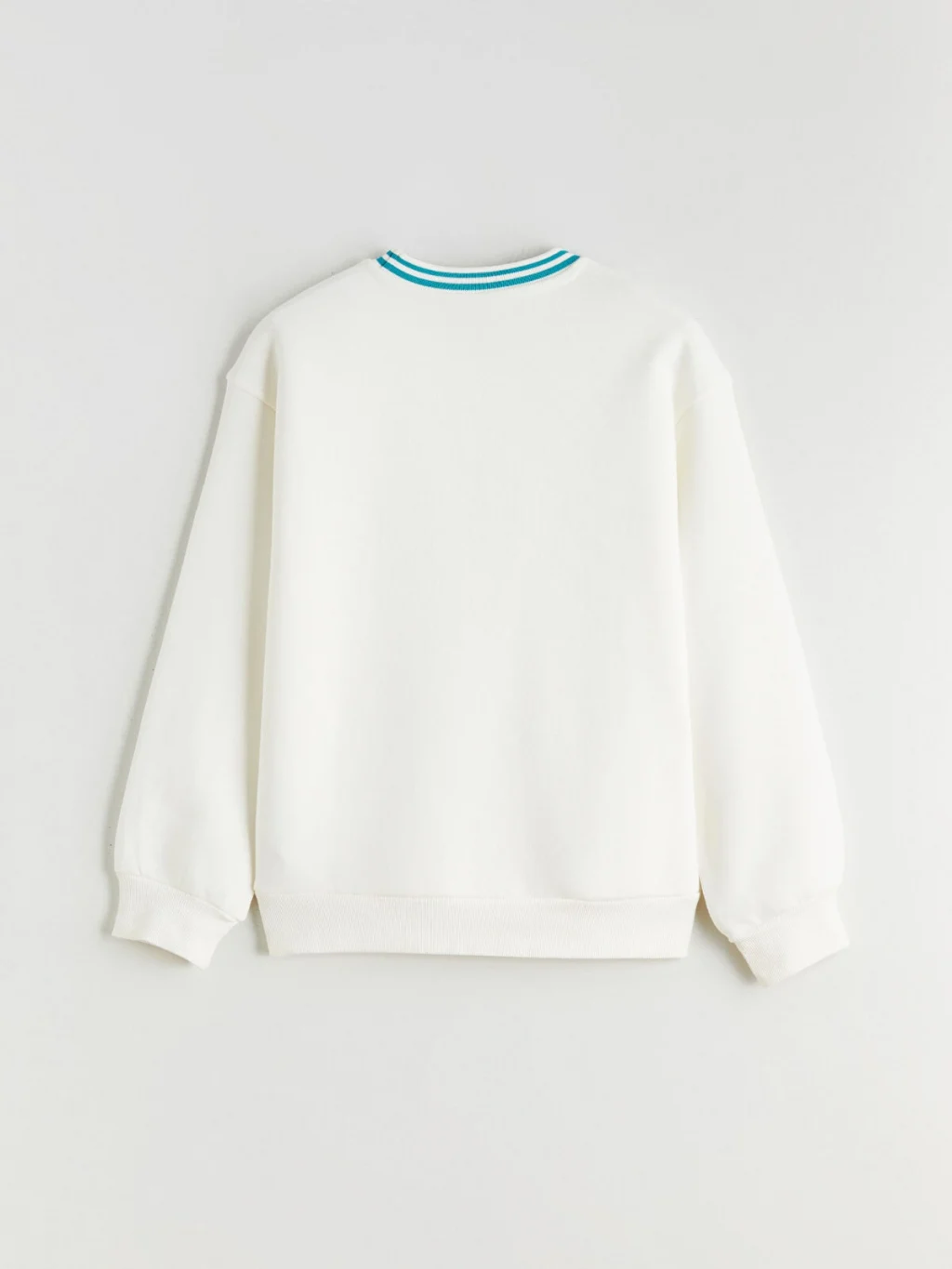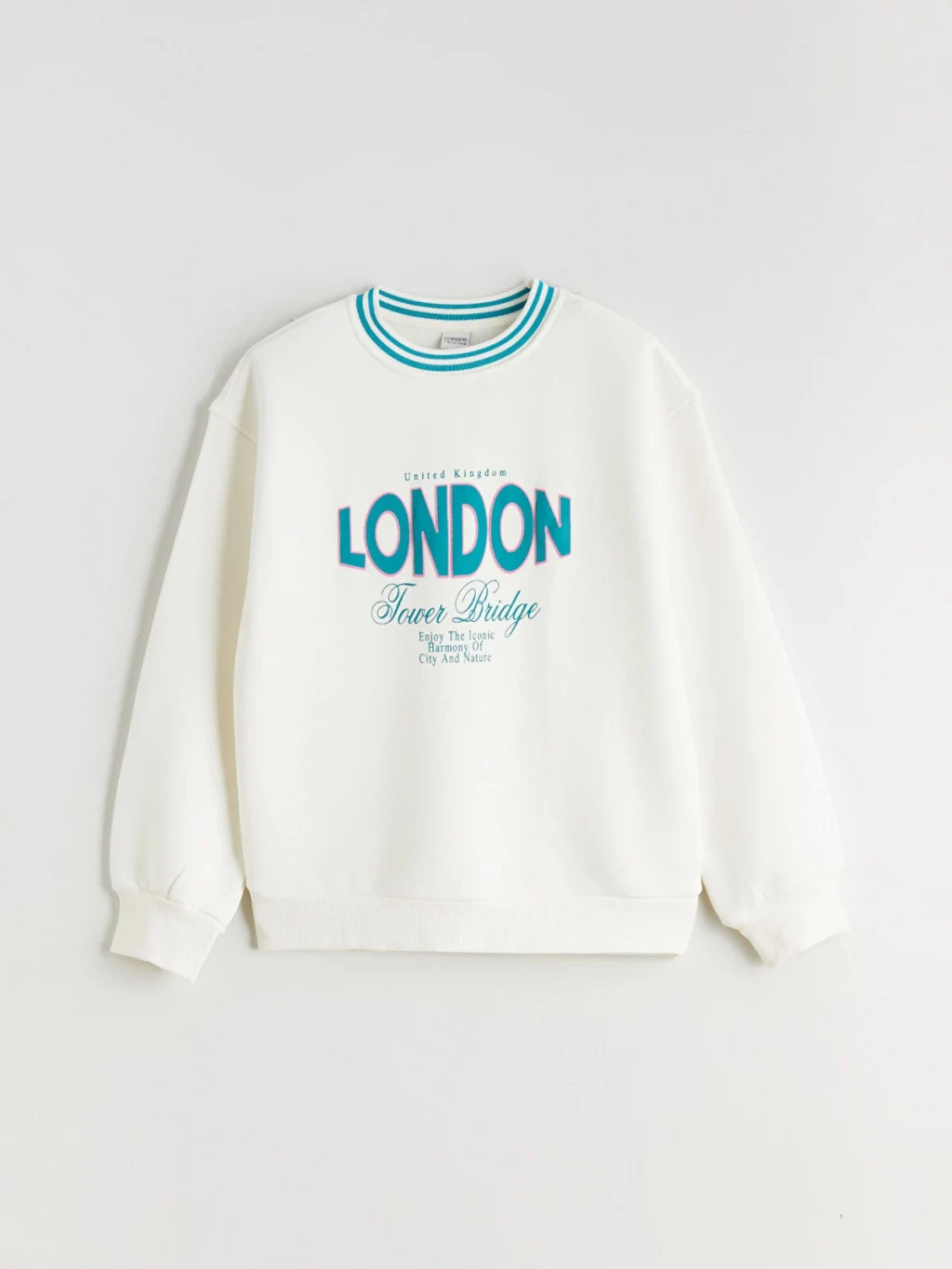 Çizgili ribanalı bisiklet yakalı, uzun kollu kız çocuk sweatshirt, kalın 3 iplik şardonlu kumaştan üretilmiştir. Önü yazı baskılıdır.