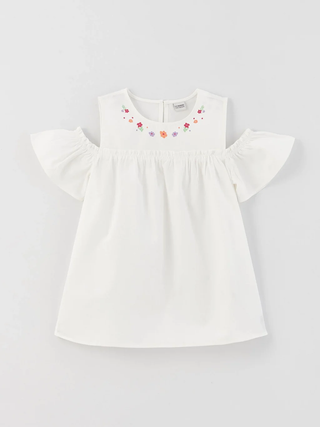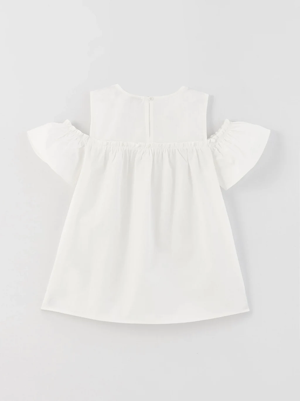 Omuzları pencere detaylı kız çocuk bluz, robalı tasarımı ve yakada nakış işlemeleri ile zarif bir görünüme sahiptir. Pamuk dokunun nefes alan ve terletmeyen yapısıyla konfor sunan tasarım arkadan düğme kapamasıyla giyim kolaylığı sağlar.