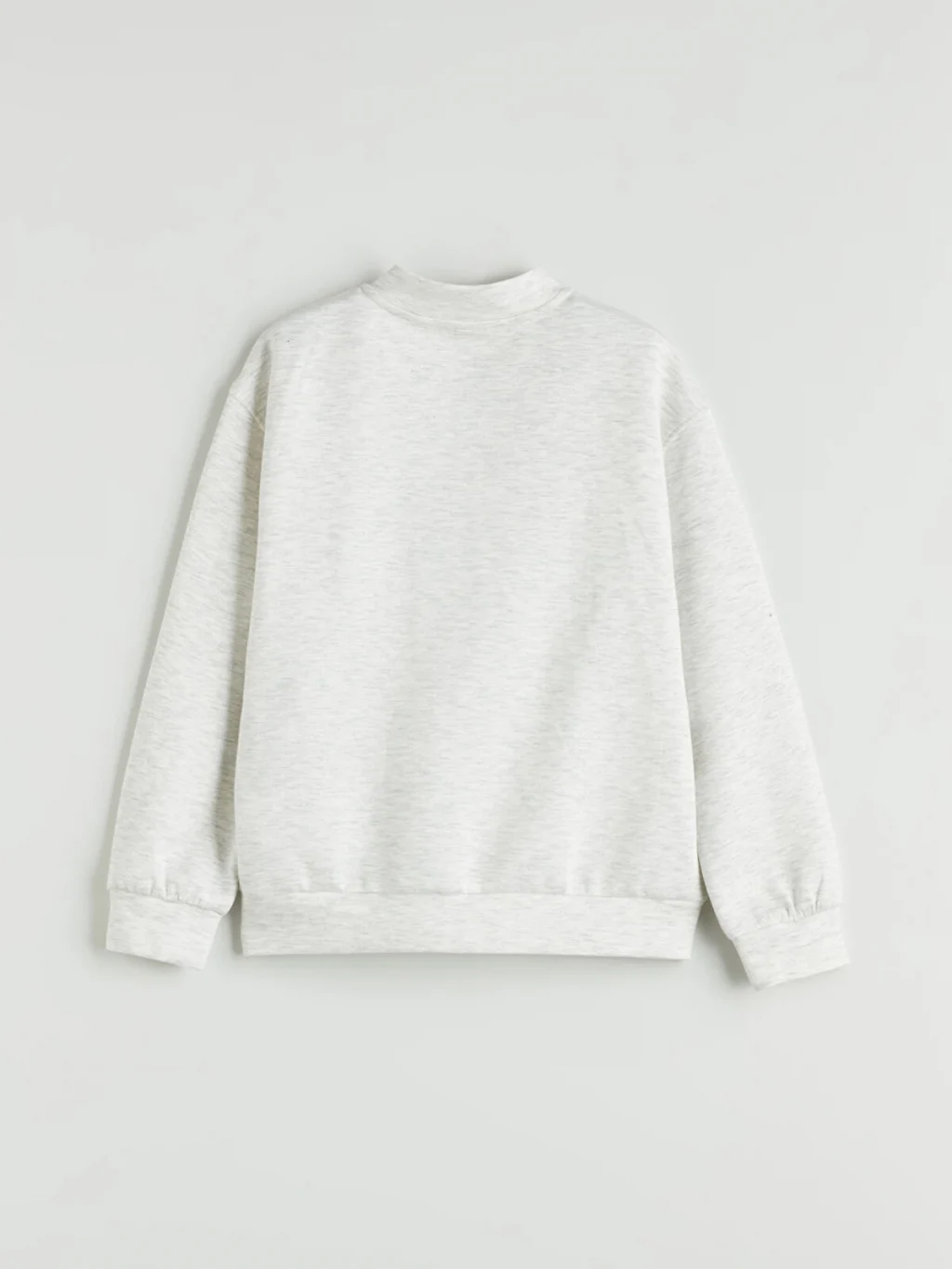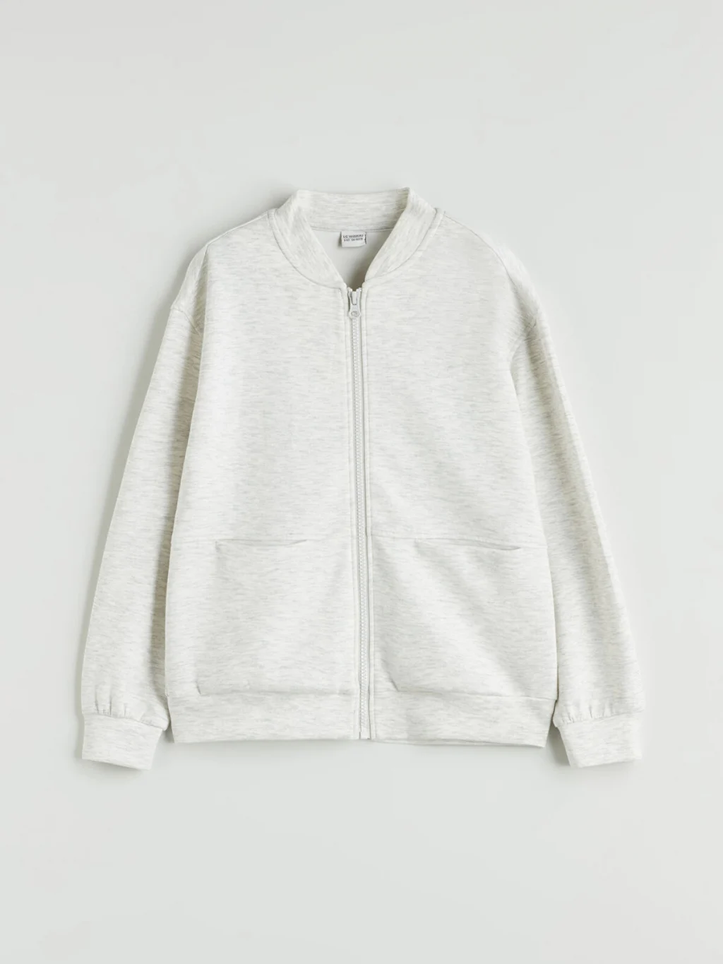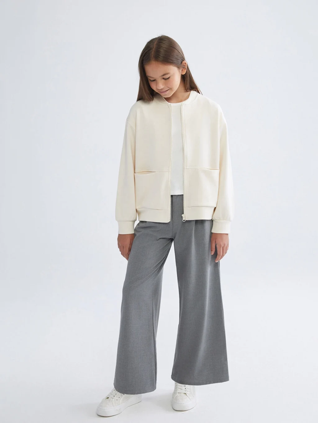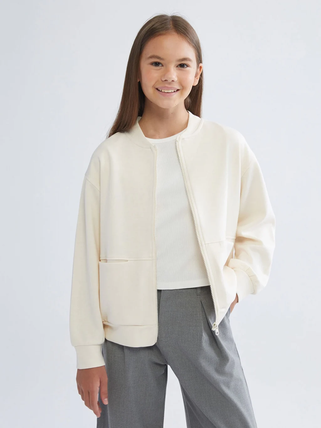 Orta kalınlıkta interlok kumaştan üretilen dik yakalı kız çocuk sweatshirt, uzun kolludur. Önden fermuar kapamalıdır ve iki adet cebi bulunur.