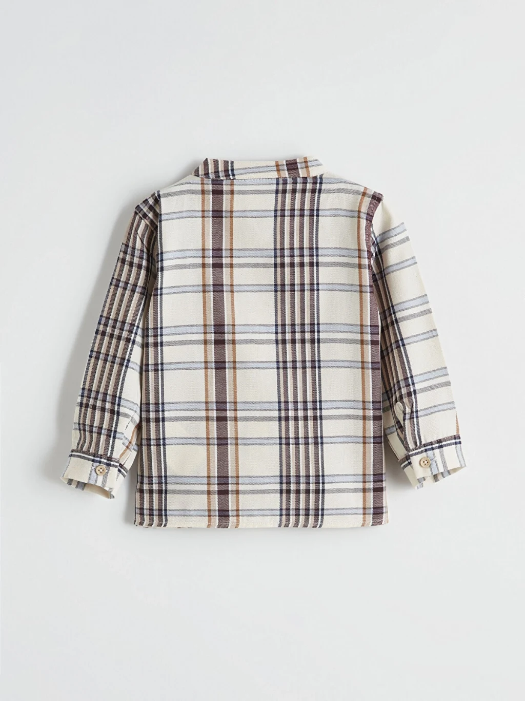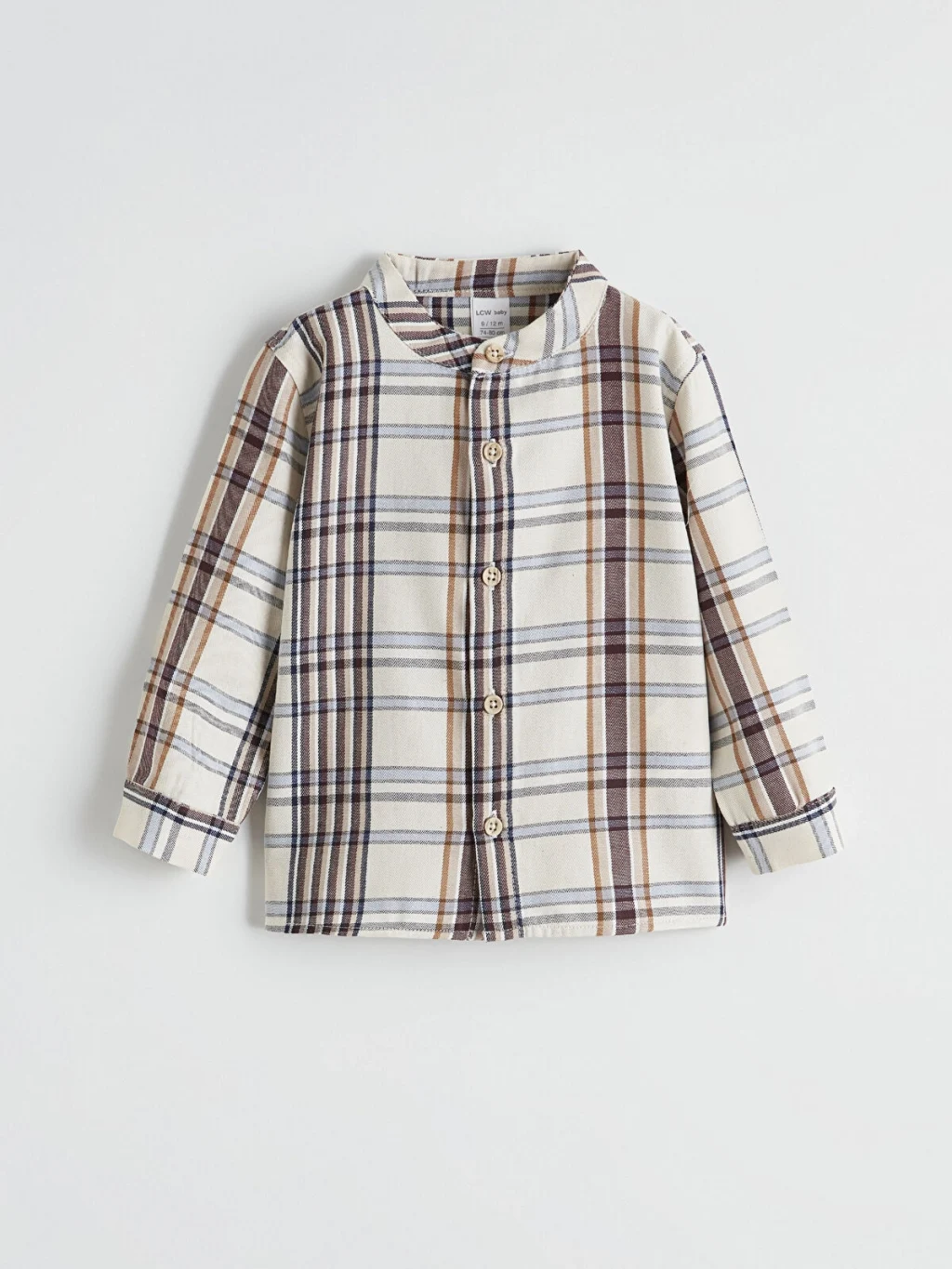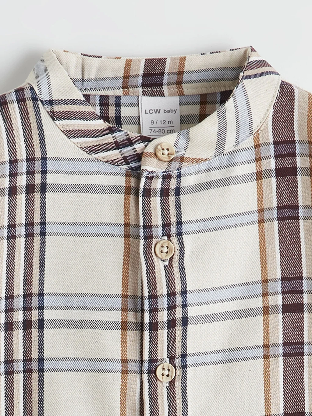 Erkek bebek takım, hakim yaka, uzun kollu, ekose desenli, önden düğme kapamalı gömlek ve bir pantolondan oluşmaktadır.