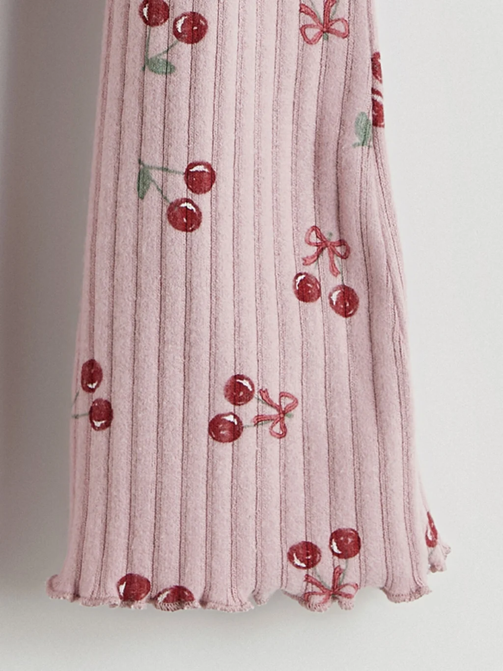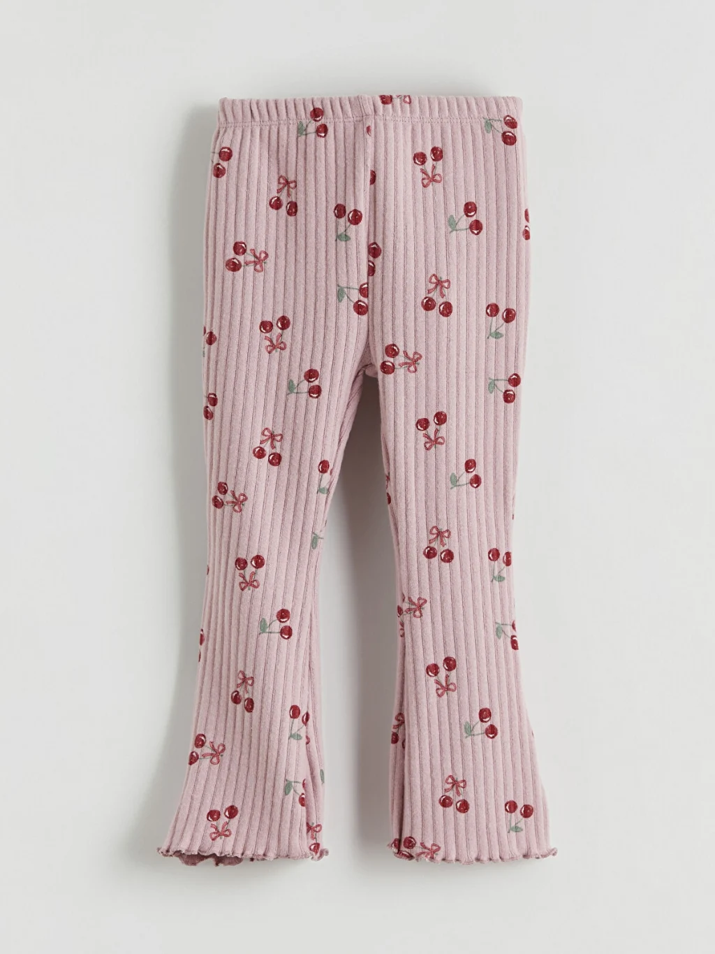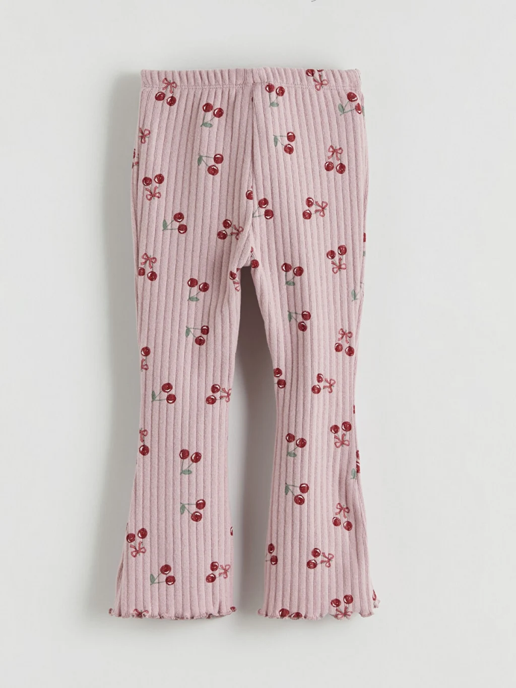 Beli lastikli, fitilli kız bebek pantolon, kiraz desenlidir. İspanyol paça kesimli ve paça uçları kıvrımlı tasarıma sahiptir.
