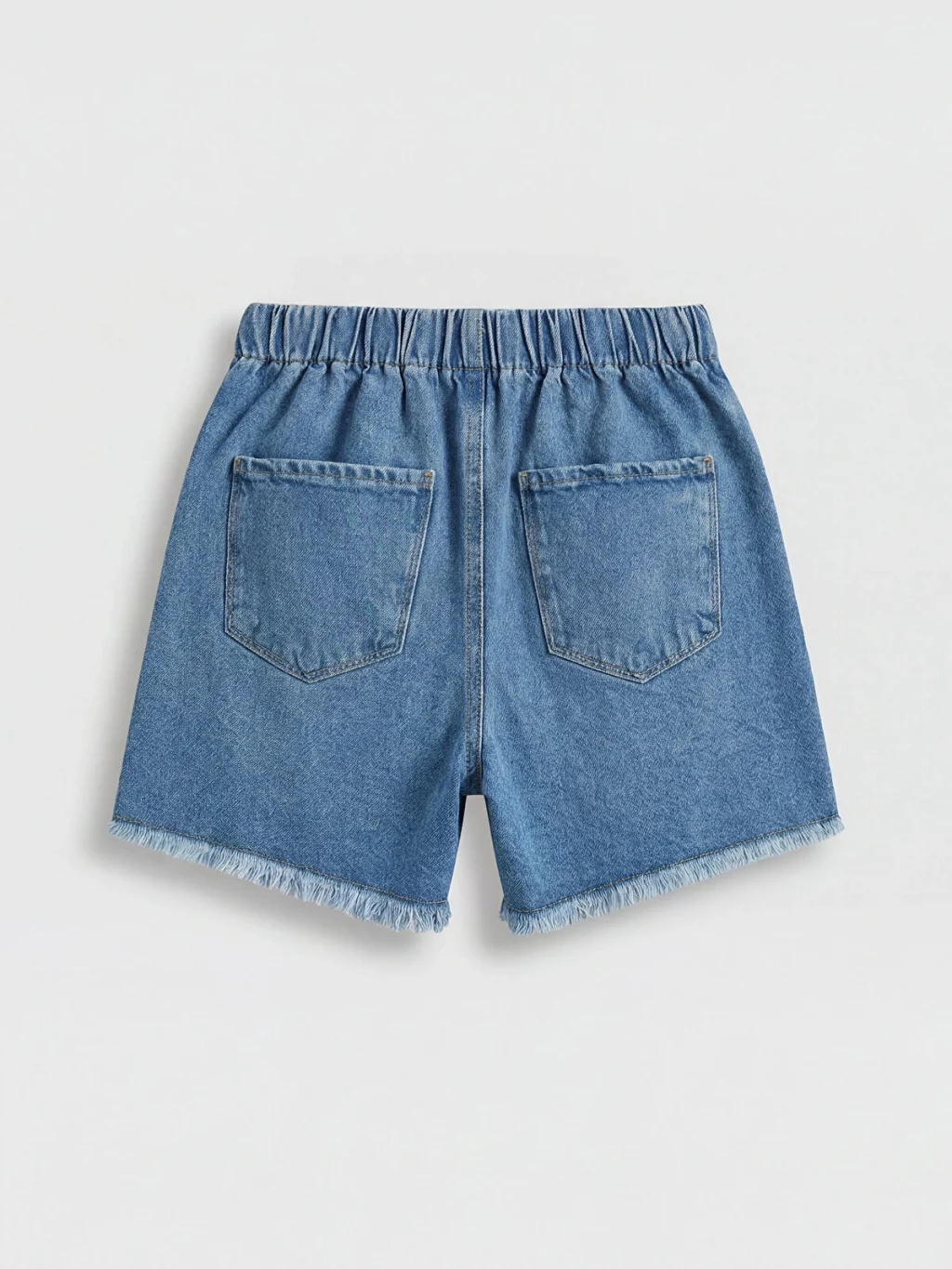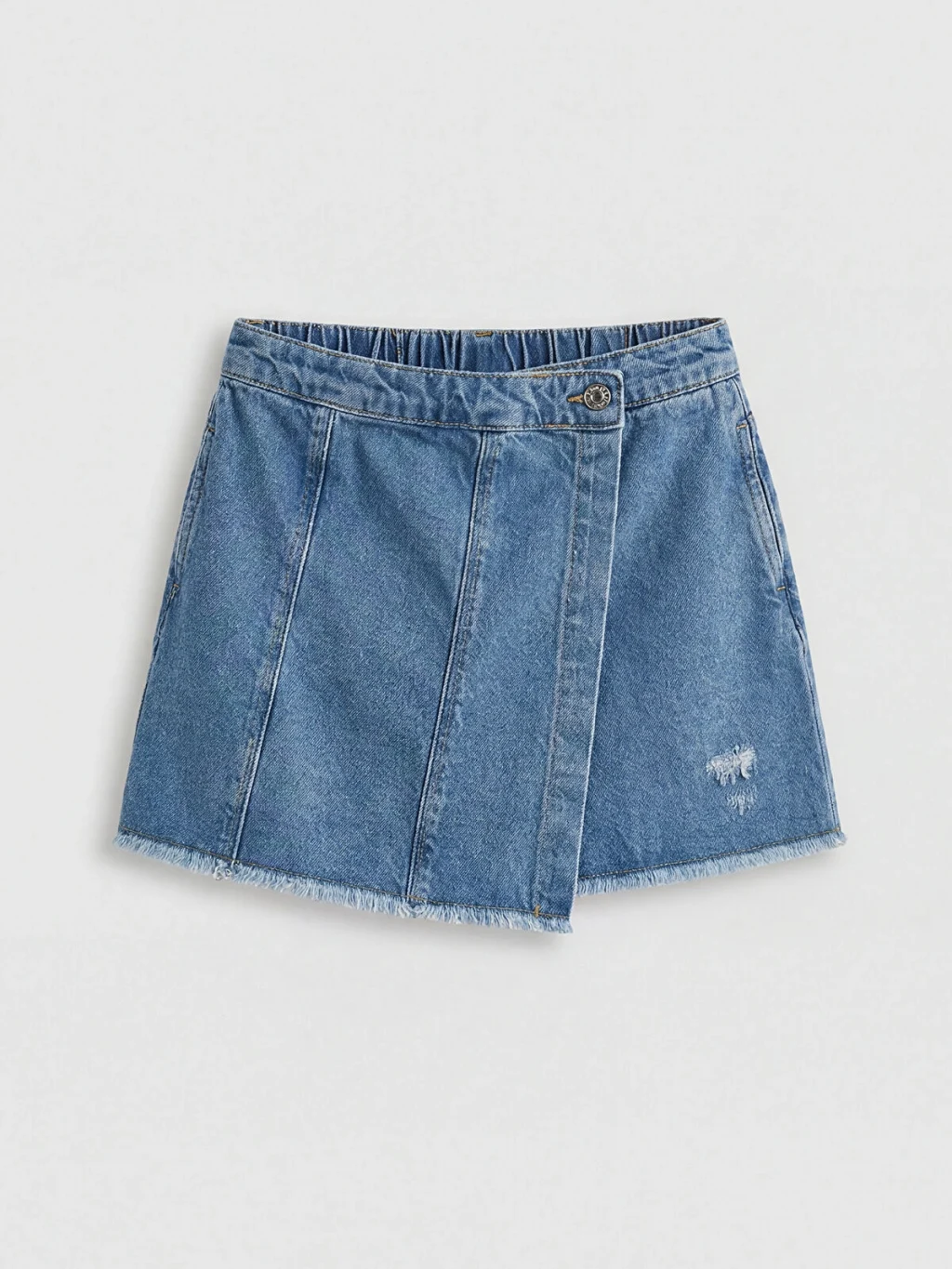 Anvelop kesimli kız çocuk etek, %100 pamuklu denim kumaştan üretilmiştir. Beli lastikli, düğme kapamalı ve paça ucu püsküllü tasarıma sahiptir.