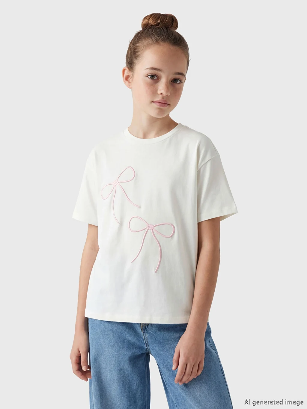 Bol kalıplı kız çocuk tişört, bisiklet yakalı ve kısa kolludur. Penye kumaştan üretilen tişört, nakış detaylarına sahiptir.