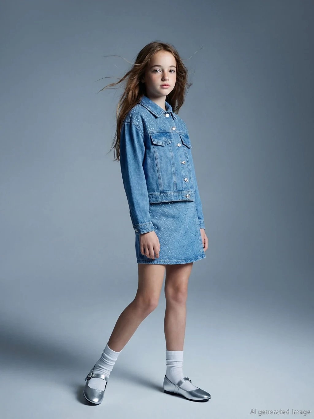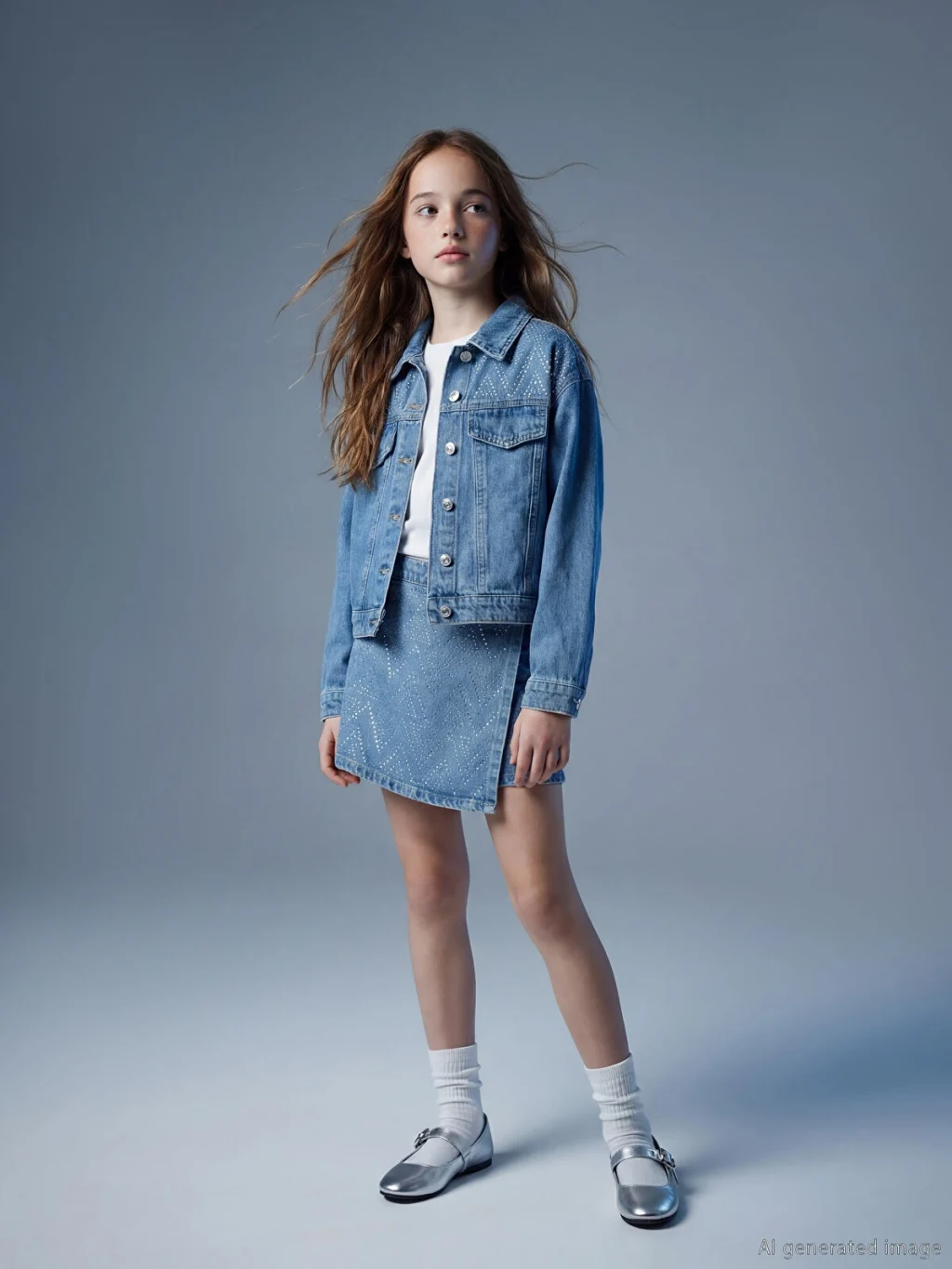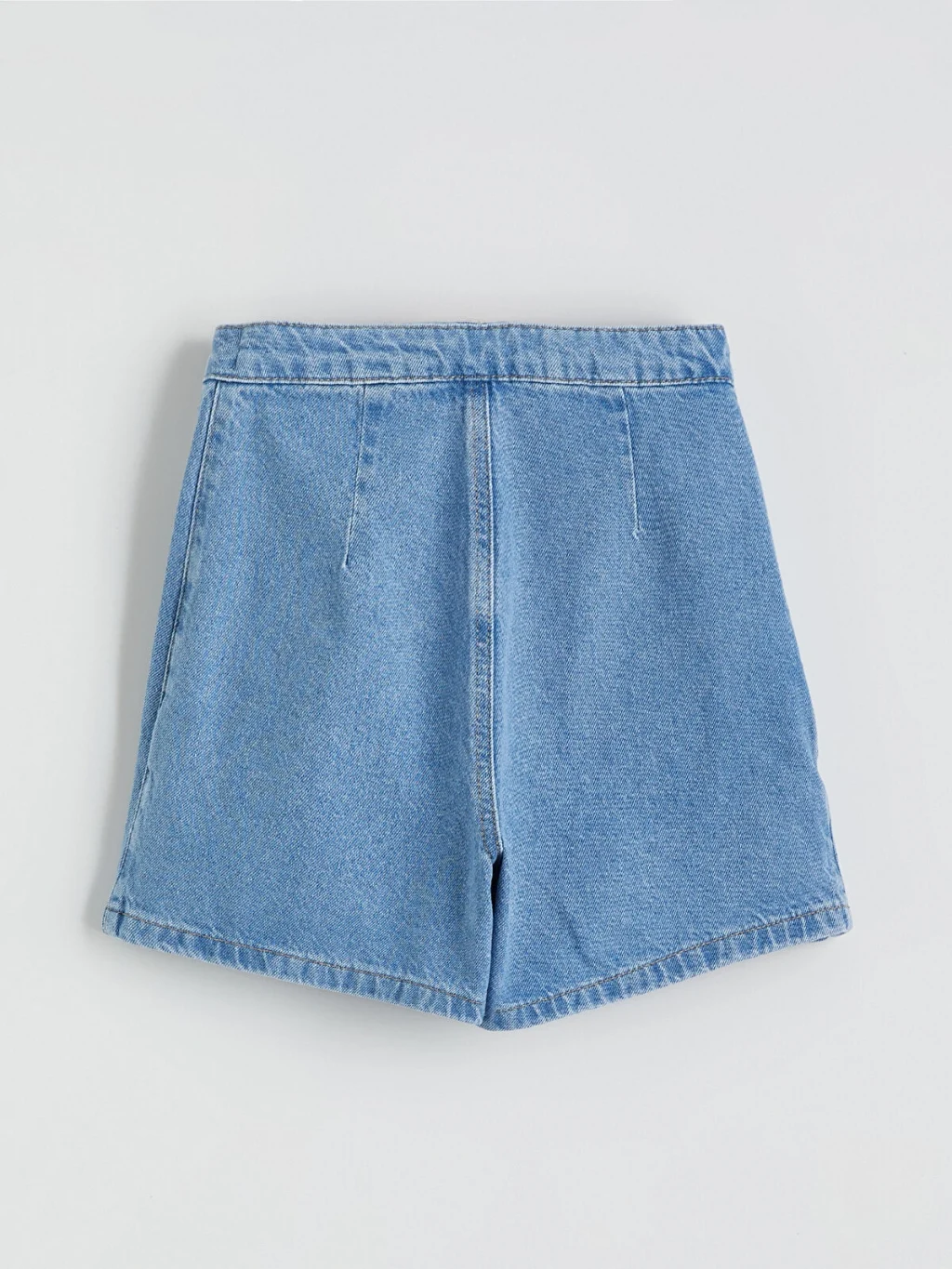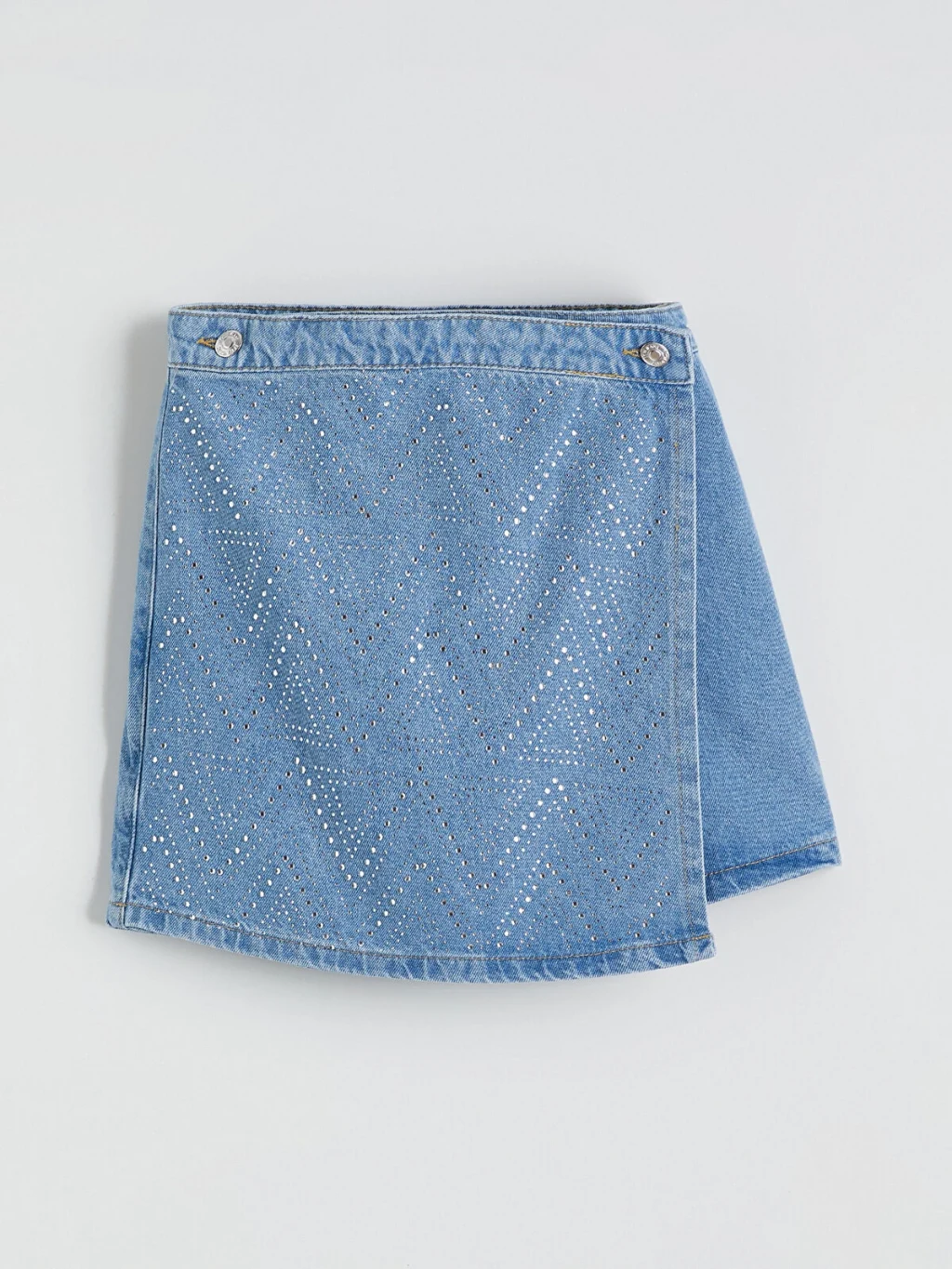 Kız çocuk şort etek, denim kumaştan üretilmiştir. Düğme kapamalı ve taş baskılı tasarıma sahiptir.
