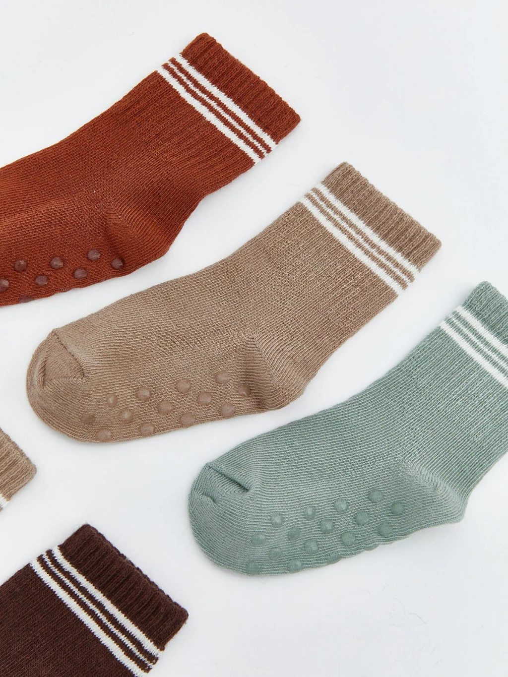 Erkek bebek için 5'li soket çorap seti. Ribanalı ve çizgili tasarıma sahiptir. Kaydırmaz tabanlıdır.