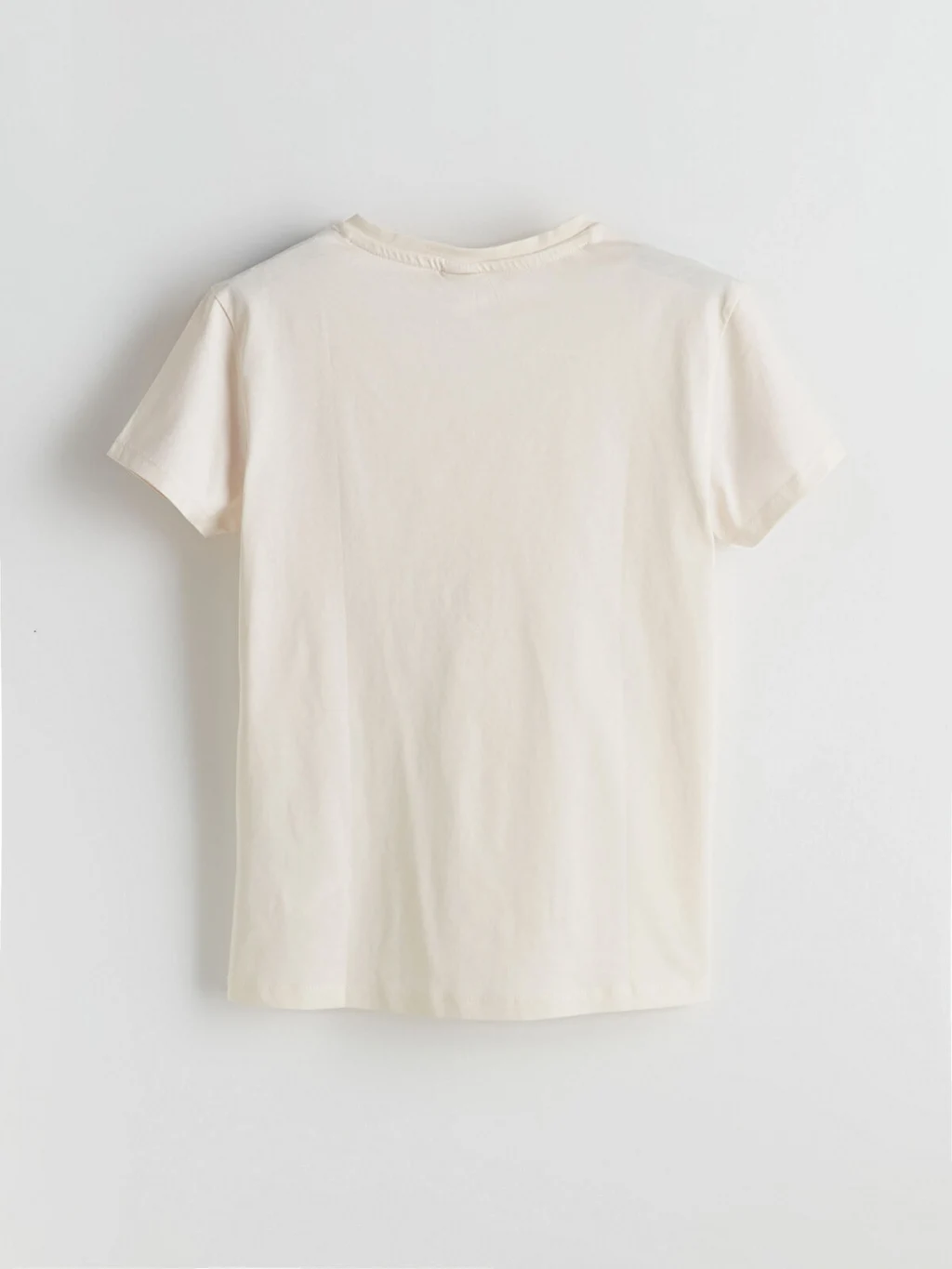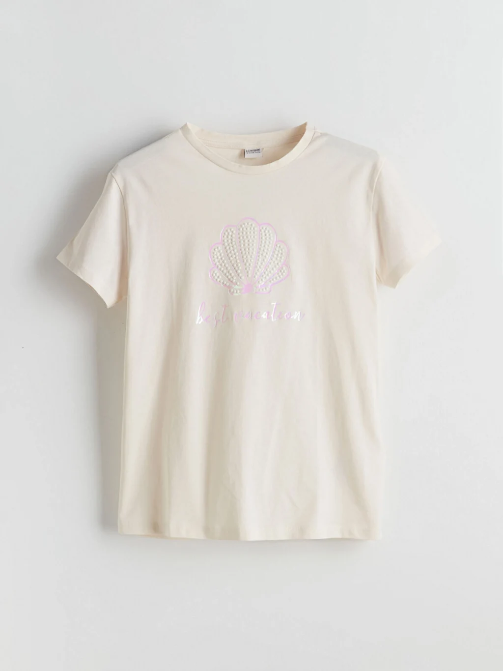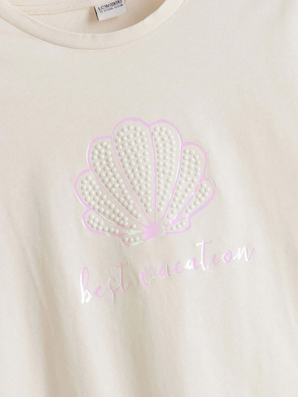 Kız çocuk tişört, %100 pamuklu penye kumaştan üretilmiştir. Bisiklet yaka, kısa kollu ve önü deniz kabuğu baskılıdır.
