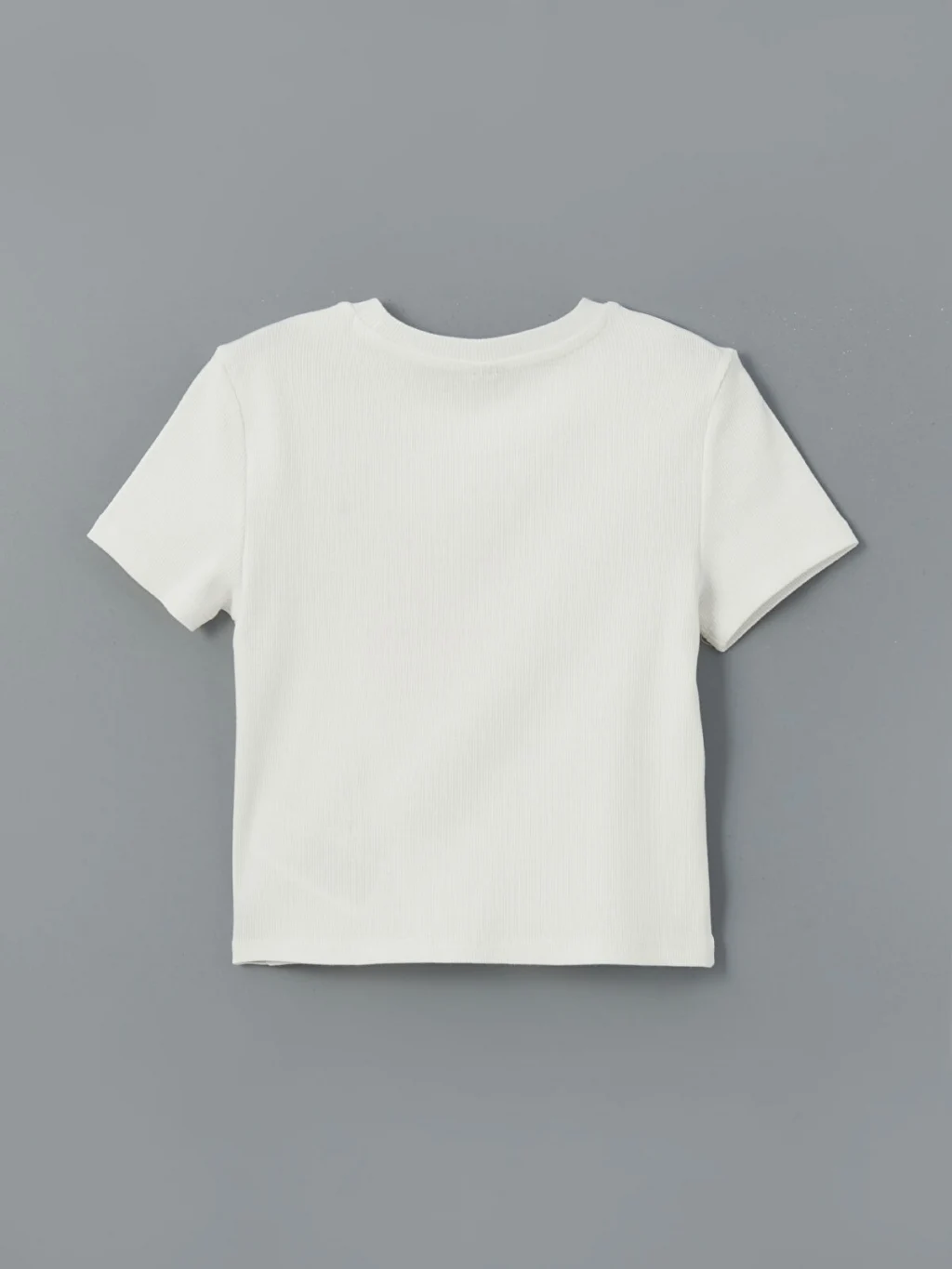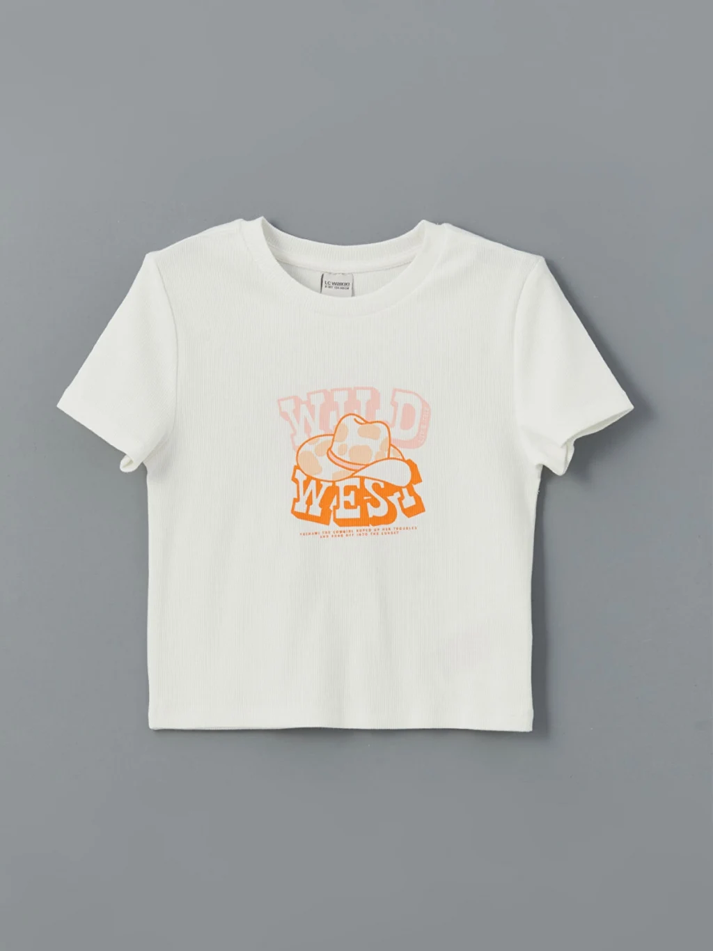 Yüksek pamuk içerikli kaşkorse kumaştan üretilmiş, dar kalıp kız çocuk tişört, bisiklet yaka ve kısa kolludur. Önü baskılıdır.