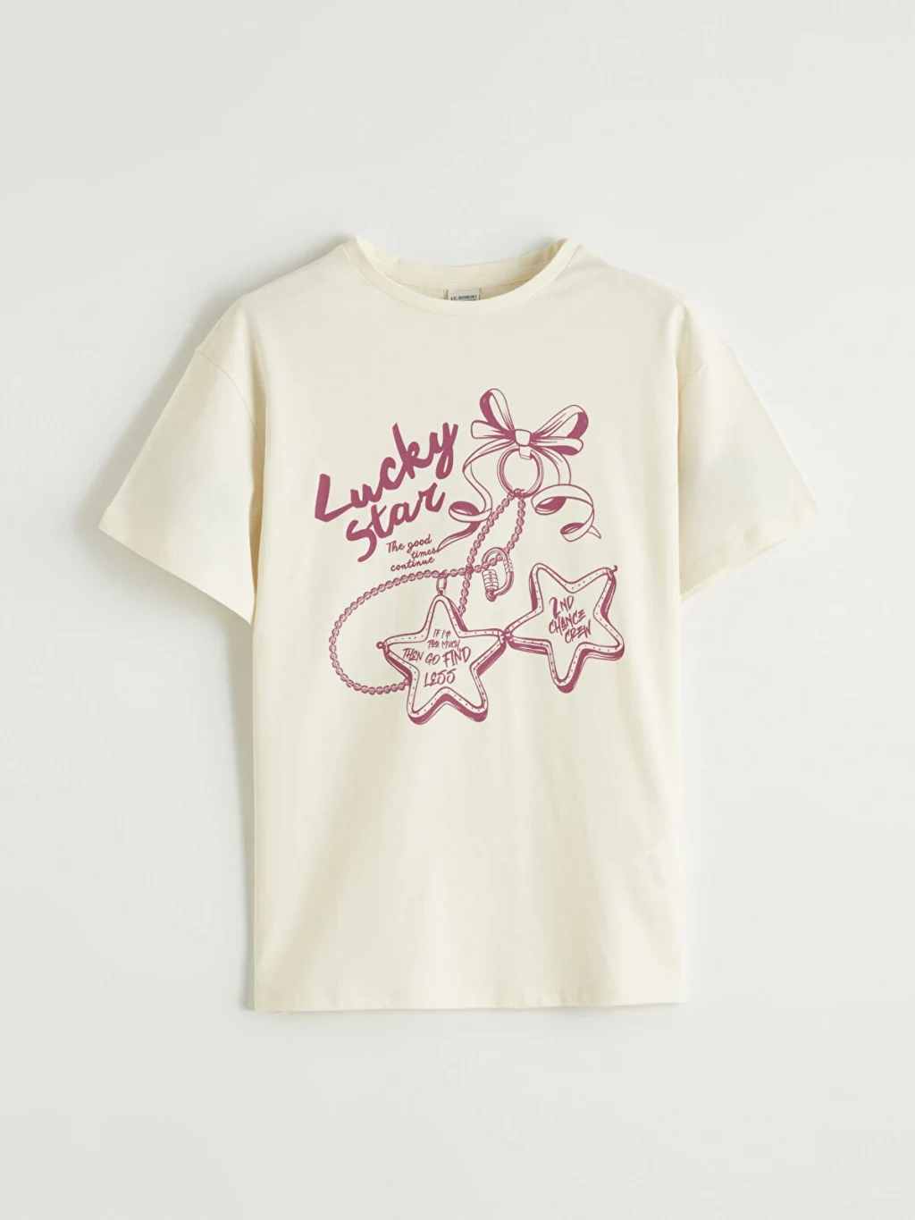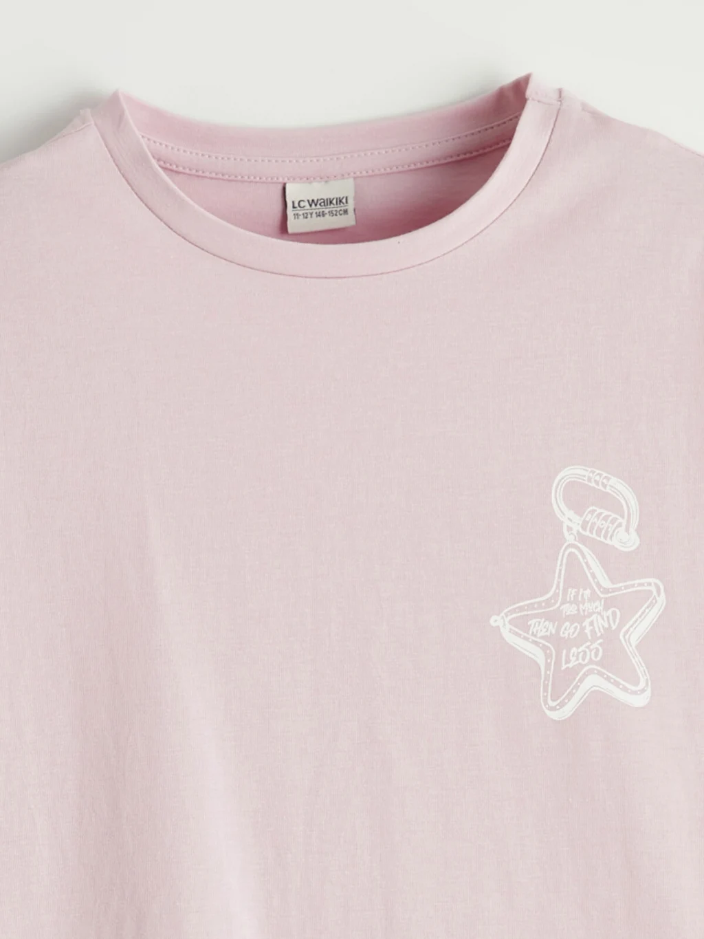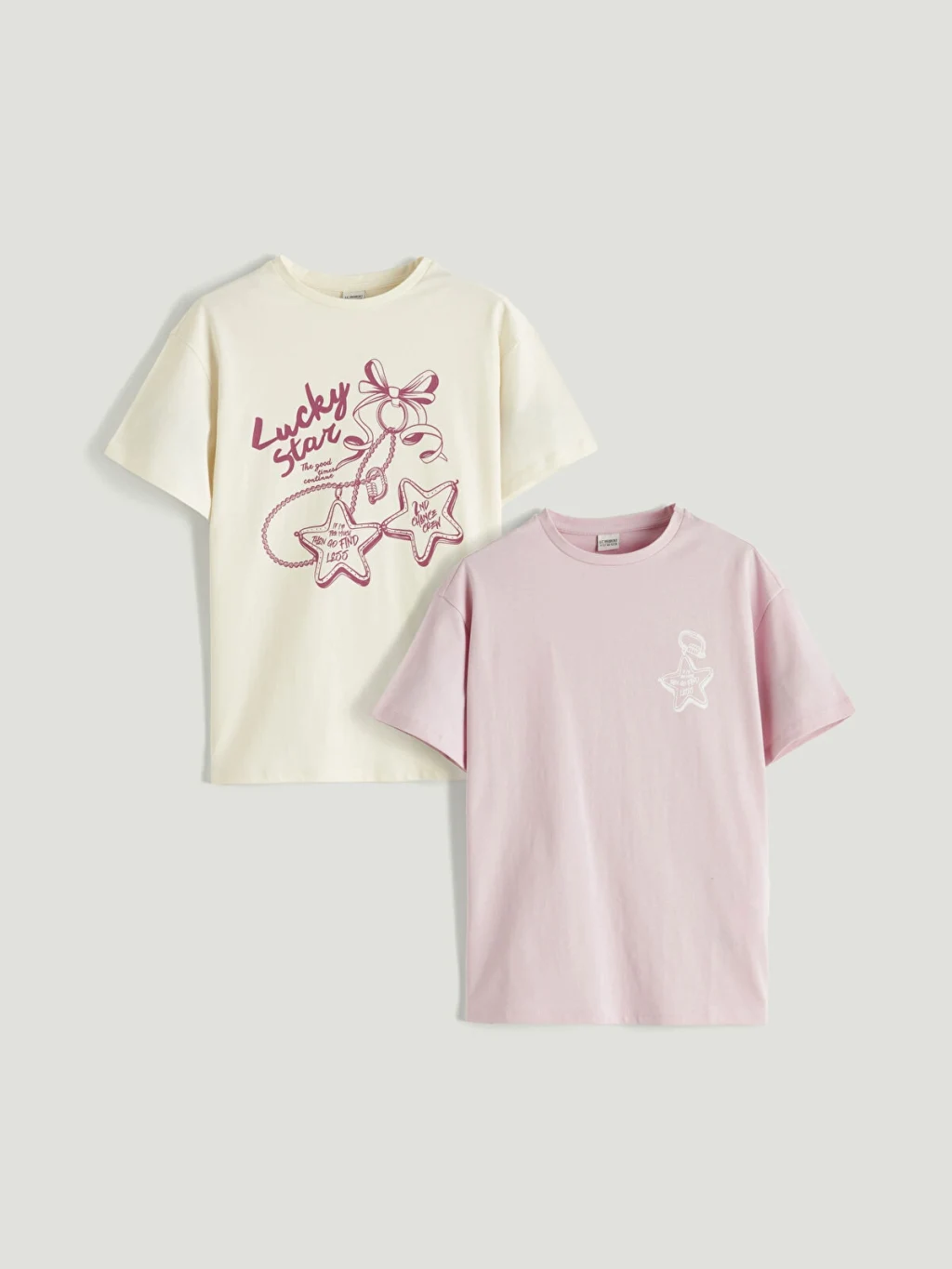 Kız çocuk 2'li tişört seti, %100 pamuklu penye kumaştan üretilmiştir. Bisiklet yaka ve kısa kollu tişörtlerden biri baskılı, diğeri nakışlıdır.