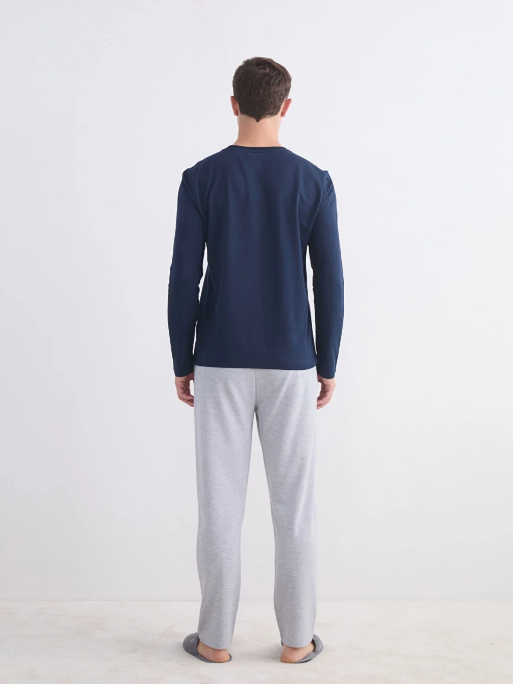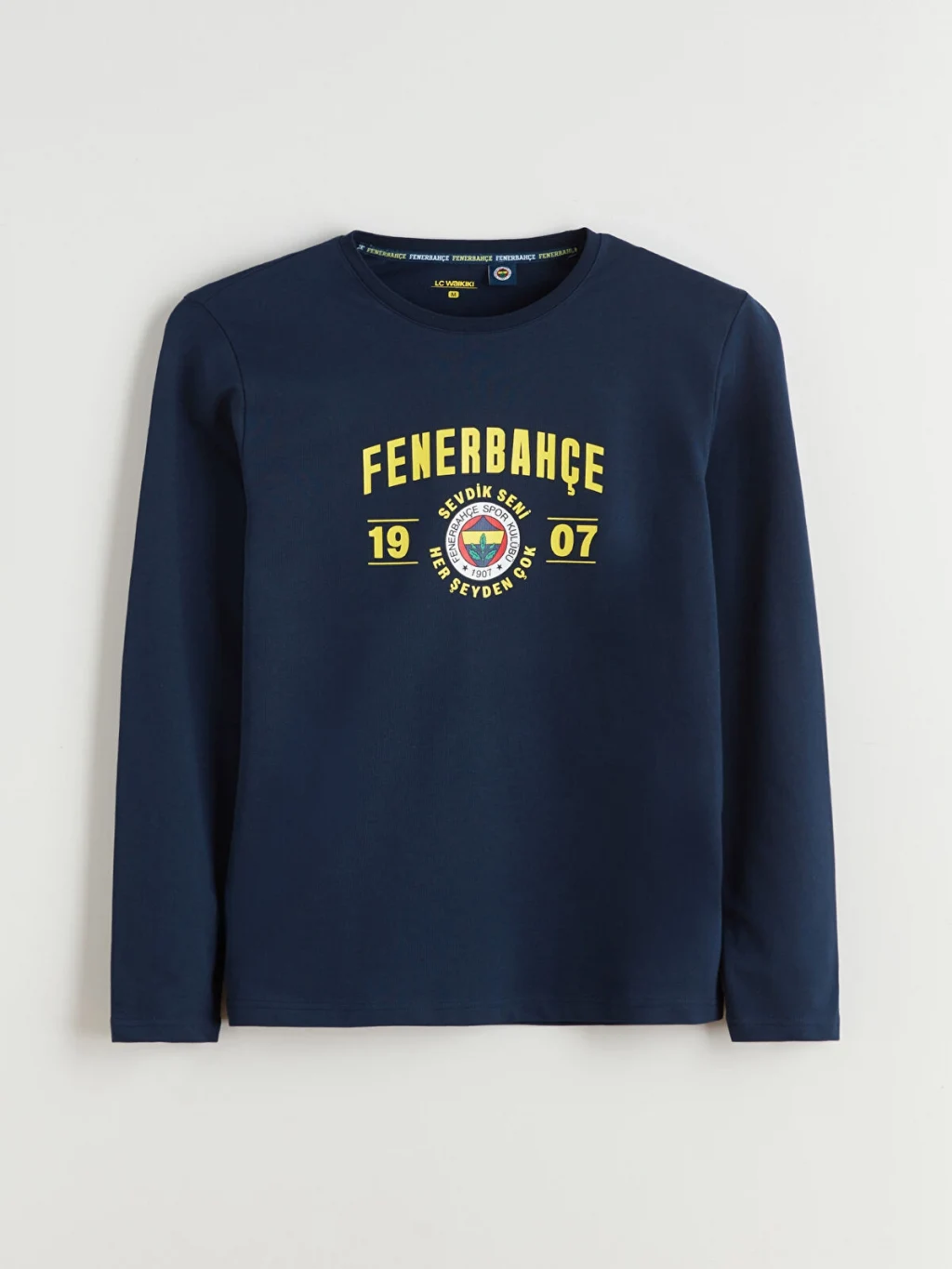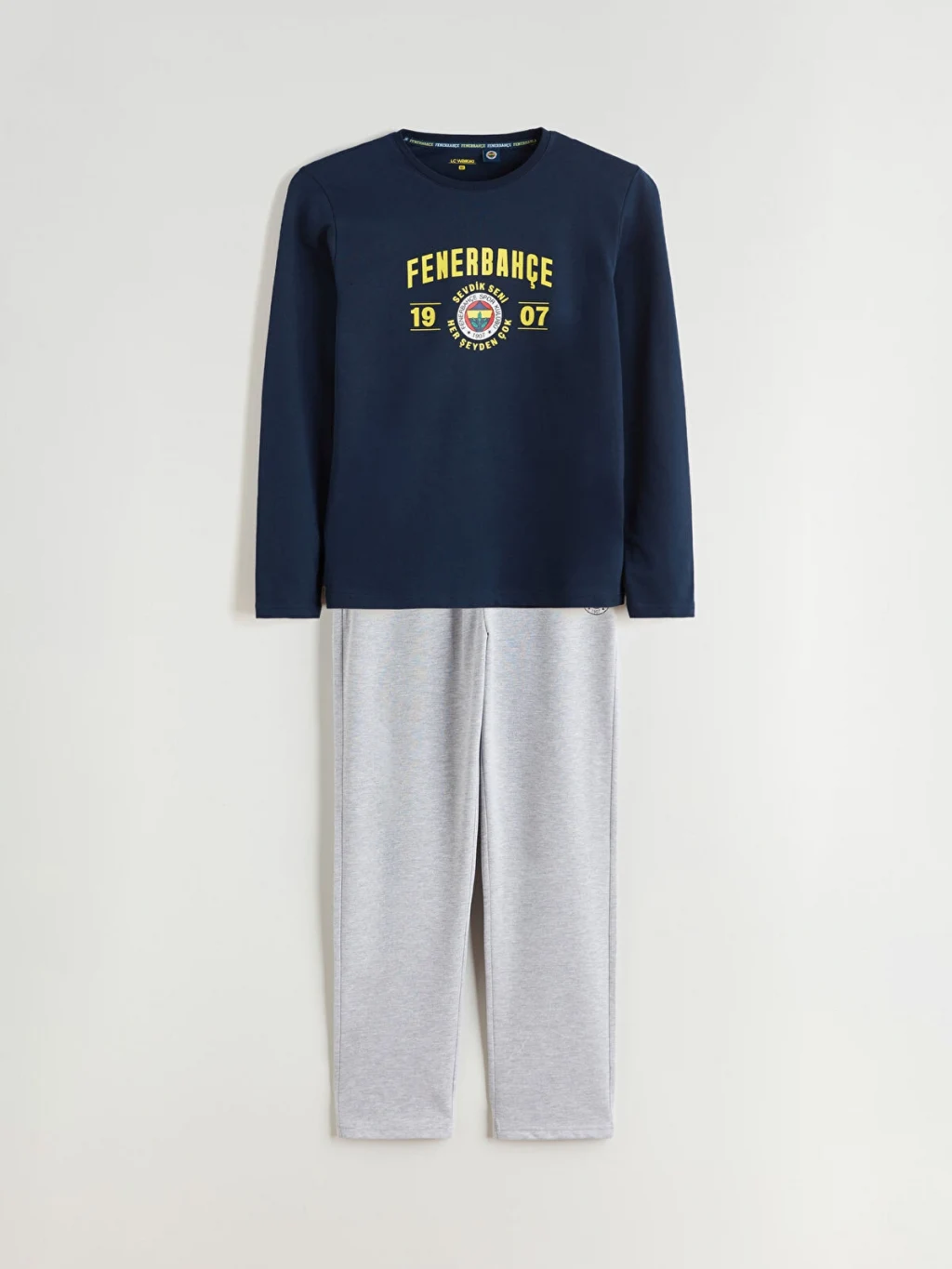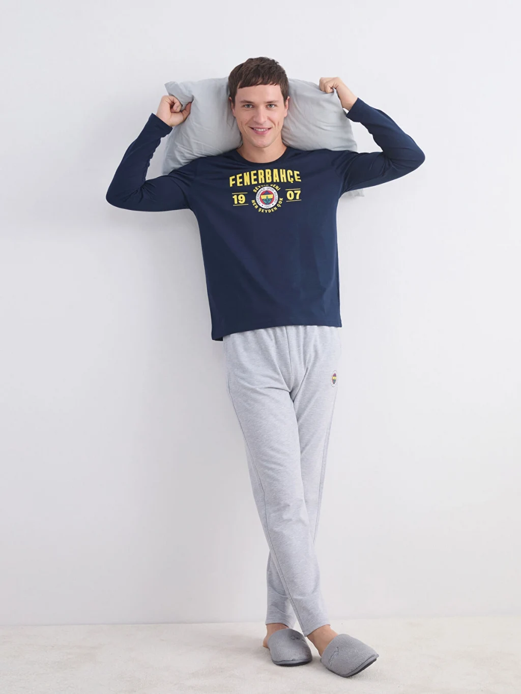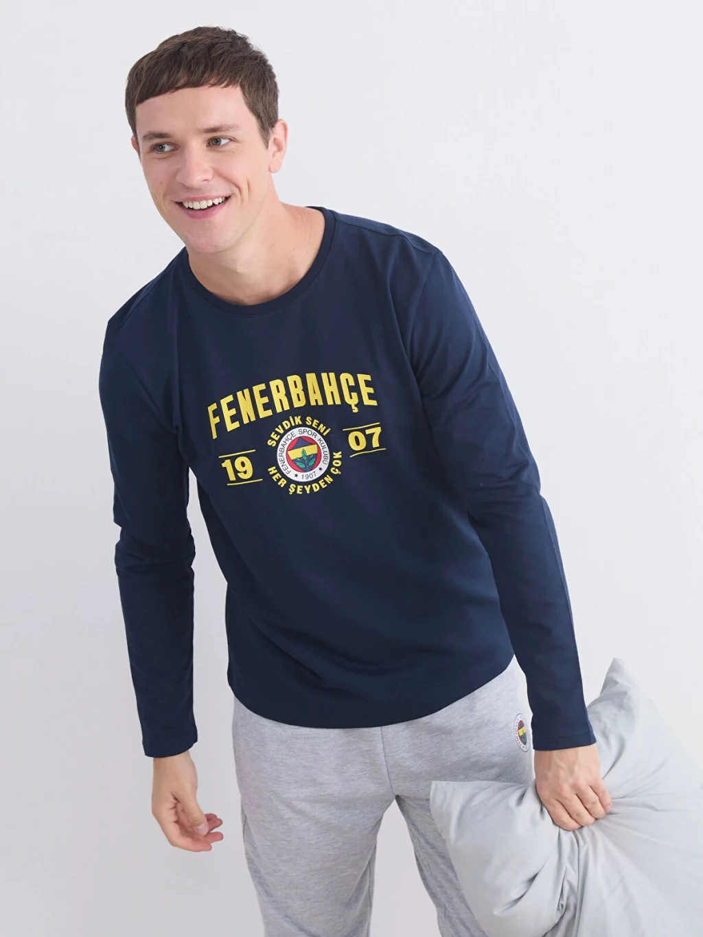 Fenerbahçe lisanslı erkek pijama takımı, bisiklet yaka ve uzun kollu baskılı bir üst ile pijama altından oluşur. %100 pamuklu 2 iplik kumaştır.