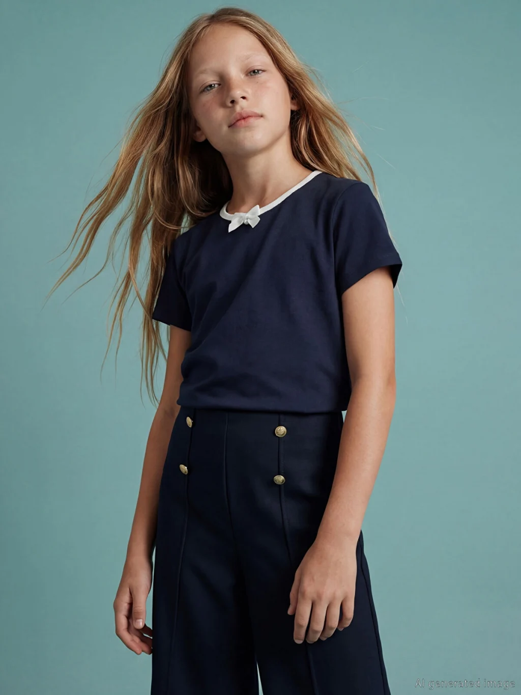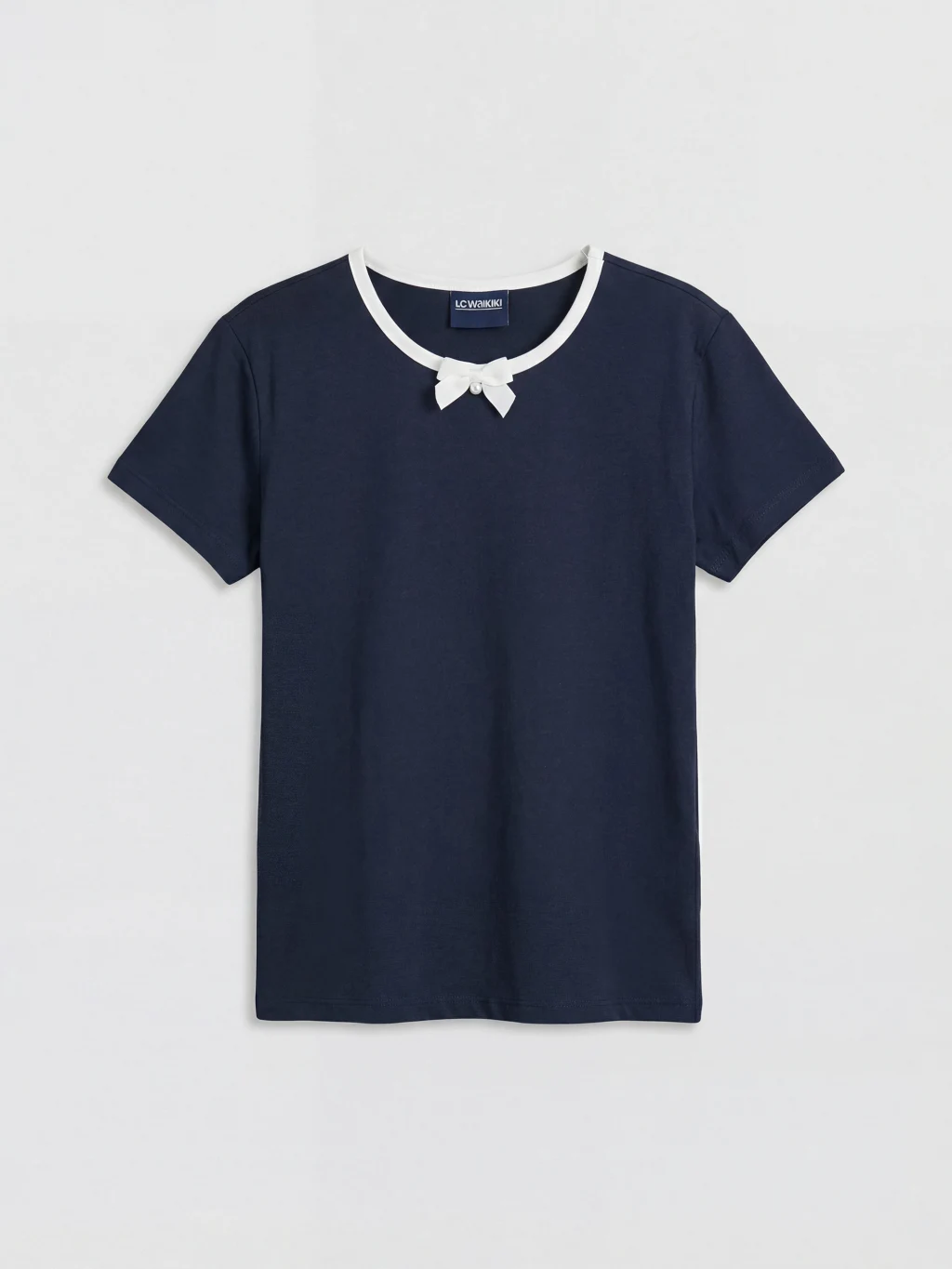 Kız çocuk tişört, %100 pamuklu penye kumaştan üretilmiştir. Bisiklet yakalı ve kısa kolludur. Yaka kısmında fiyonk detayı bulunur.