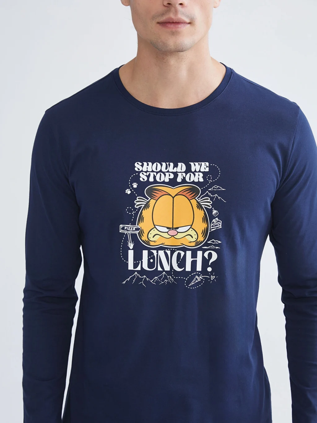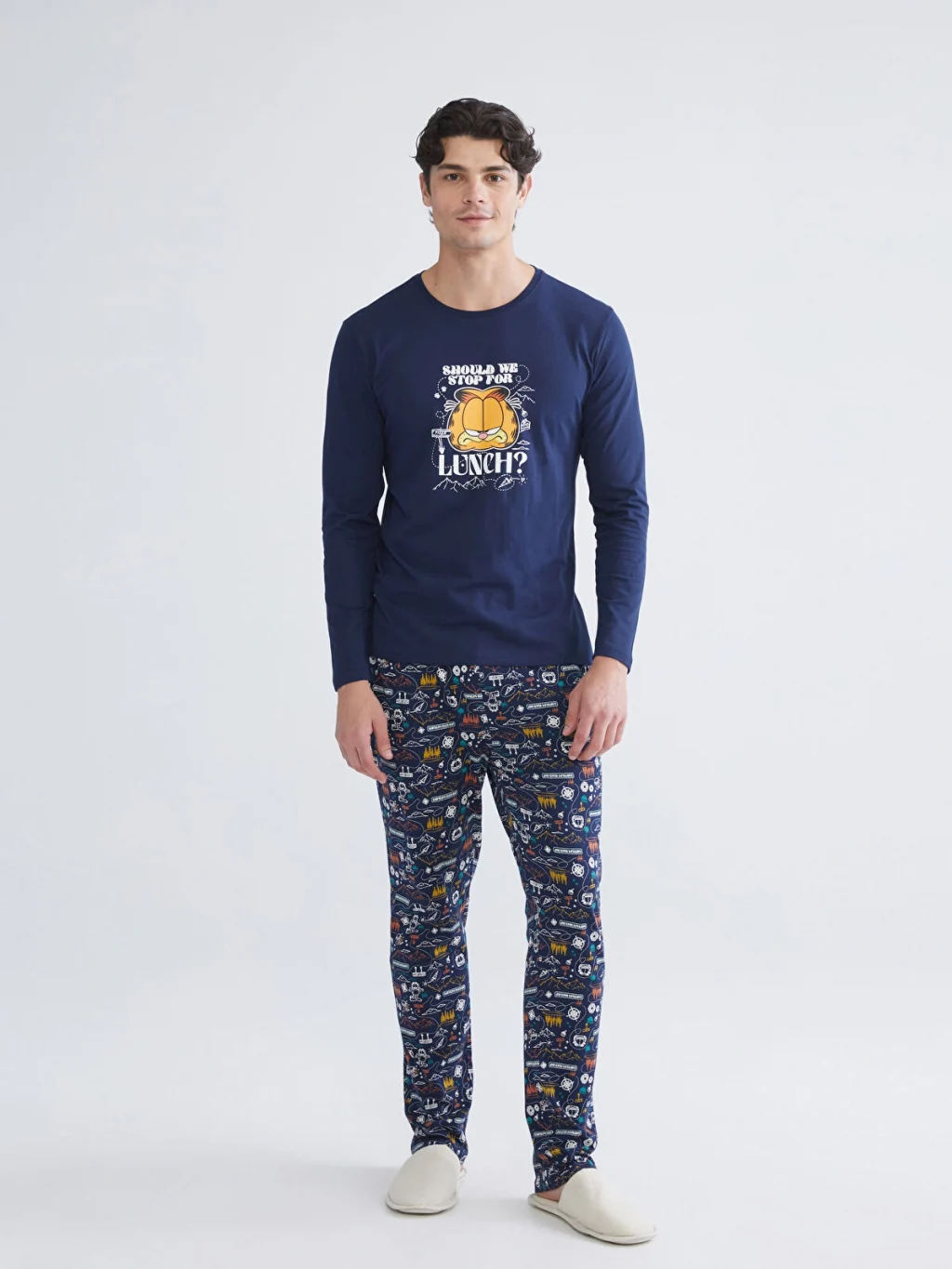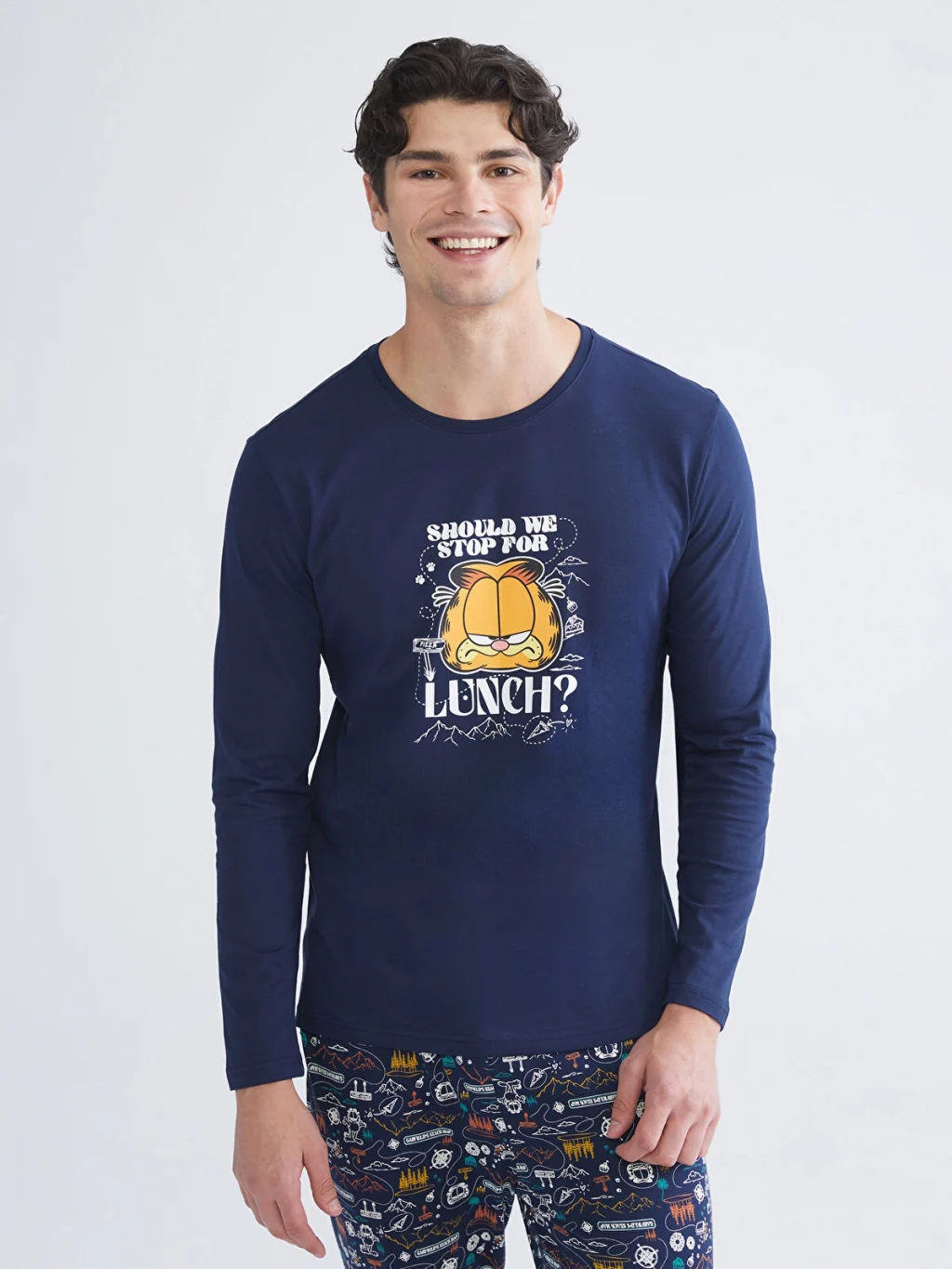 Penye kumaştan üretilen Garfield lisanslı erkek pijama takımı, bisiklet yaka, uzun kollu, baskılı üst ve desenli alt parçadan oluşur.