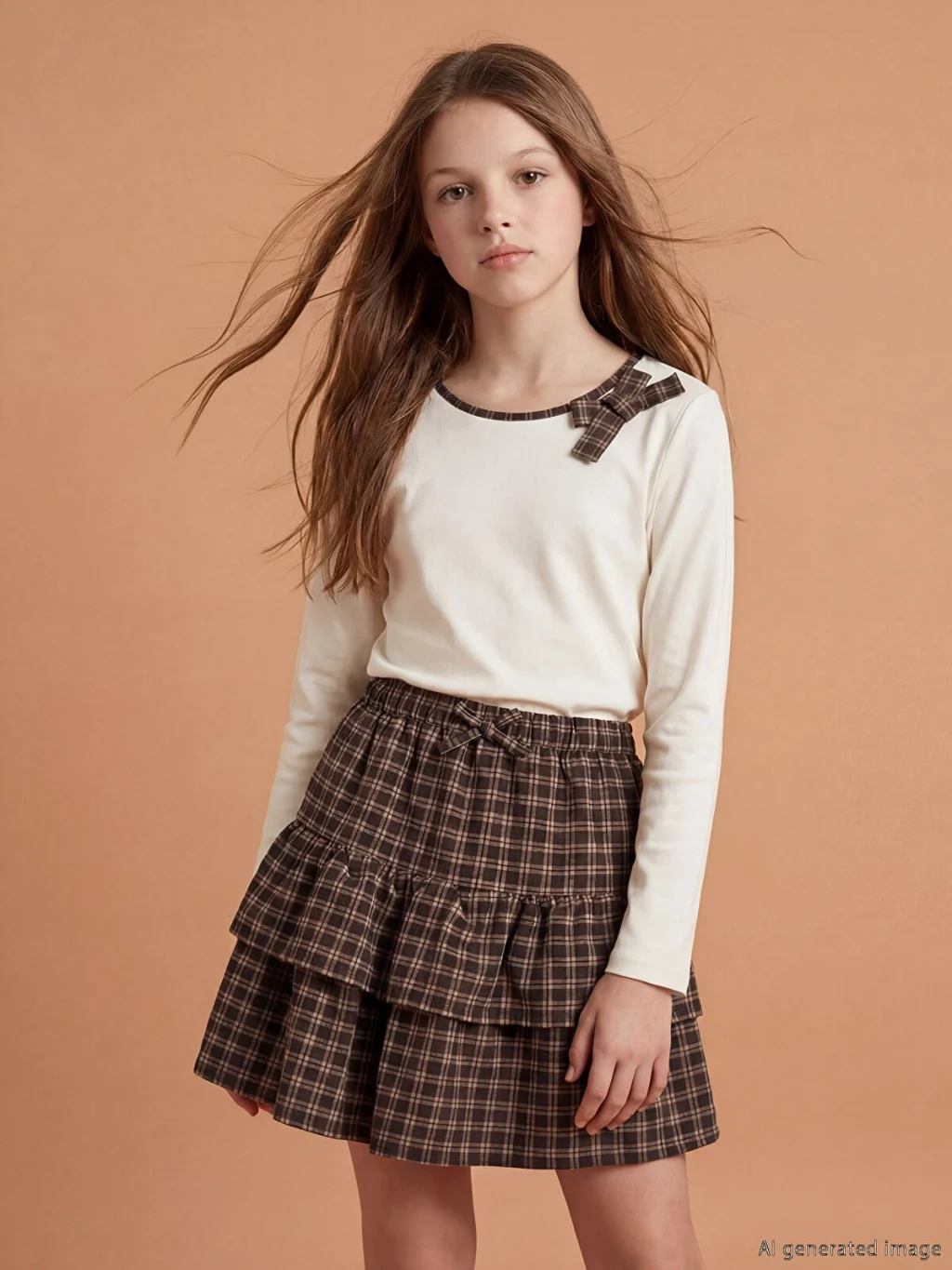 Geniş yaka ve uzun kollu kız çocuk tişört, penye kumaştan üretilmiştir. Yaka kısmı desenli biye detaylıdır ve omuzda fiyonk detayı bulunur.