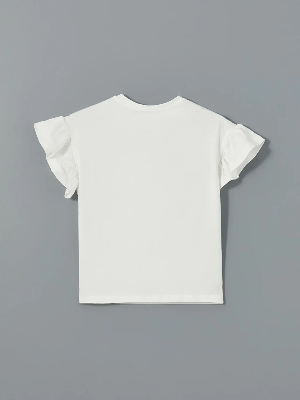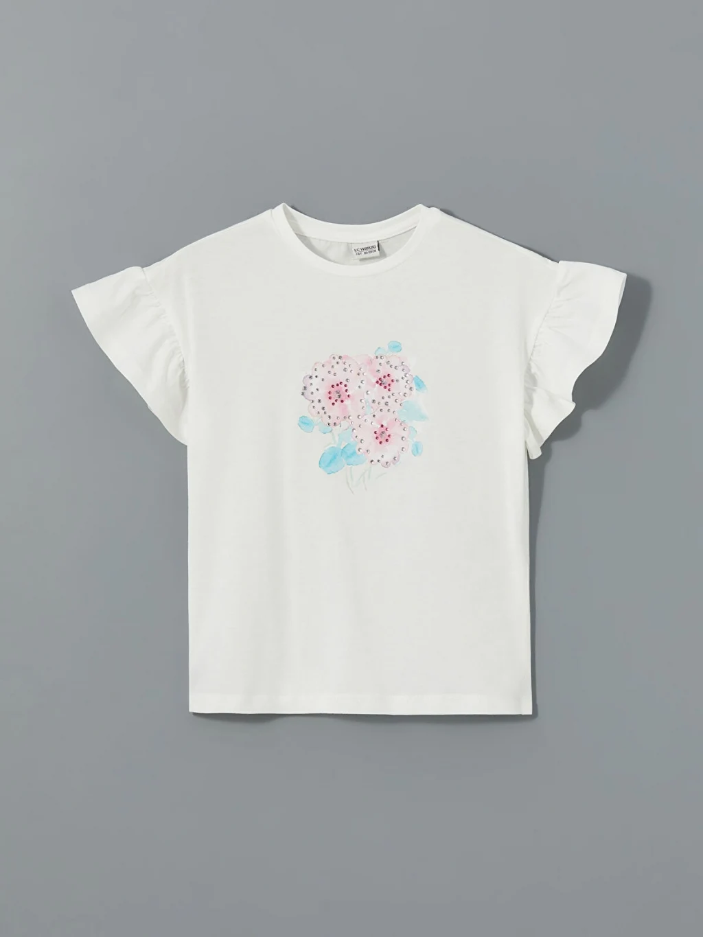 Bol kalıplı kız çocuk tişört, bisiklet yakalı ve kısa, fırfırlı kolludur. %100 pamuklu penye kumaştan üretilen tişörtün önü çiçek desenlidir.