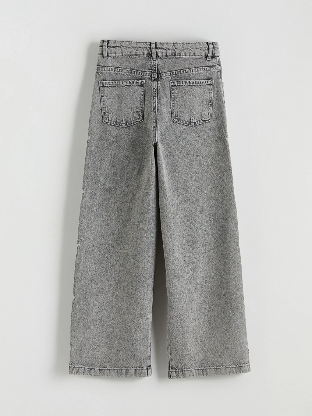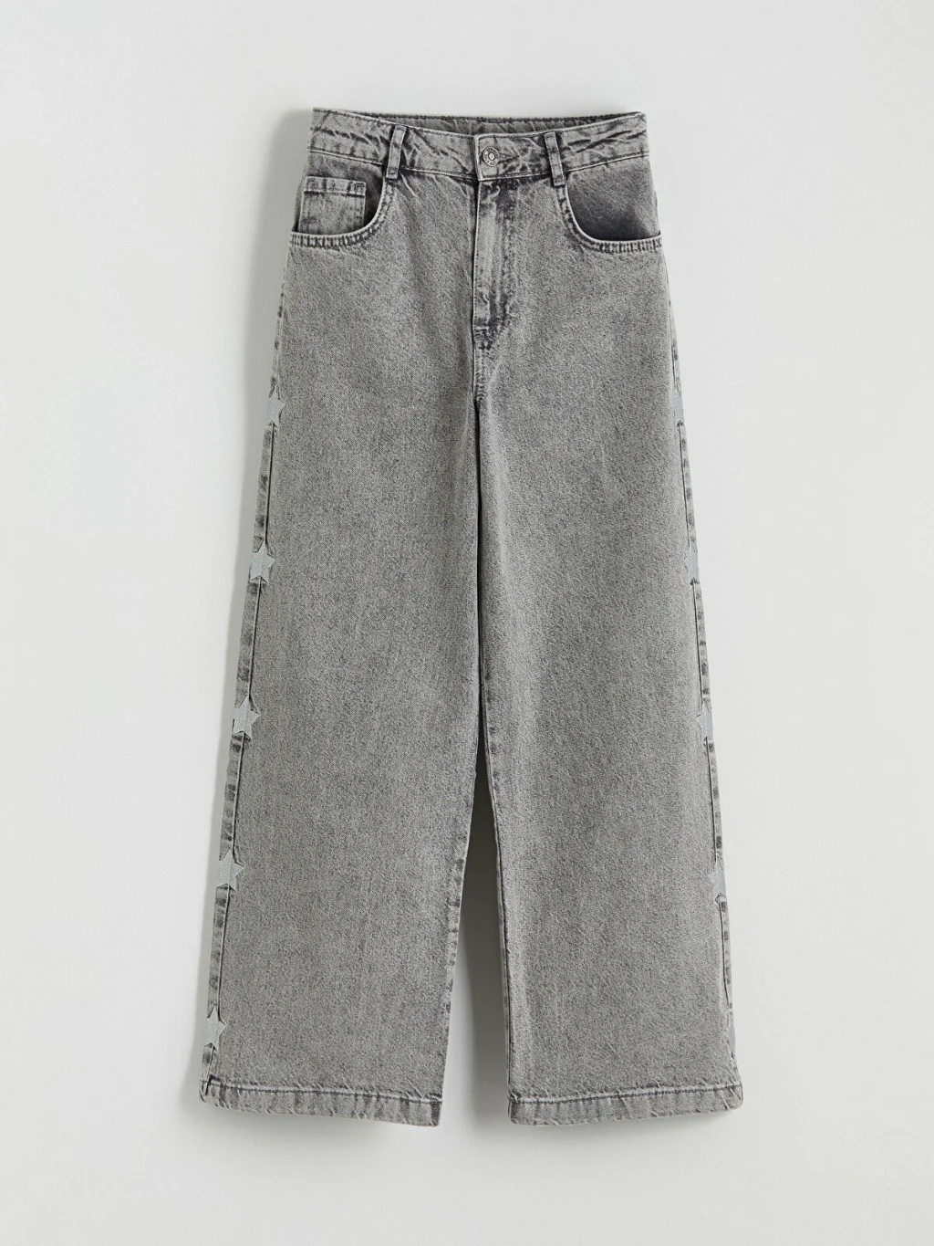Geniş paçalı ve yanları yıldız desenli kız çocuk jean pantolon, %100 pamuklu denim kumaştan üretilmiştir. Beş cepli olup, fermuar ve düğme kapamalıdır.