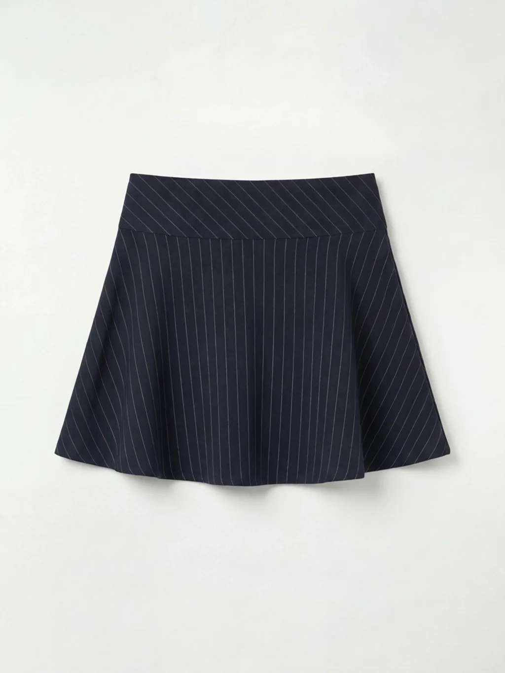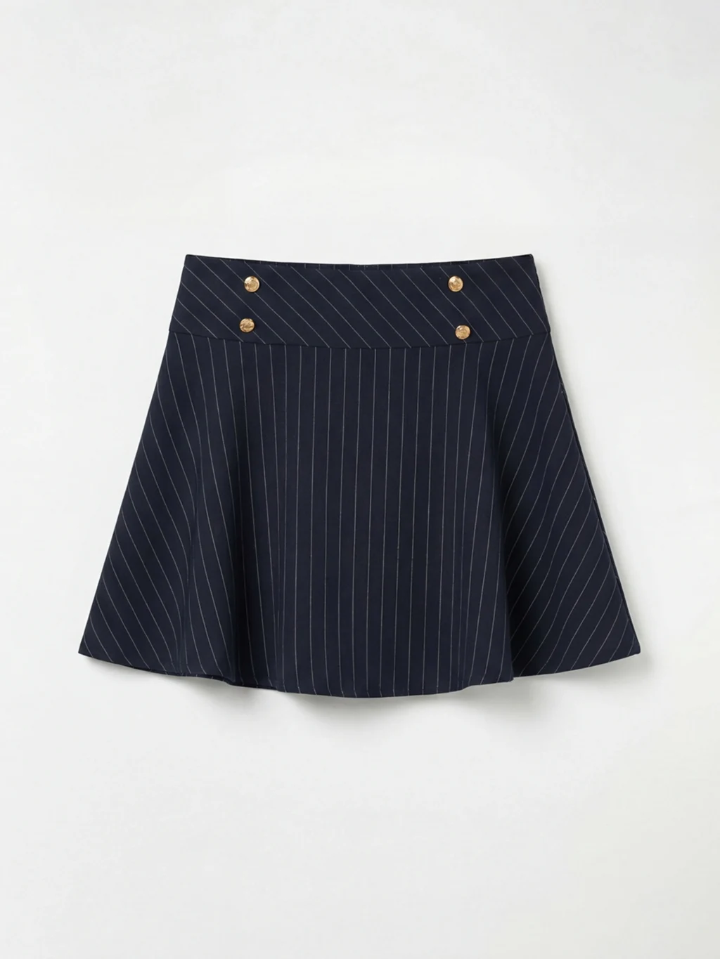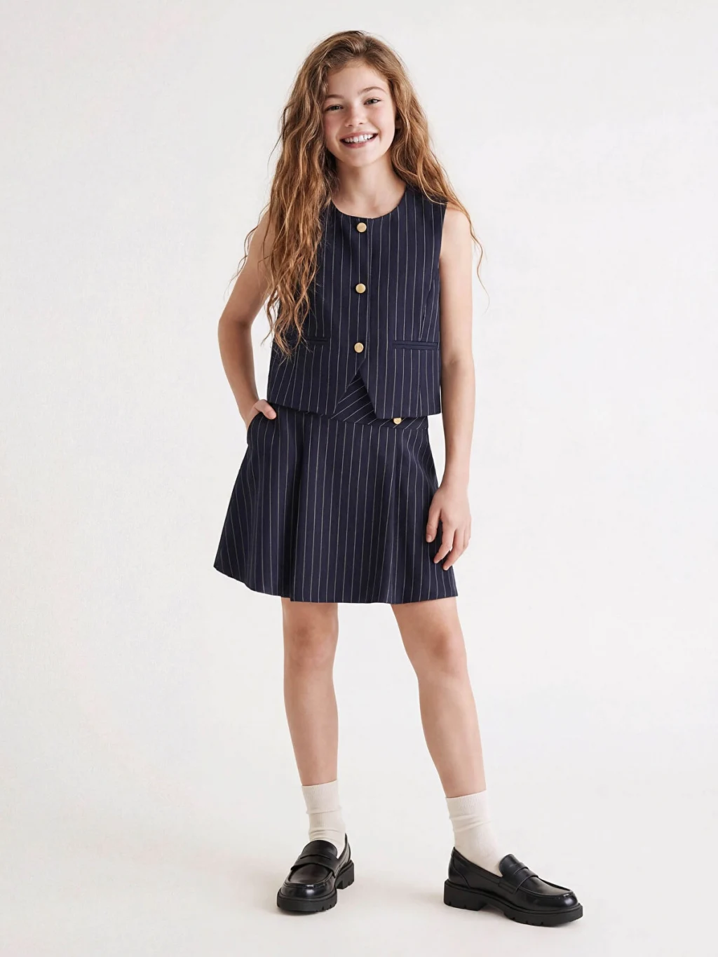 Kız çocuk etek, çizgili desenli poliviskon kumaştan üretilmiştir. Diz üstü boydaki etek, belinde düğme detayına sahiptir ve astarsızdır.