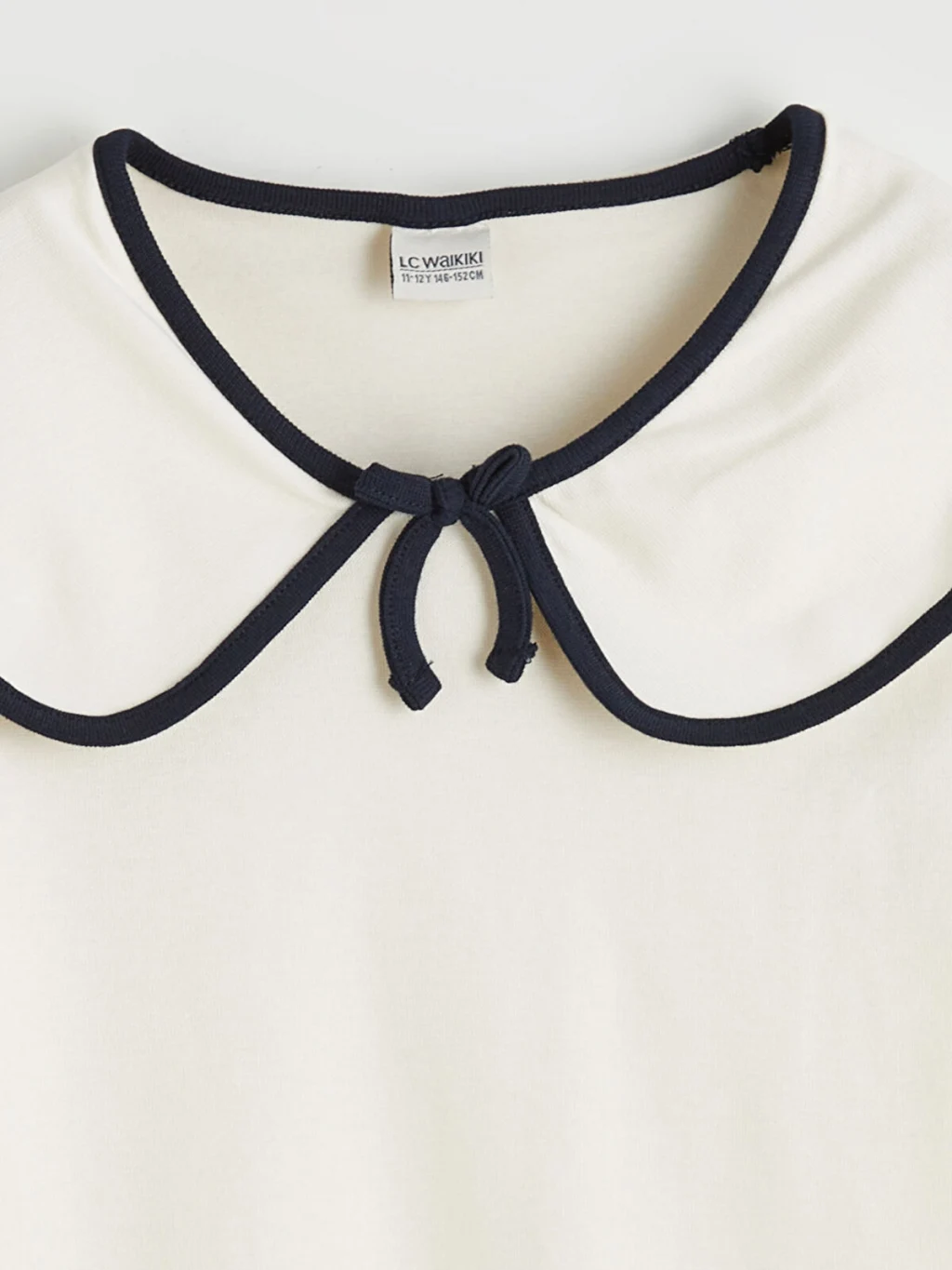 Kız çocuk uzun kollu tişört, bebe yakalı ve fiyonk detaylıdır. Ribana kumaştan üretilmiştir, kol ve etek uçları fırfırlıdır.