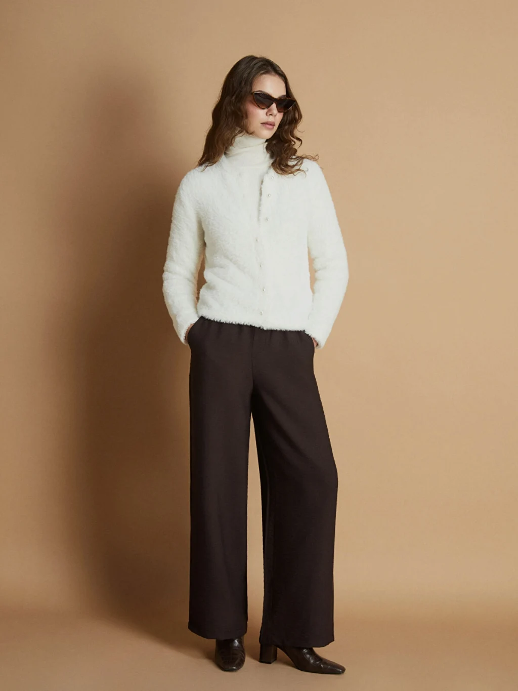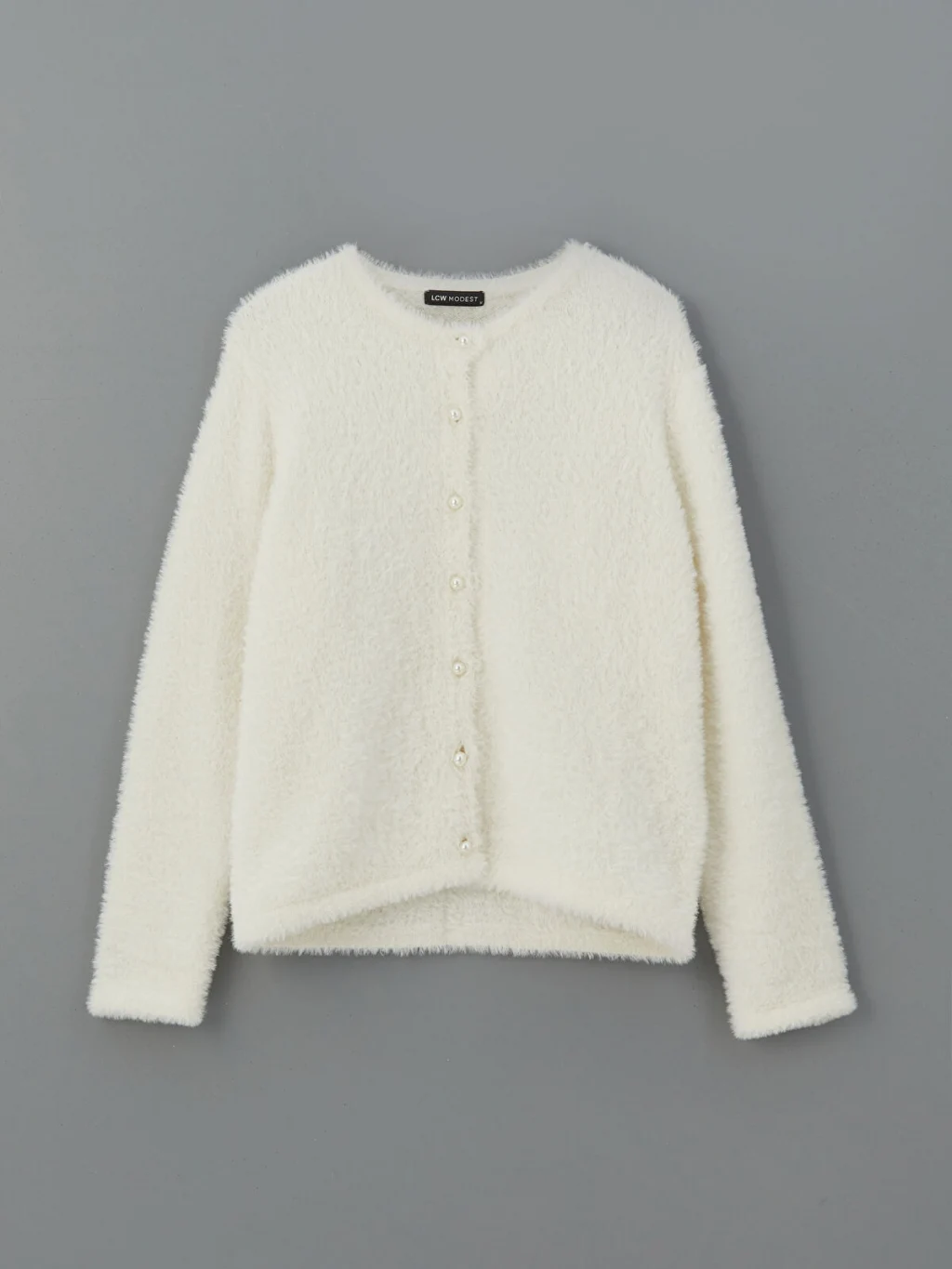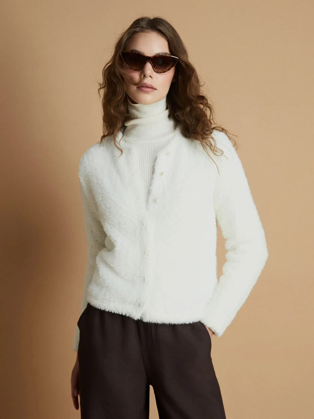 Bisiklet yaka, uzun kollu kadın hırka, tüylü dokulu kalın triko kumaştan üretilmiştir. Önü inci görünümlü düğmelerle kapanır.