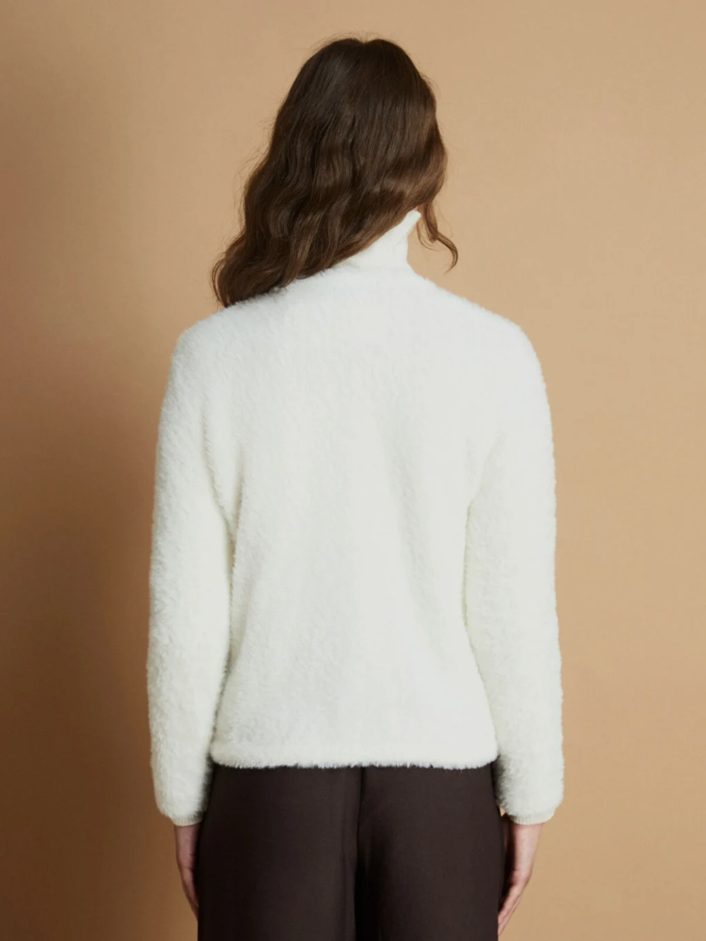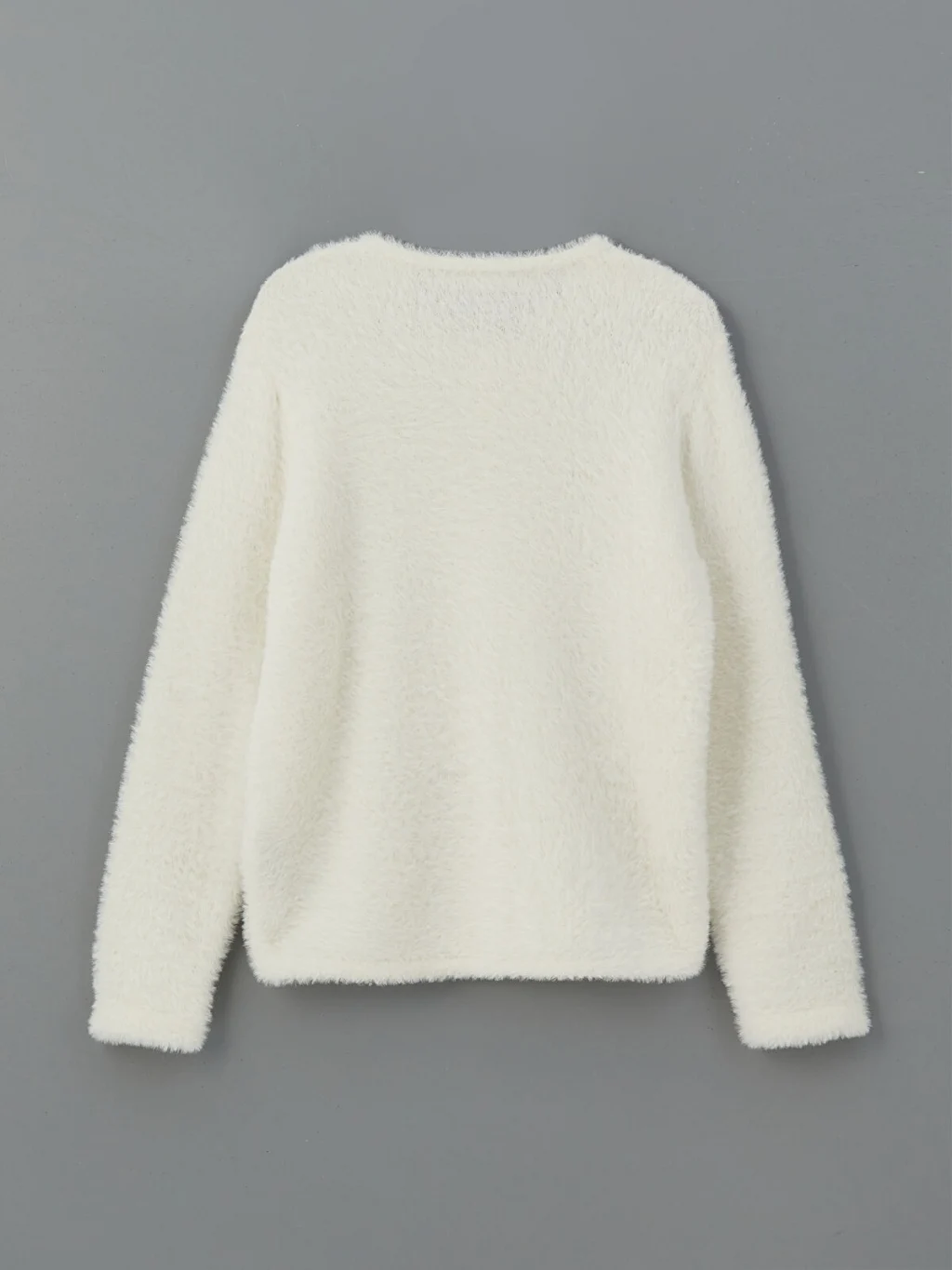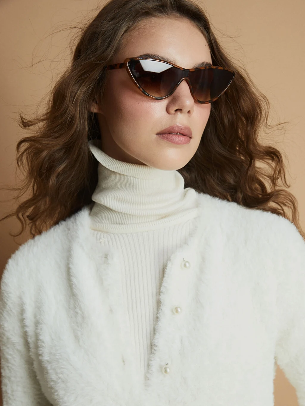 Bisiklet yaka, uzun kollu kadın hırka, tüylü dokulu kalın triko kumaştan üretilmiştir. Önü inci görünümlü düğmelerle kapanır.