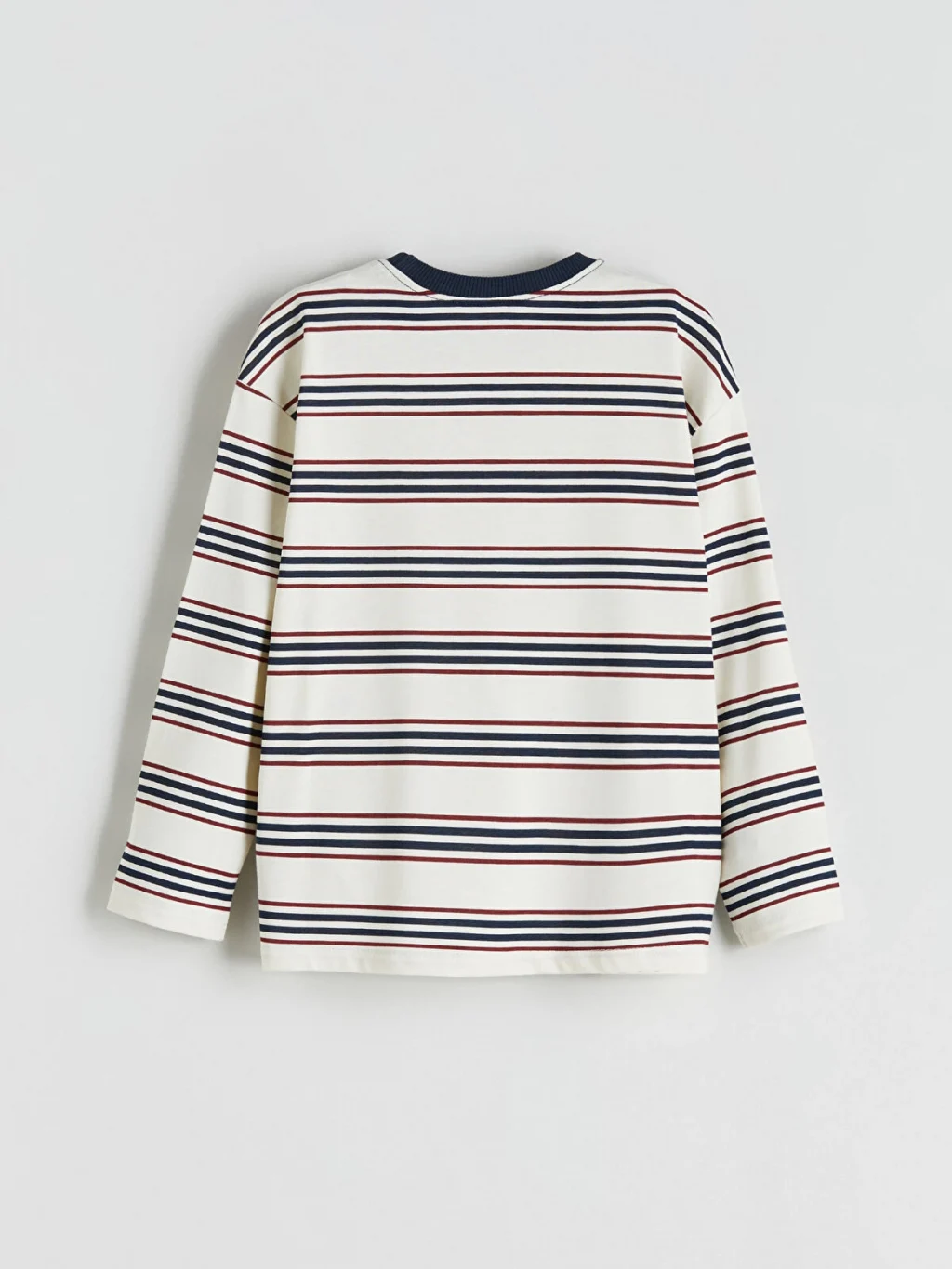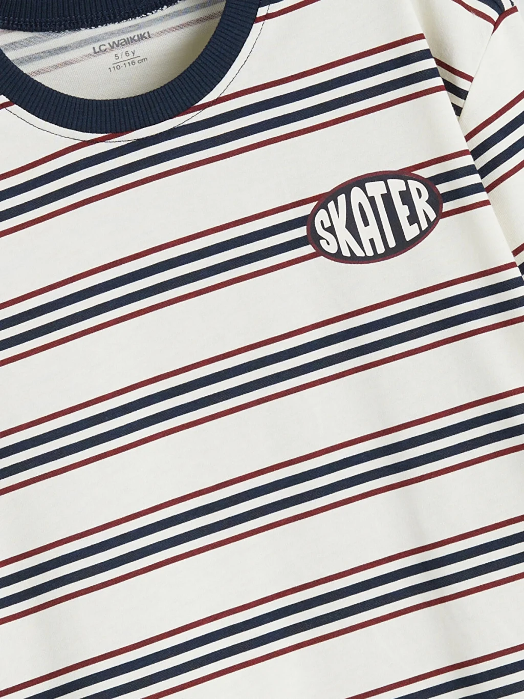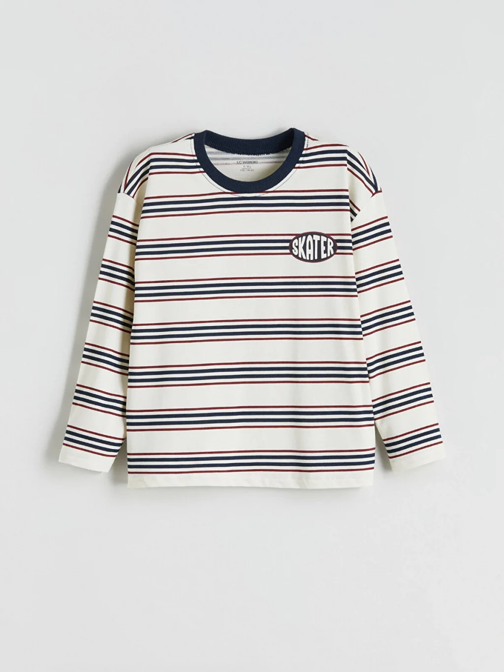 Bisiklet yakalı ve uzun kollu erkek çocuk tişört, çizgili desene ve göğüs kısmında yazı aplikeli bir detaya sahiptir.