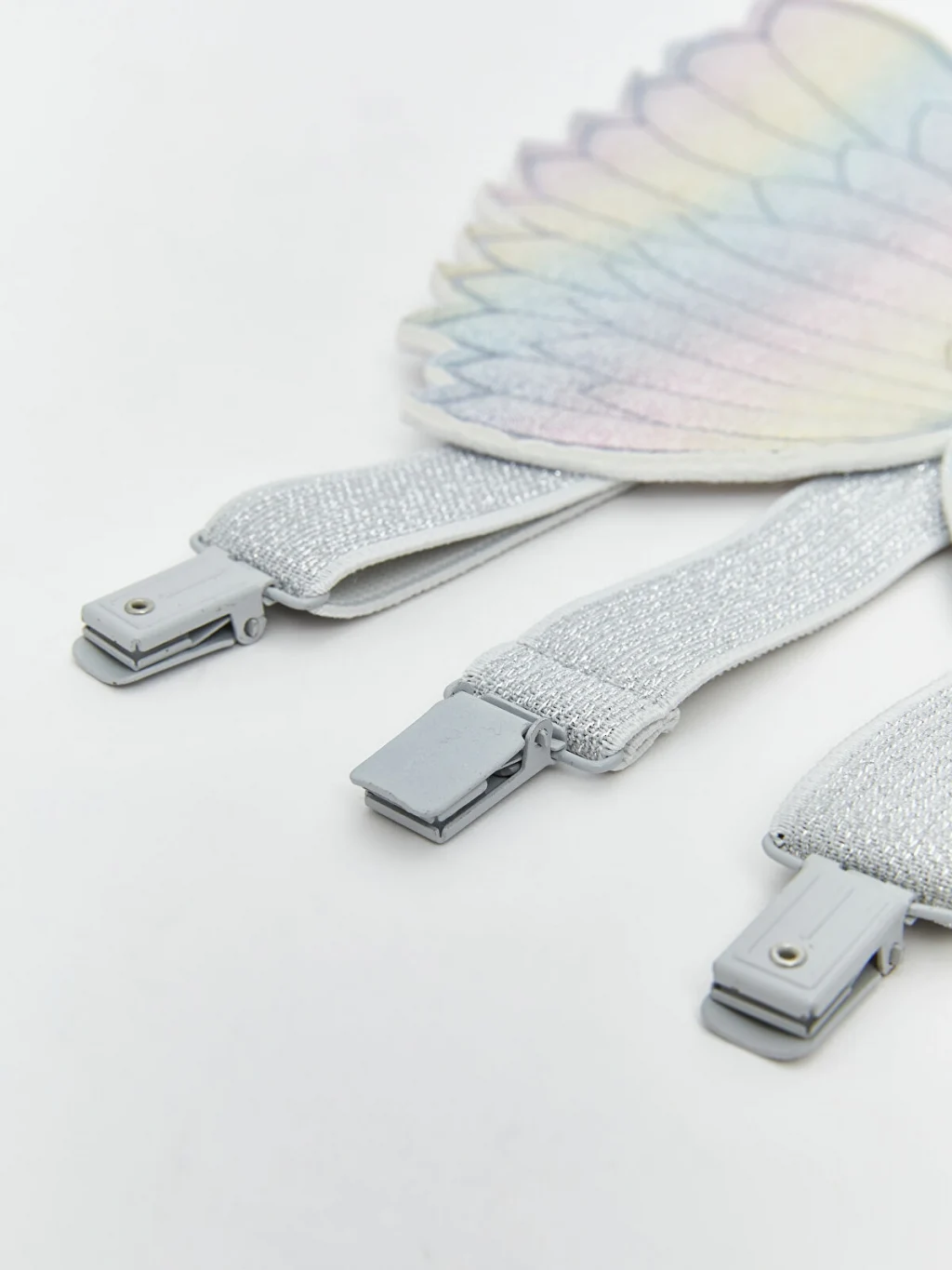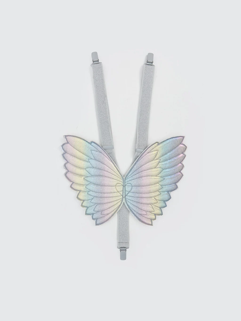 Arkası kanat aksesuarlı kız çocuk pantolon askısı, ayarlanabilir askılıdır ve metal klips kapamalara sahiptir.