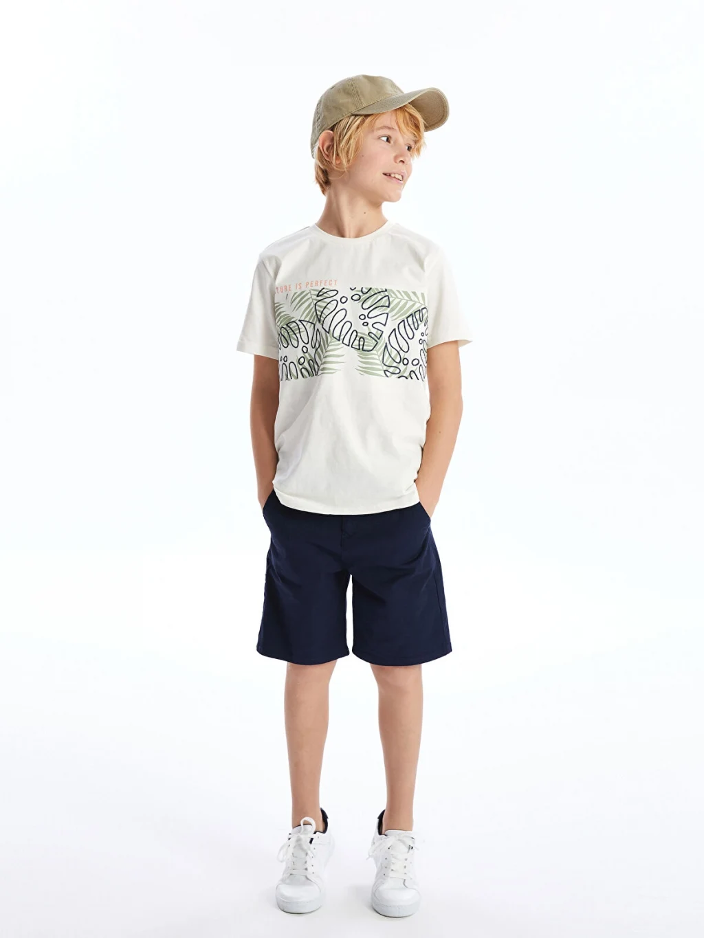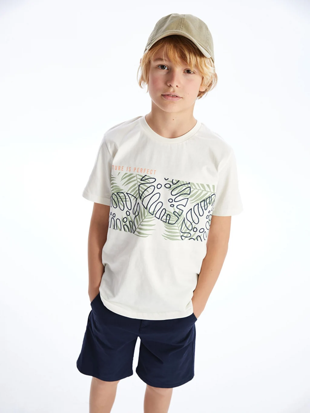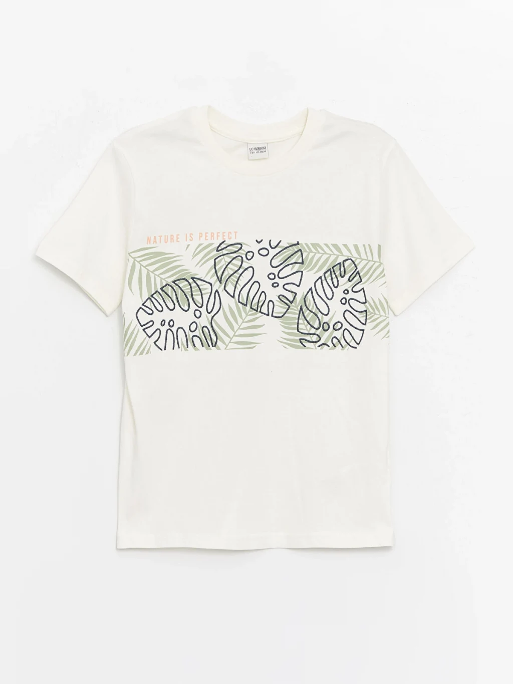 Bisiklet yaka, kısa kollu erkek çocuk tişört, %100 pamuklu penye kumaştan üretilmiştir. Ön kısmında yaprak deseni ve yazı baskısı bulunur.