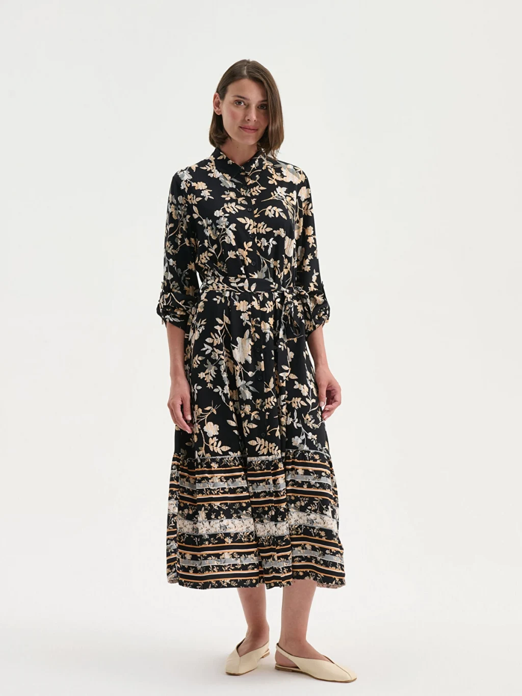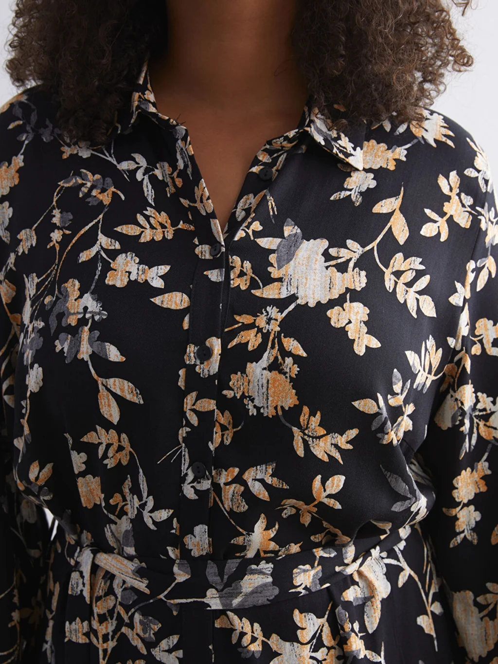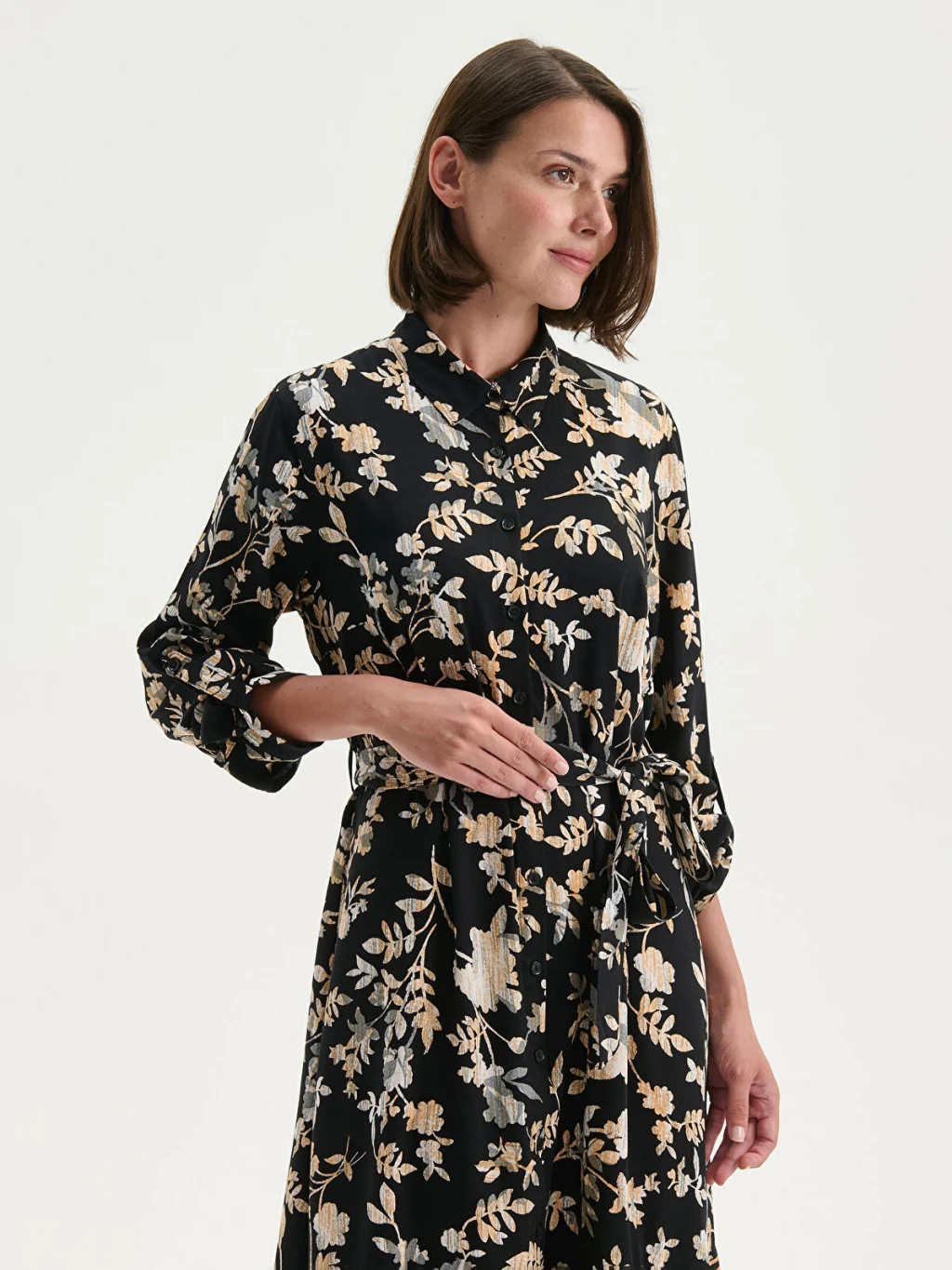 Desenli kadın gömlek elbise, belmando kumaştan üretilmiştir. Beli kuşaklı ve düğme kapamalı tasarıma sahiptir.