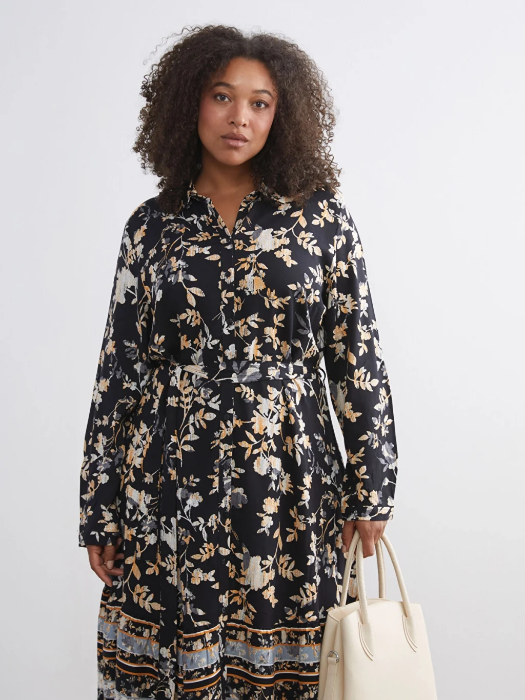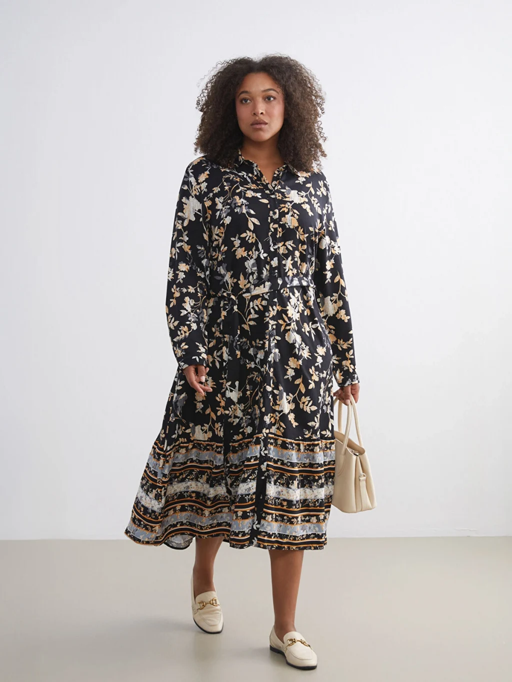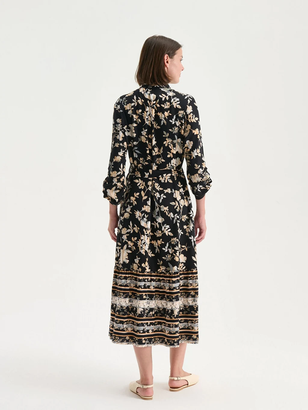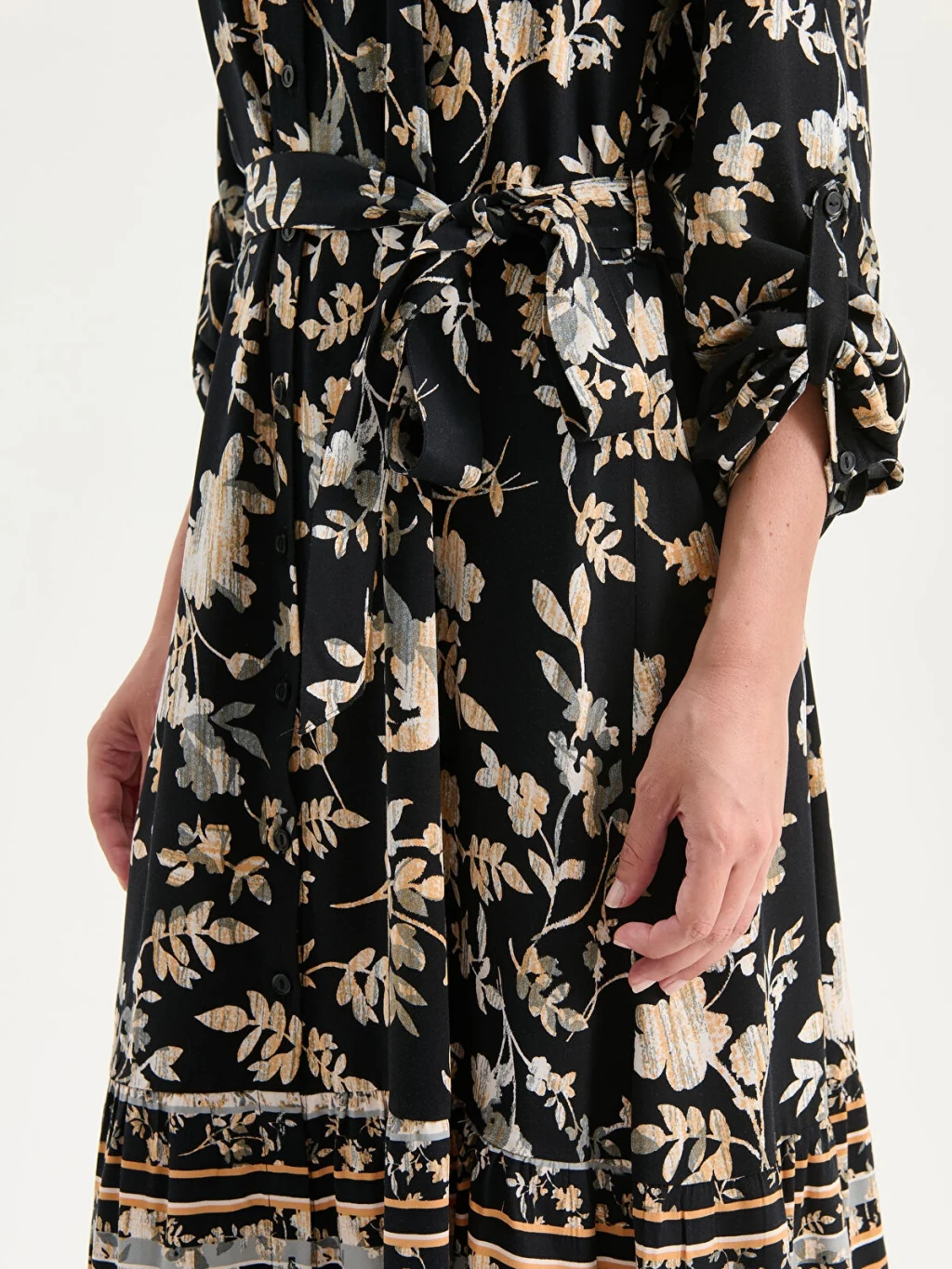 Desenli kadın gömlek elbise, belmando kumaştan üretilmiştir. Beli kuşaklı ve düğme kapamalı tasarıma sahiptir.