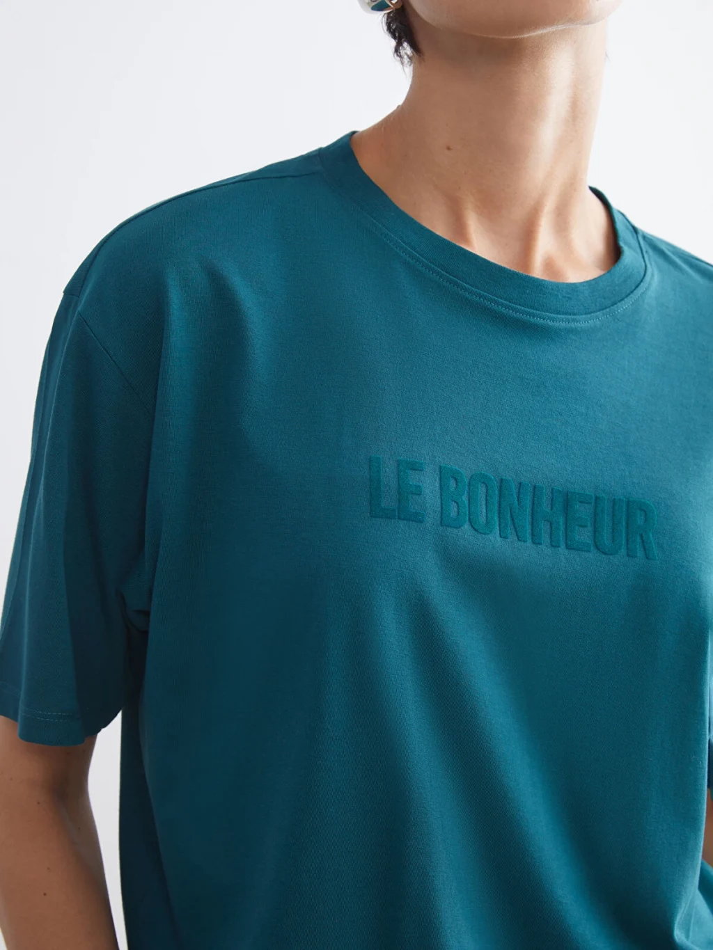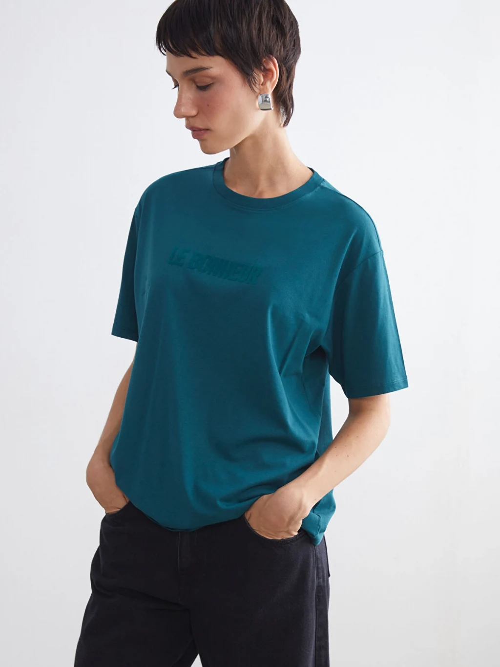 Oversize kalıplı kadın tişört, penye kumaştan üretilmiştir. Bisiklet yaka, kısa kollu ve önü kabartma yazılıdır.
