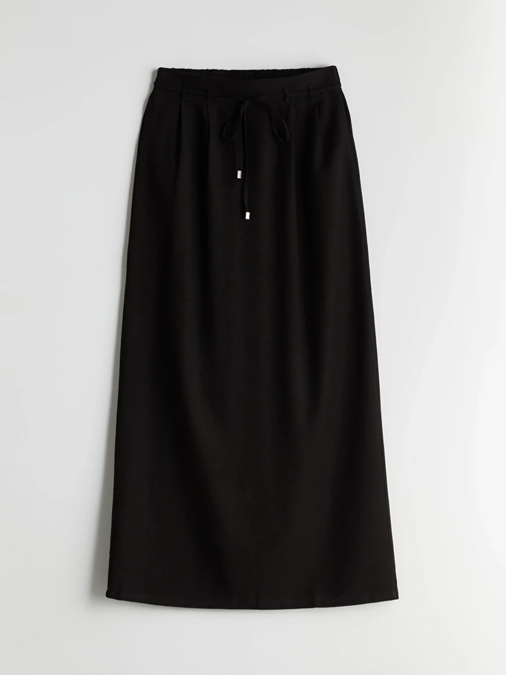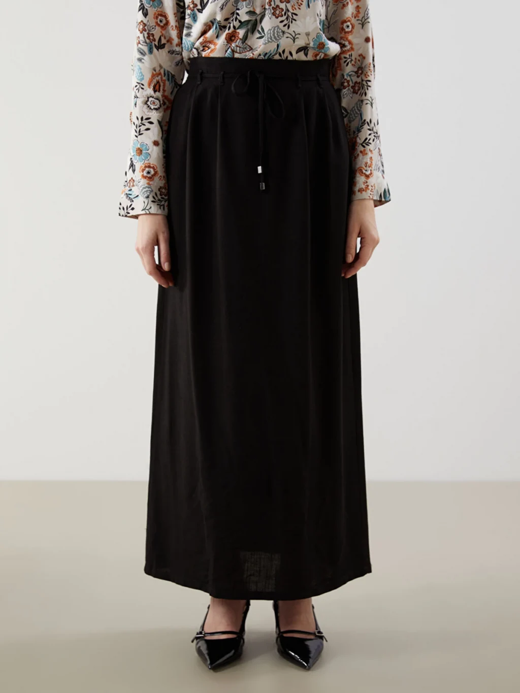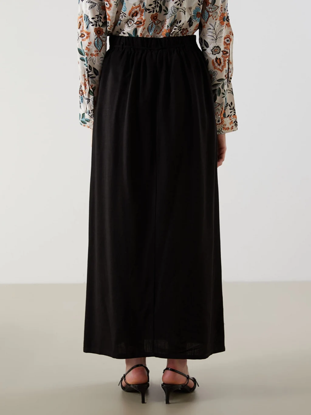 Keten karışımlı kumaştan üretilen kadın etek, uzun boyludur. Beli lastikli ve ayarlanabilir bağcıklı tasarıma sahiptir, astarsızdır.