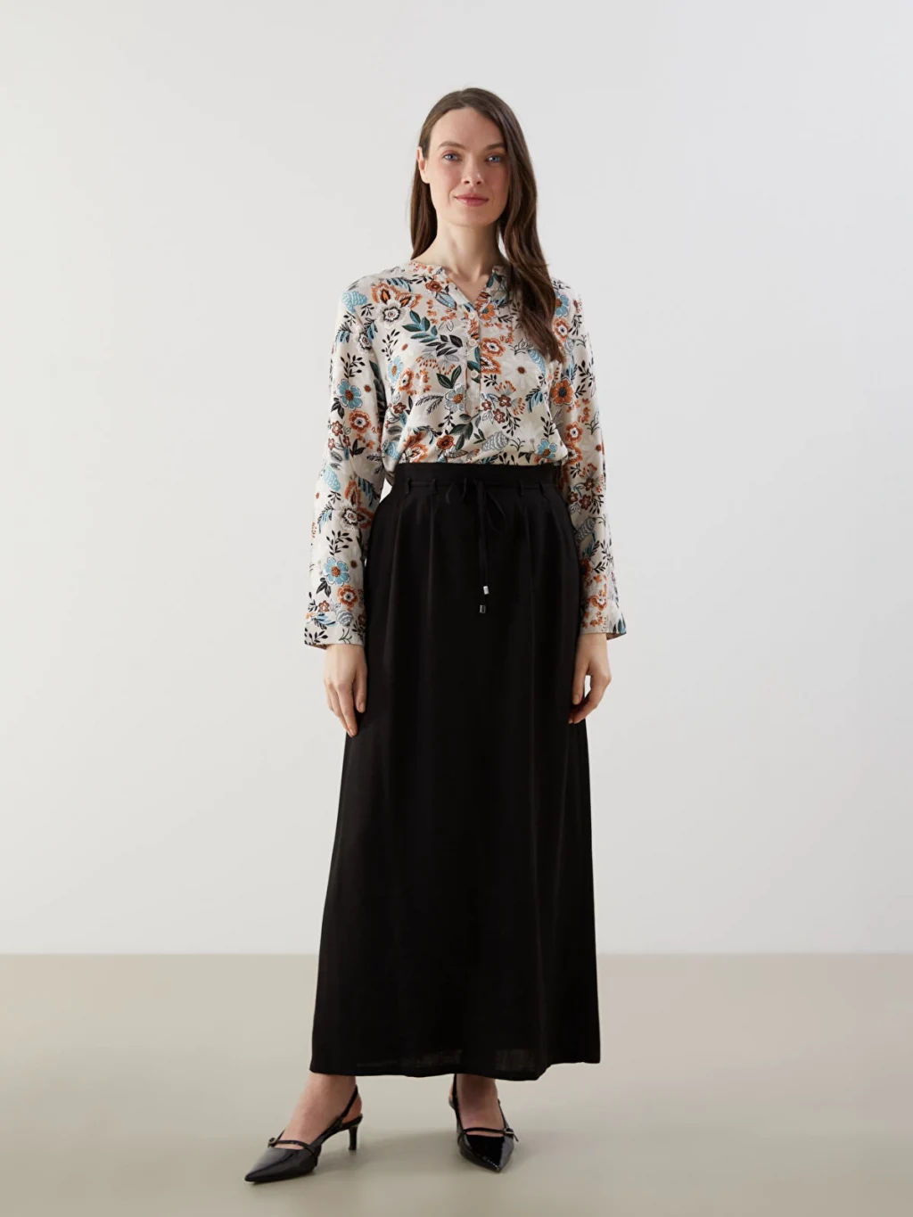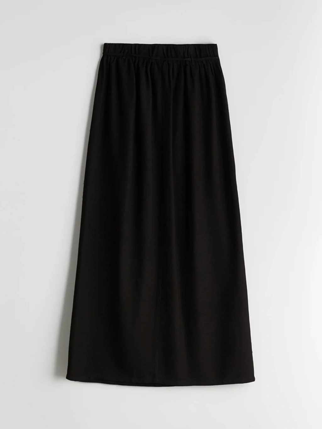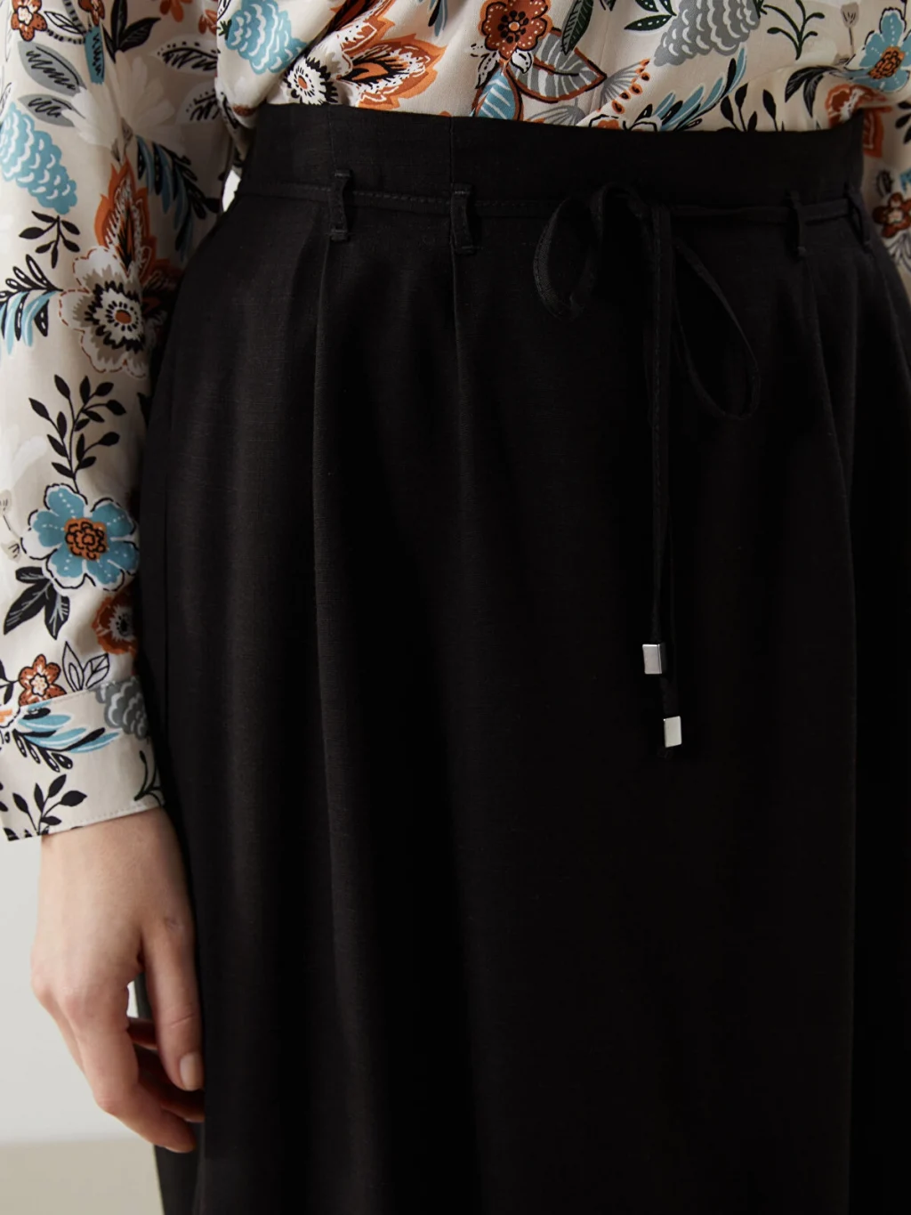Keten karışımlı kumaştan üretilen kadın etek, uzun boyludur. Beli lastikli ve ayarlanabilir bağcıklı tasarıma sahiptir, astarsızdır.