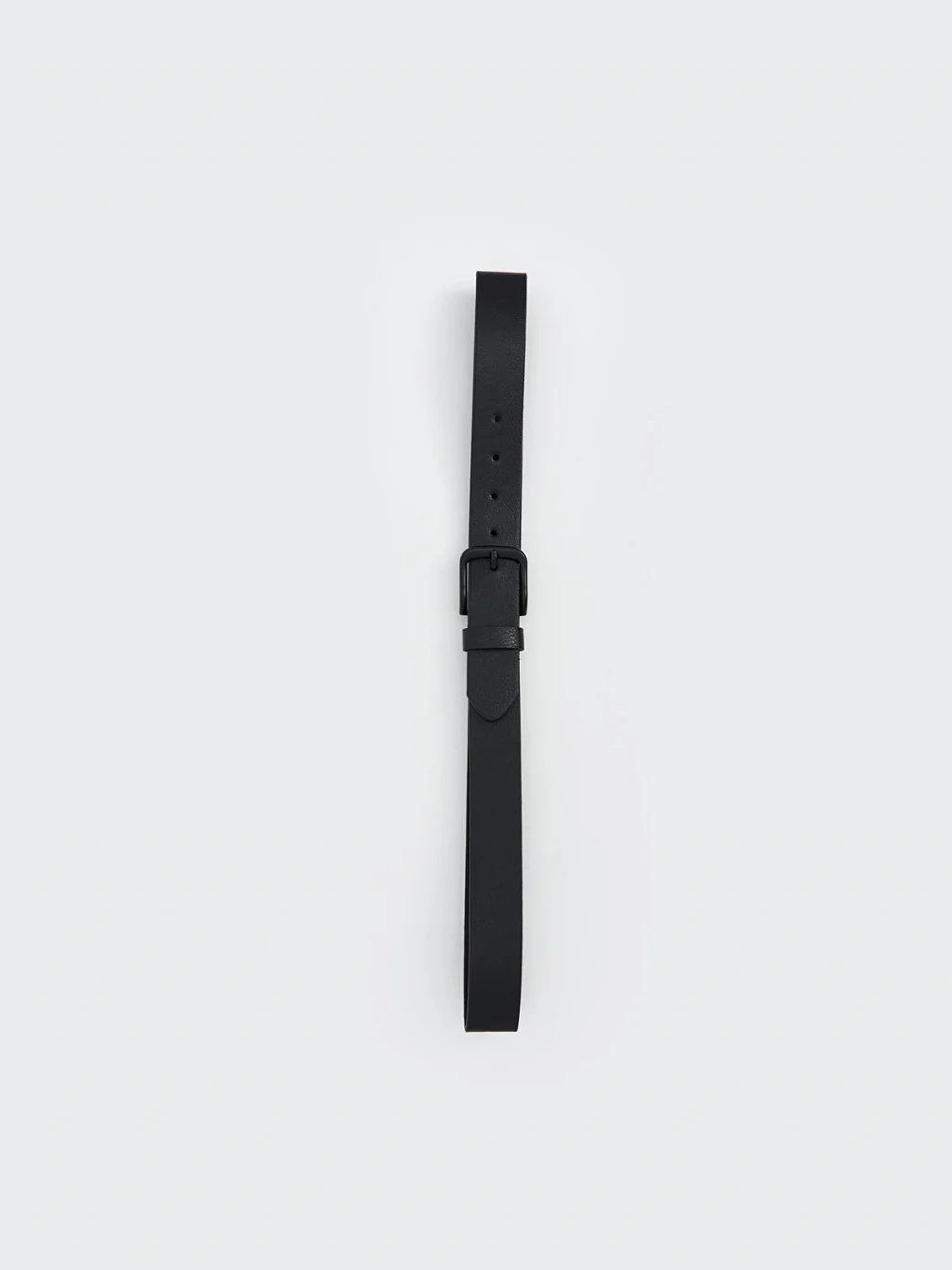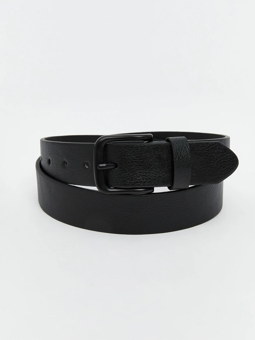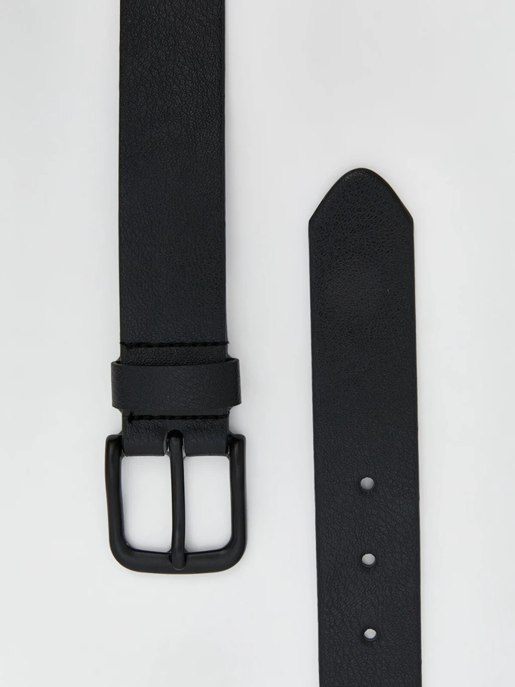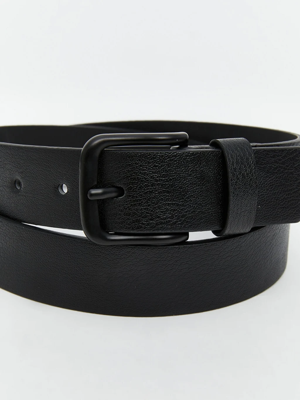Suni deri dokulu, metal iğne tokalı ve tek köprülü erkek kemer, ayarlanabilir bir tasarıma sahiptir.