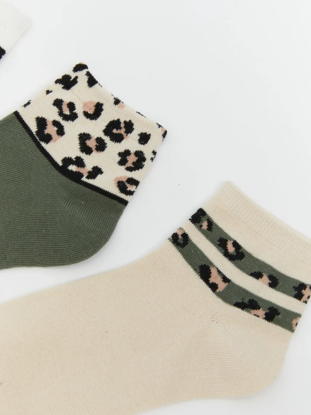 Kadın çorap seti, leopar desenli 5 çift soket çoraptan oluşur. Pamuk karışımlı kumaştan üretilmiştir.