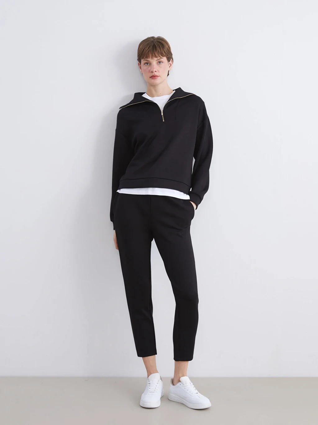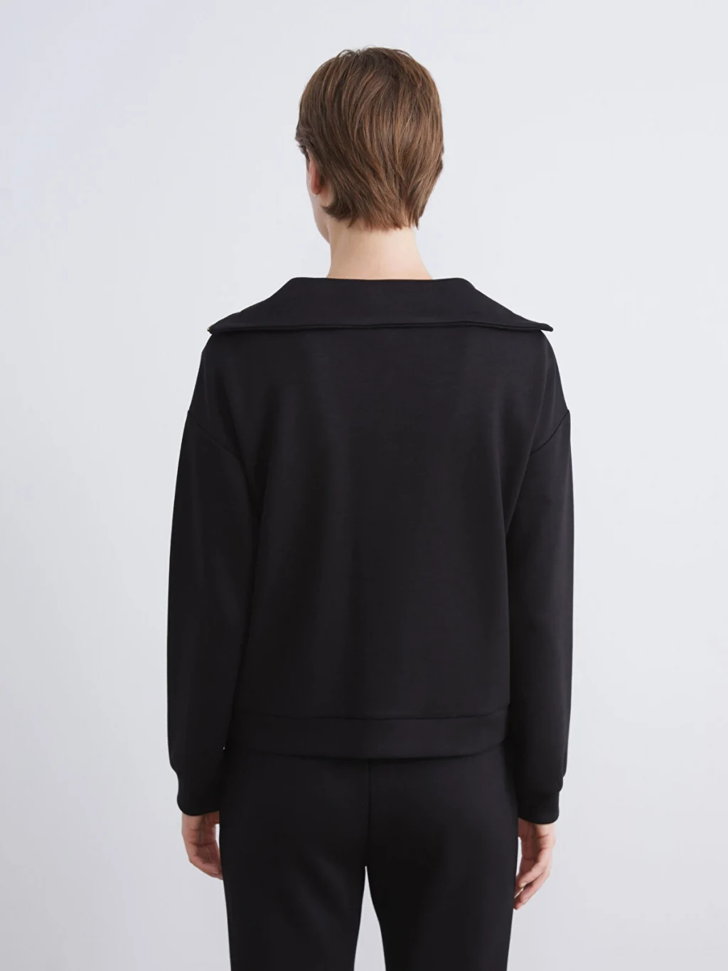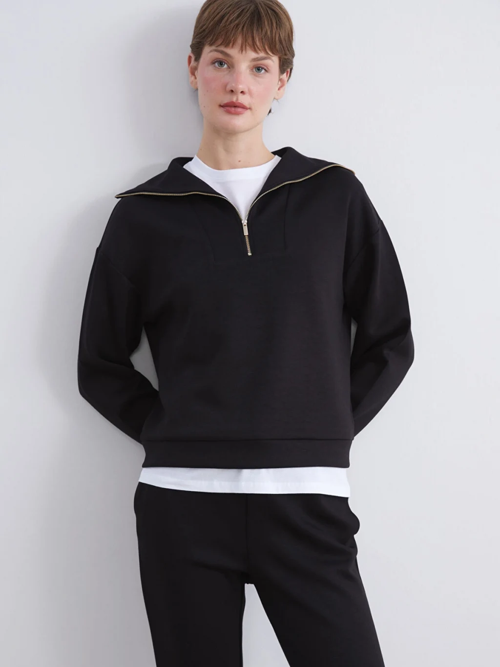 Fermuarlı dik yakalı, uzun kollu kadın sweatshirt, interlok kumaştan üretilmiştir. Düşük omuzludur, kol uçları ve etek ucu ribanalıdır.