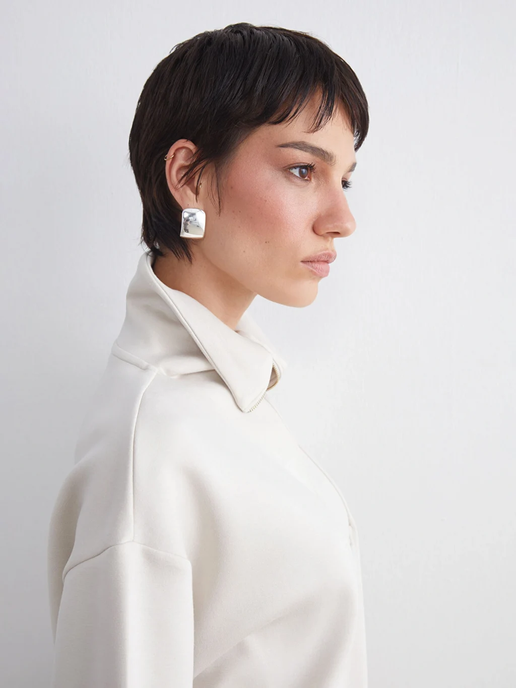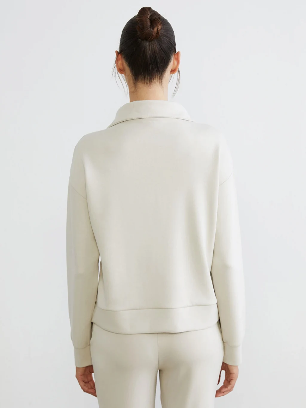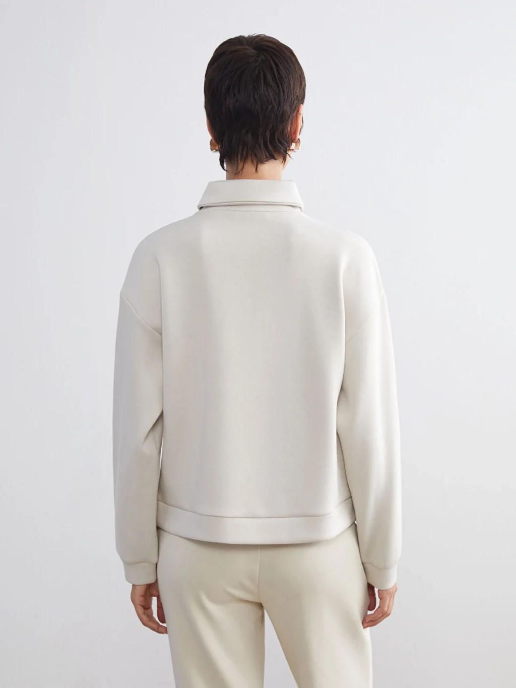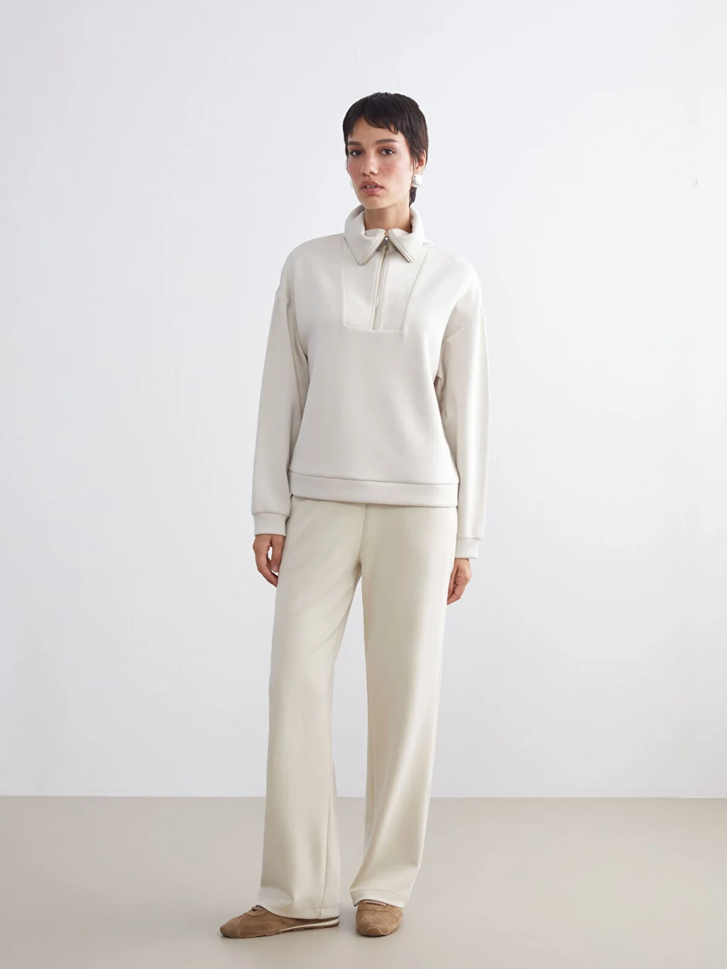 Fermuarlı dik yakalı, uzun kollu kadın sweatshirt, interlok kumaştan üretilmiştir. Düşük omuzludur, kol uçları ve etek ucu ribanalıdır.