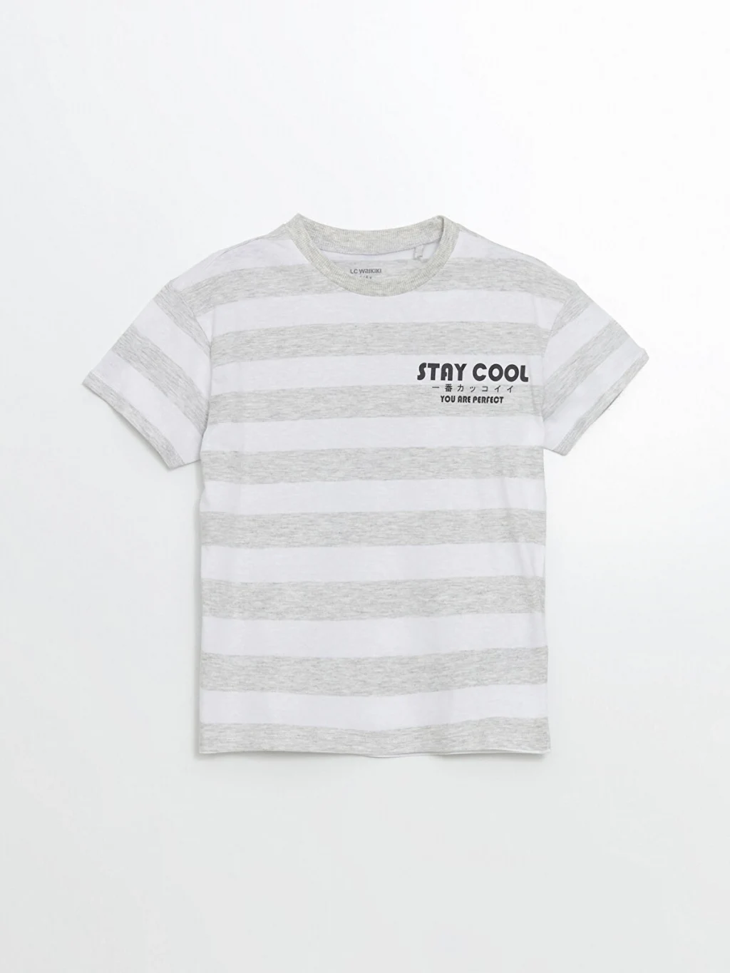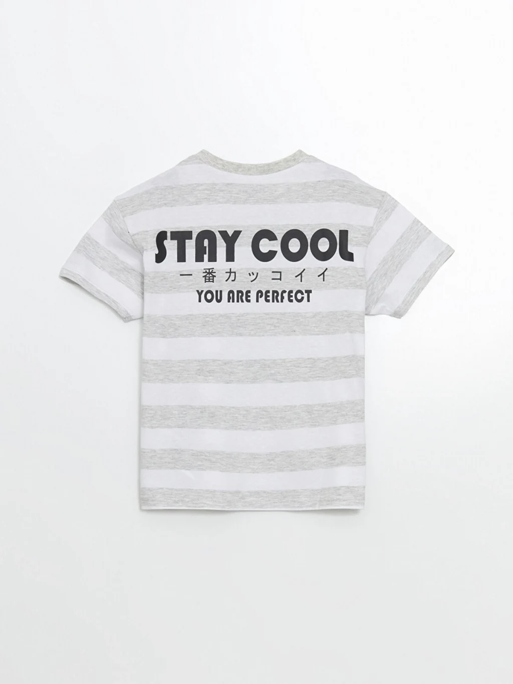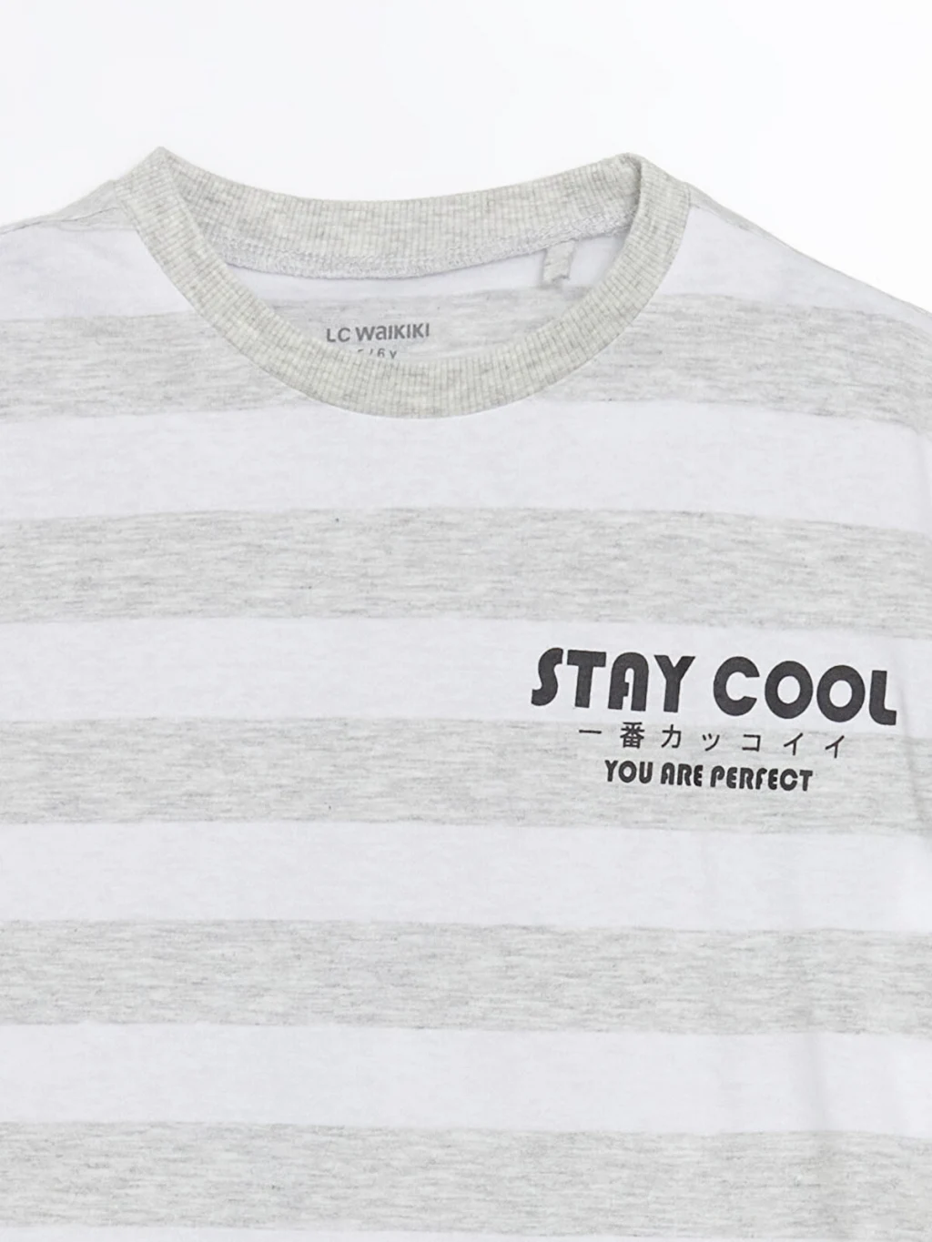 Bol kalıplı erkek çocuk tişört, yüksek pamuk içerikli penye kumaştan üretilmiştir. Bisiklet yakalı, kısa kollu, çizgili ve sırtı baskılıdır.