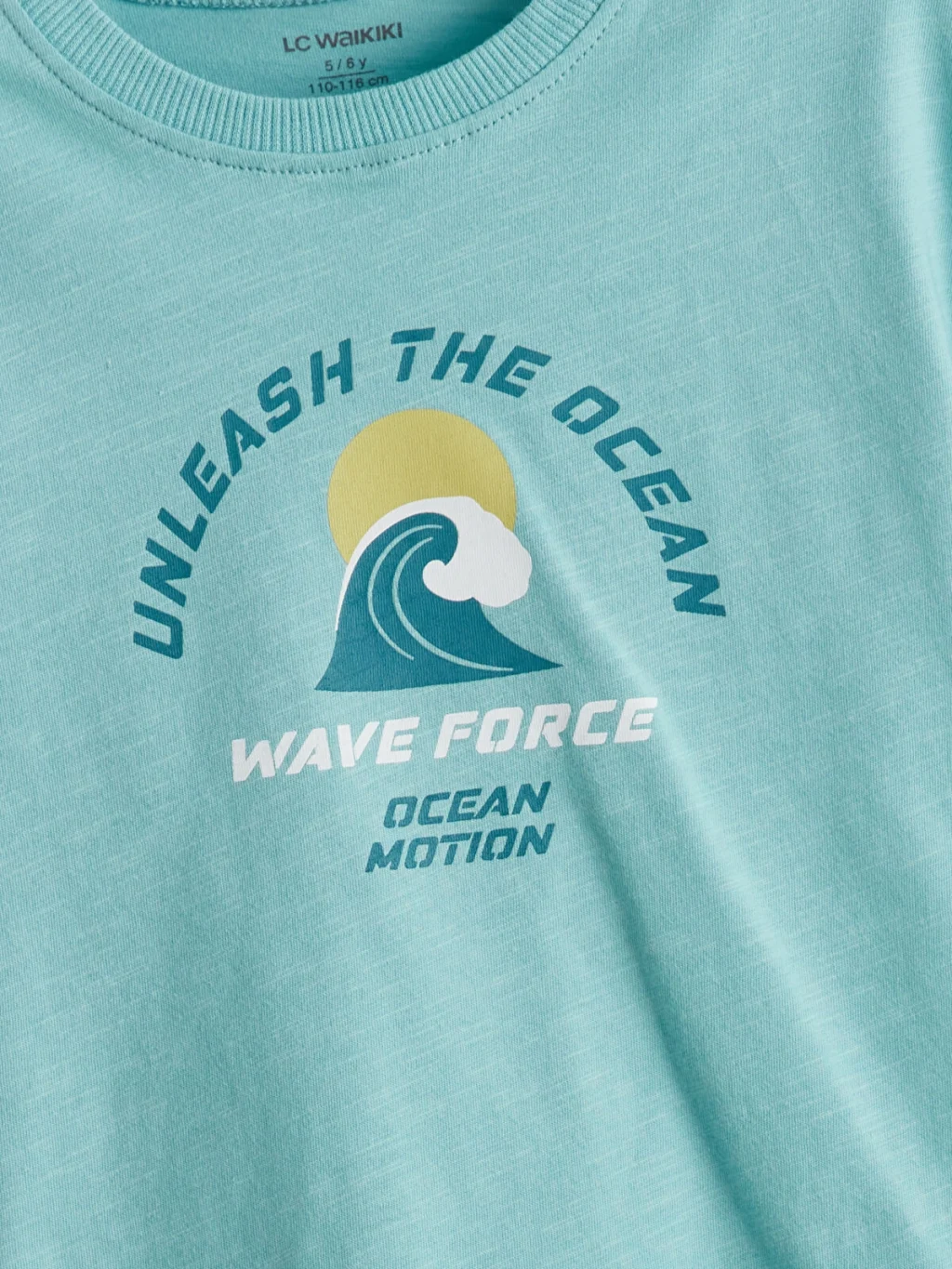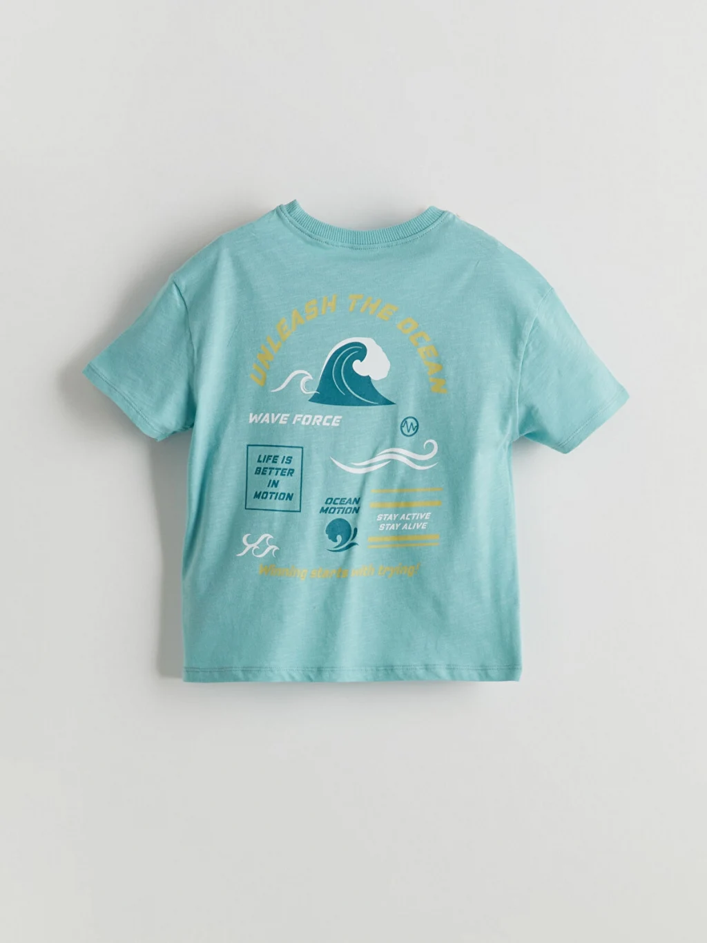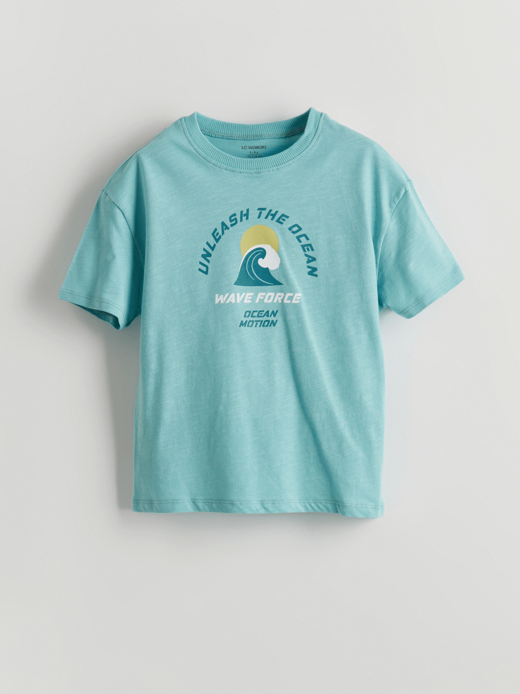 Bisiklet yaka, kısa kollu erkek çocuk tişört, %100 pamuklu penye kumaştan üretilmiştir. Bol kalıplı ve sırtı baskılı bir tasarıma sahiptir.
