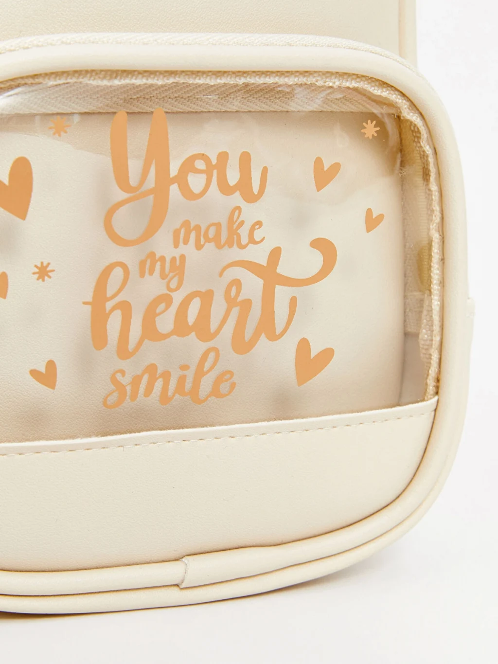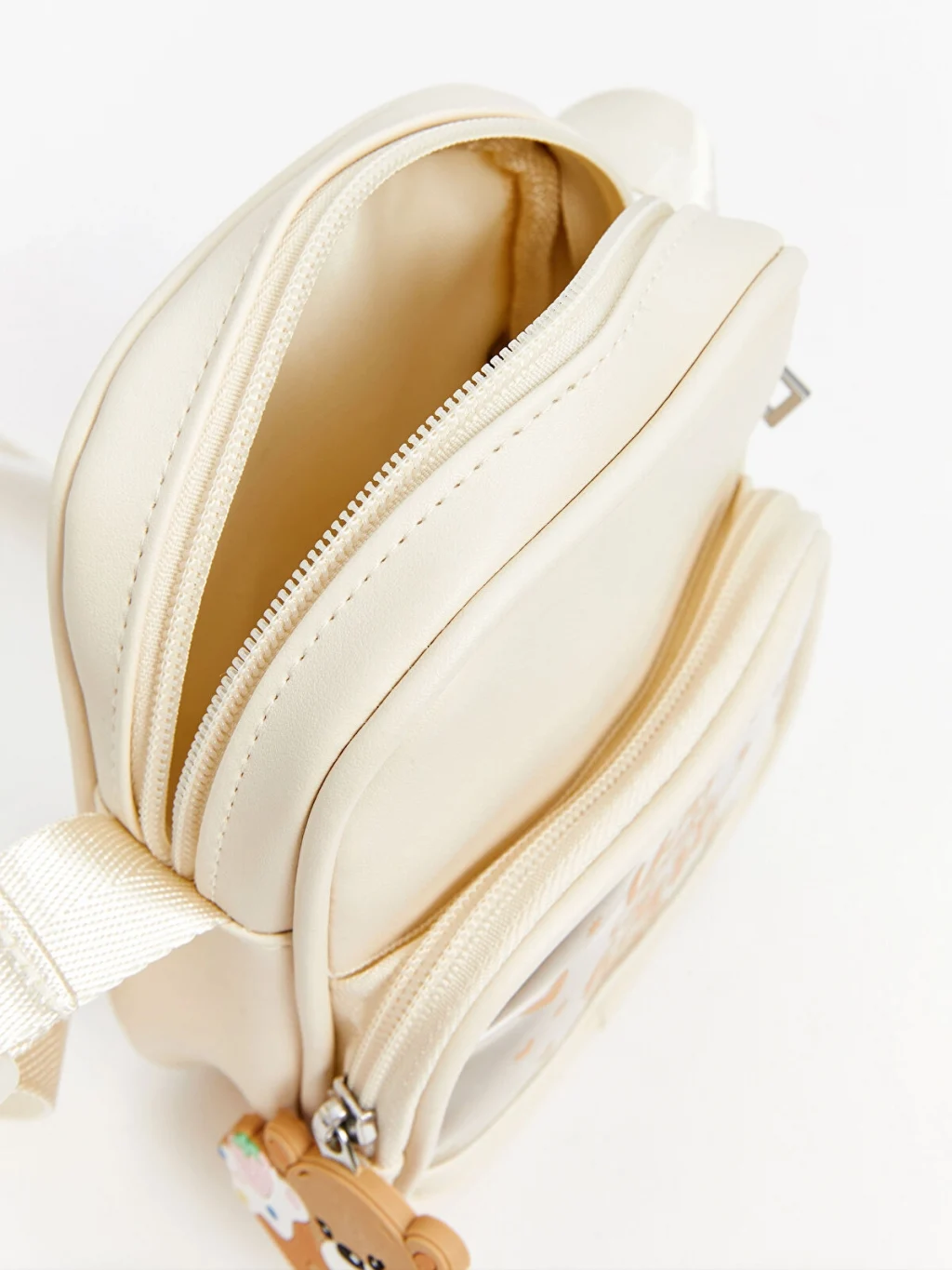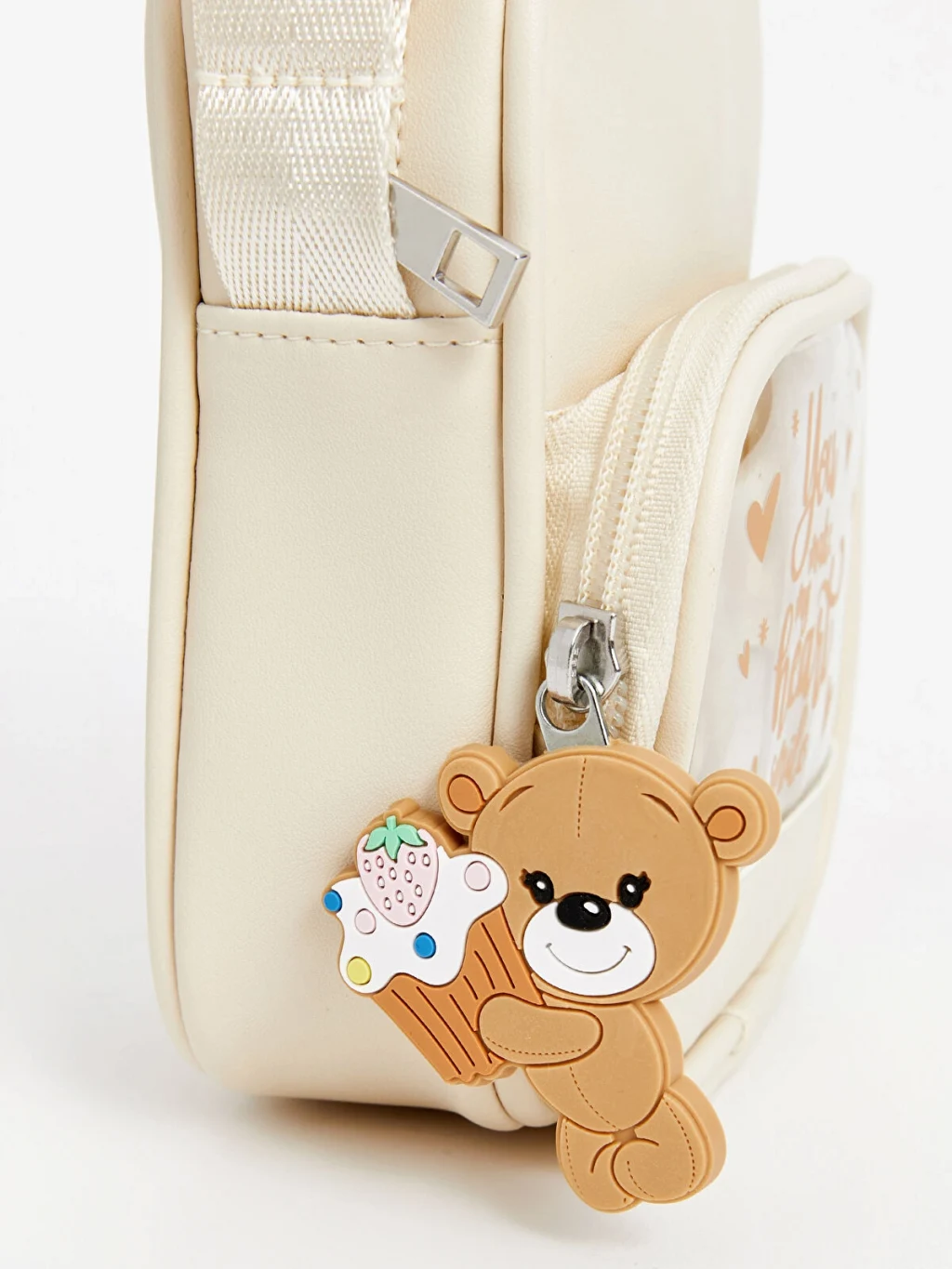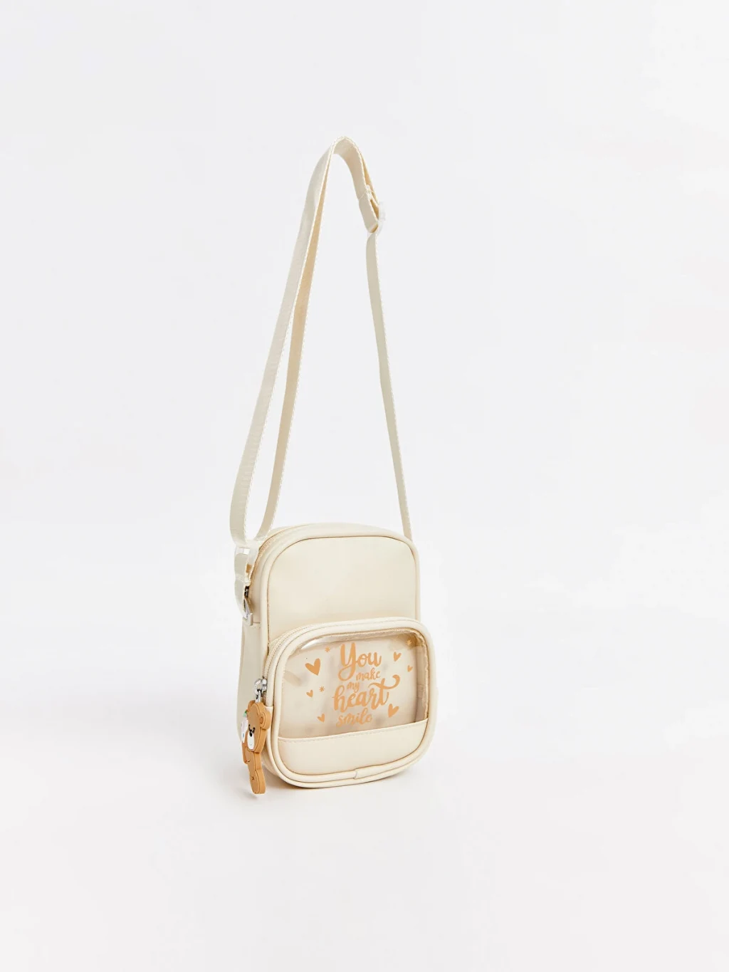 Ayarlanabilir omuz askılı kız çocuk omuz çantası, fermuarlı ana bölmeye ve figür aksesuarlı, şeffaf yüzeyli, baskılı ön cebe sahiptir.