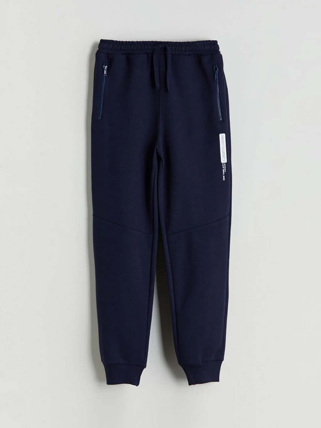 Beli lastikli ve ayarlanabilir bağcıklı erkek çocuk jogger eşofman altı, yanlarda fermuarlı ceplere sahiptir ve paçaları ribanalıdır.