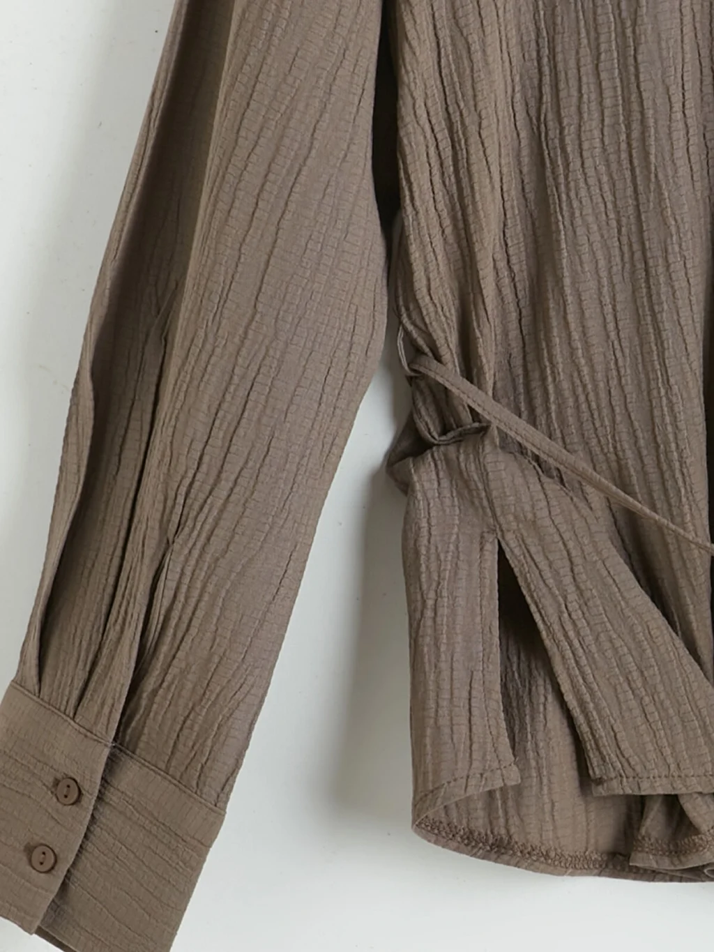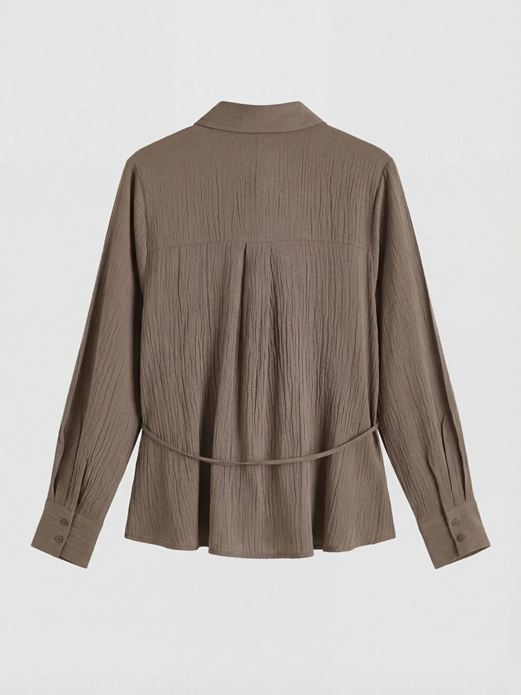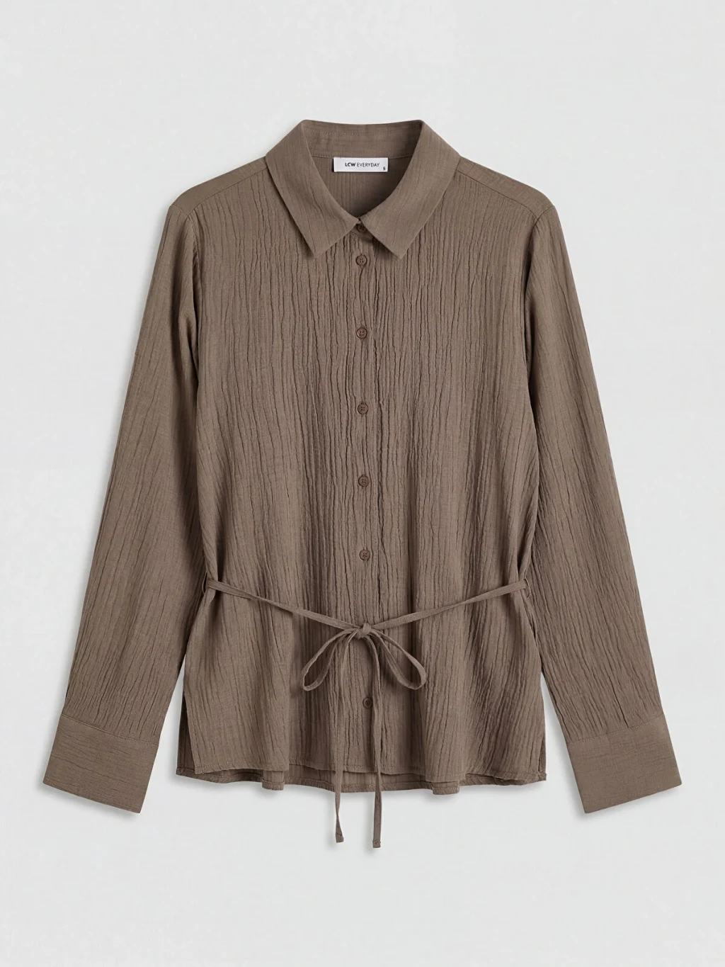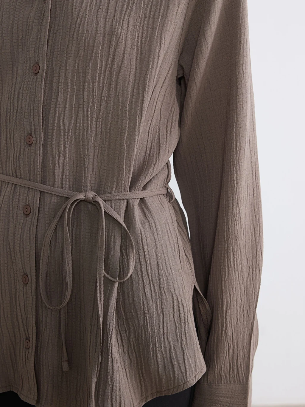 Uzun kollu kadın gömlek, gofre kumaştan üretilmiştir. Önden düğme kapamalıdır ve beli kuşaklı bir tasarıma sahiptir.