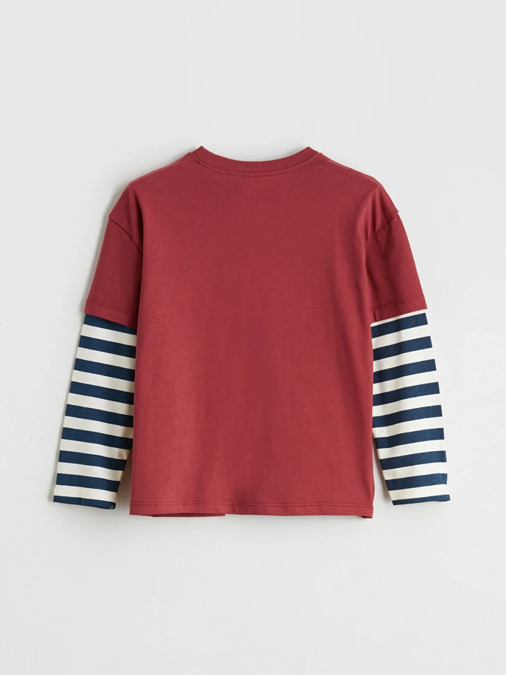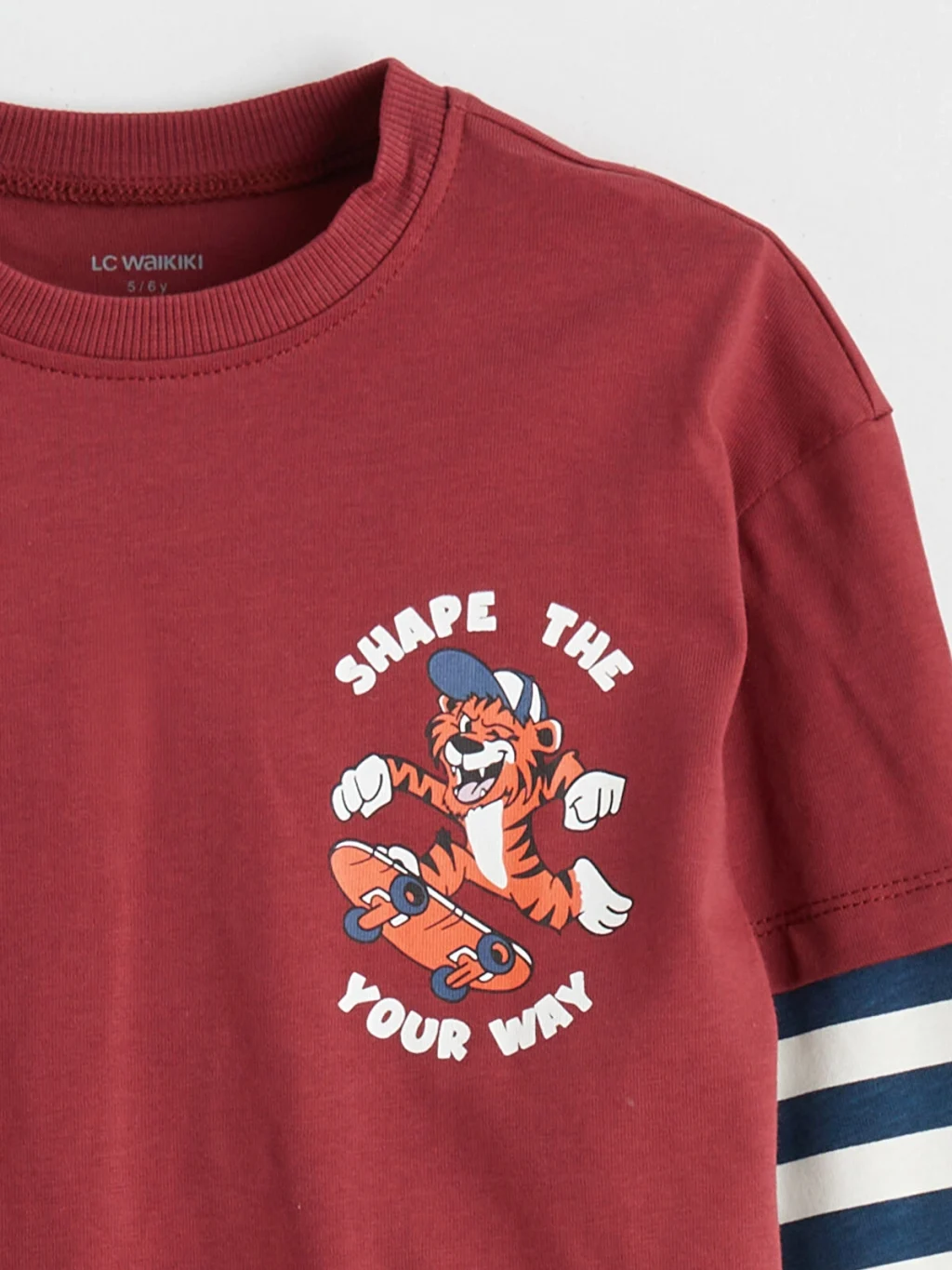 Bisiklet yakalı erkek çocuk tişört, katmanlı görünümlü uzun kollara sahiptir. Kolları çizgili desenli, önü baskılıdır.