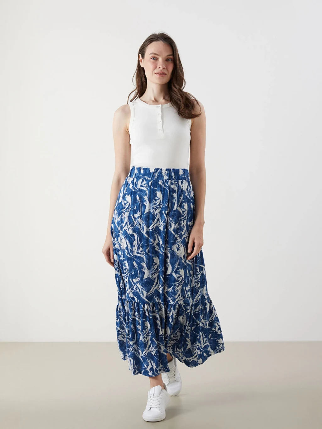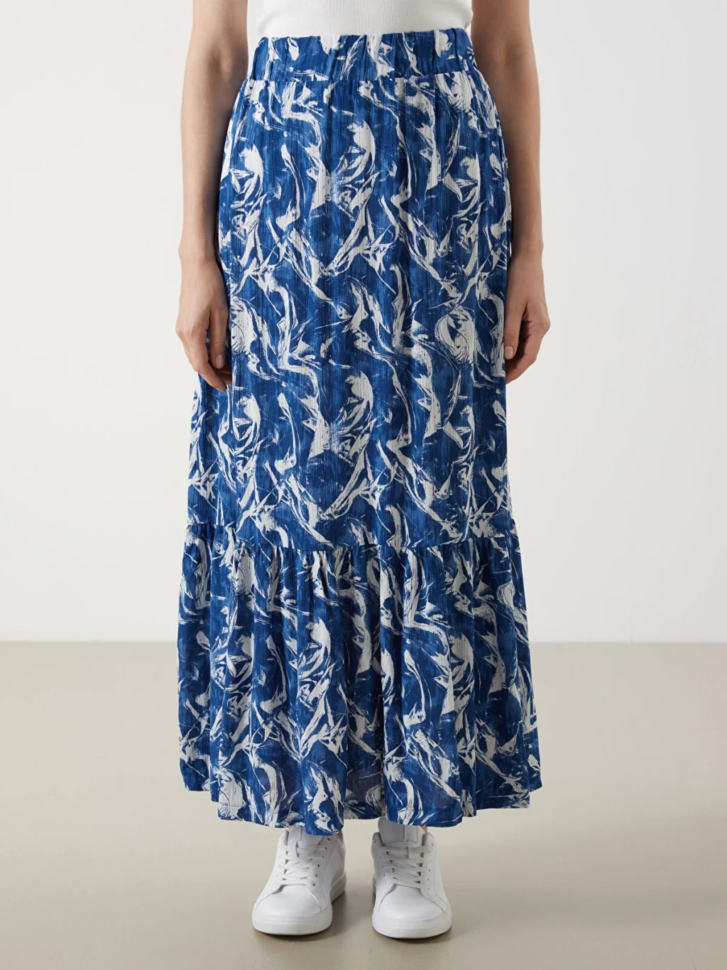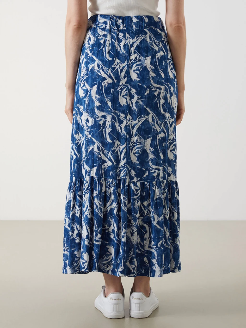 Desenli ve uzun boylu kadın etek, krinkle kumaştan üretilmiştir. Astarsızdır ve katlı tasarıma sahiptir.