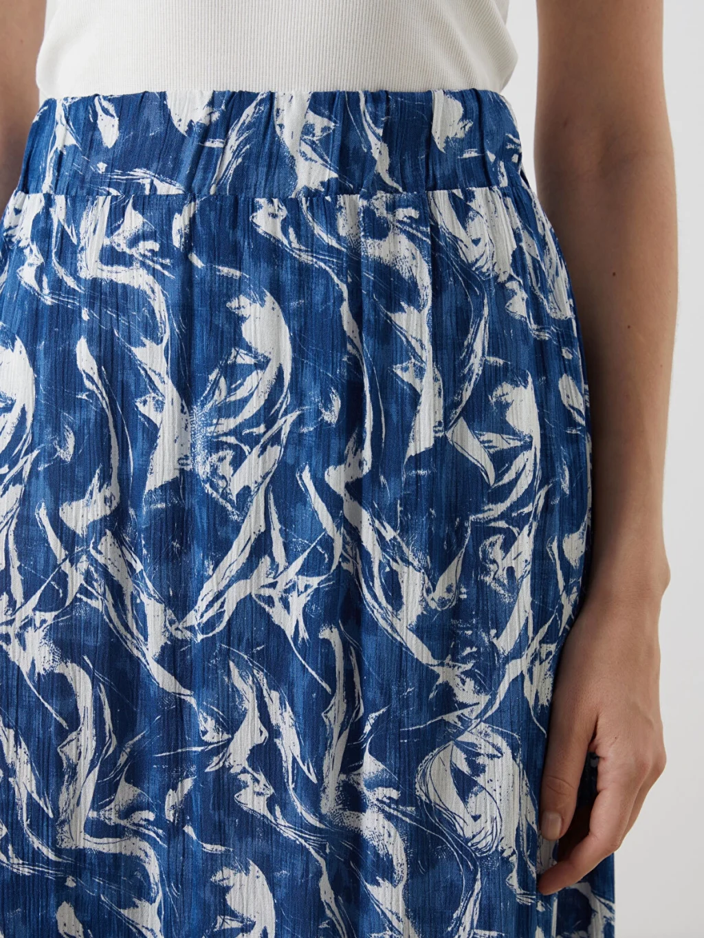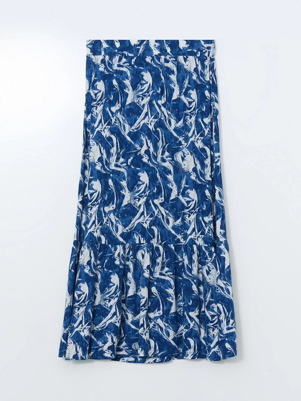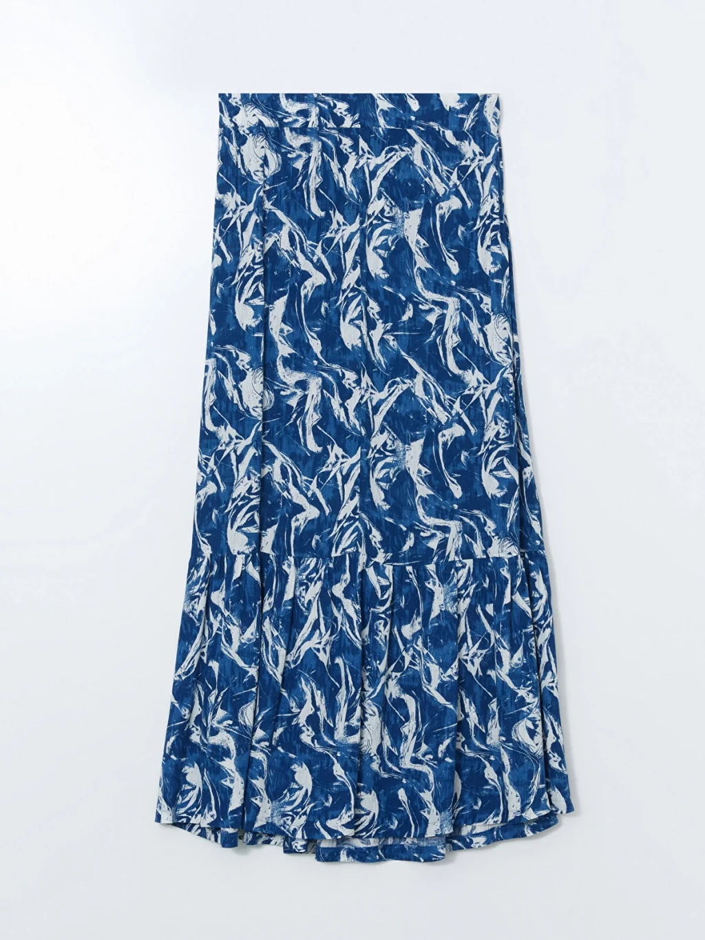 Desenli ve uzun boylu kadın etek, krinkle kumaştan üretilmiştir. Astarsızdır ve katlı tasarıma sahiptir.