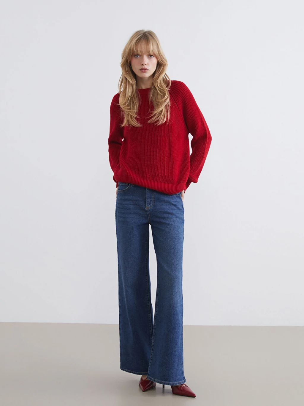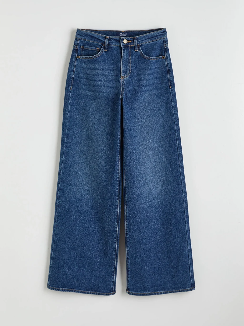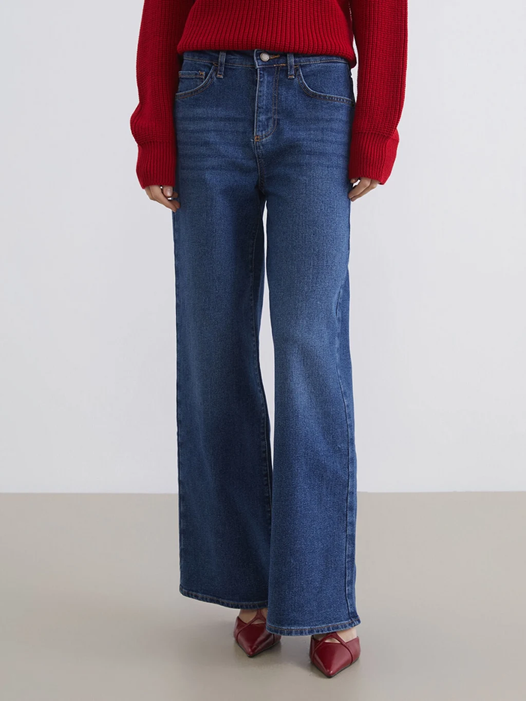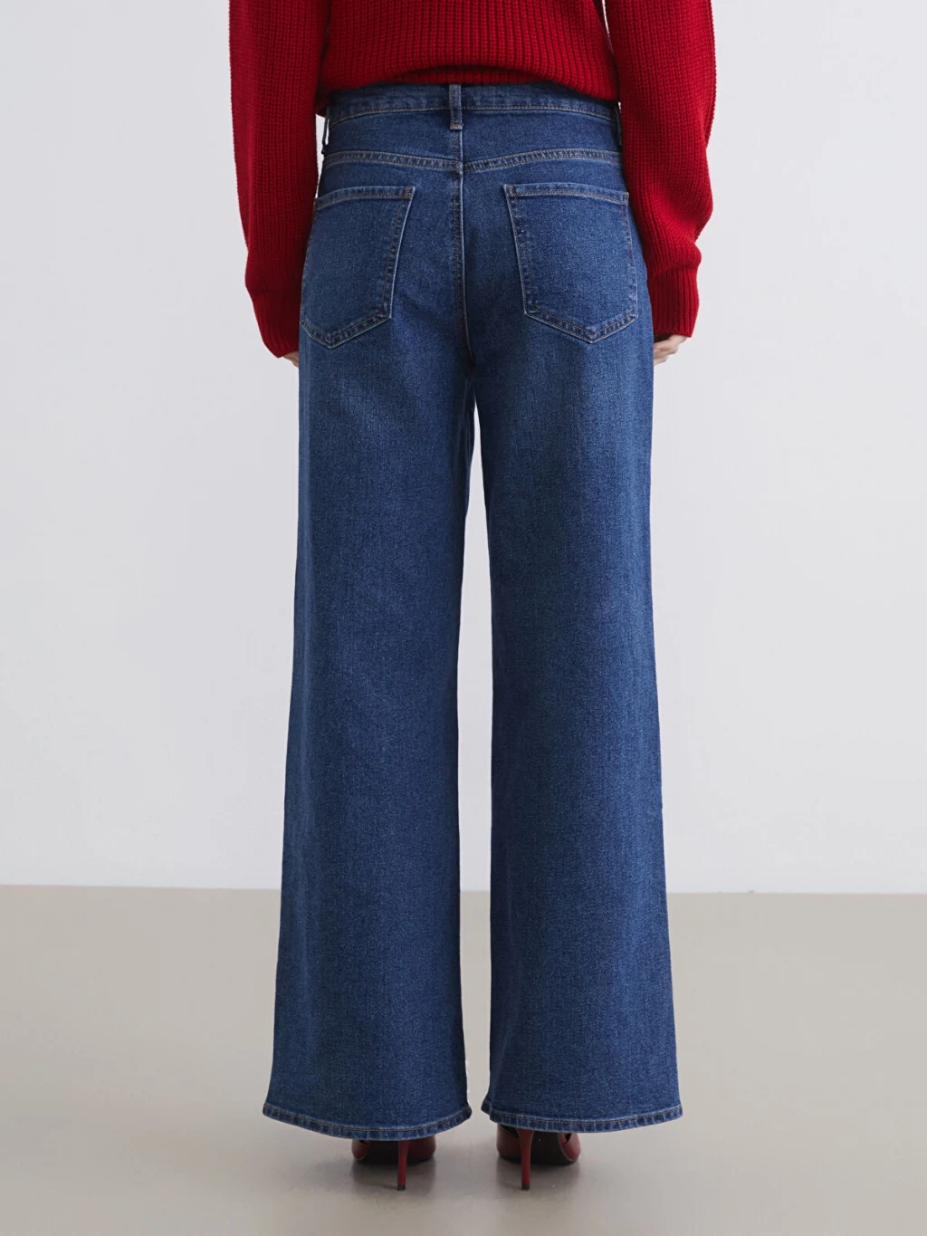 Yüksek bel, geniş paçalı kadın jean pantolon, beş cepli tasarıma sahiptir ve fermuar ile düğme kapamalıdır.