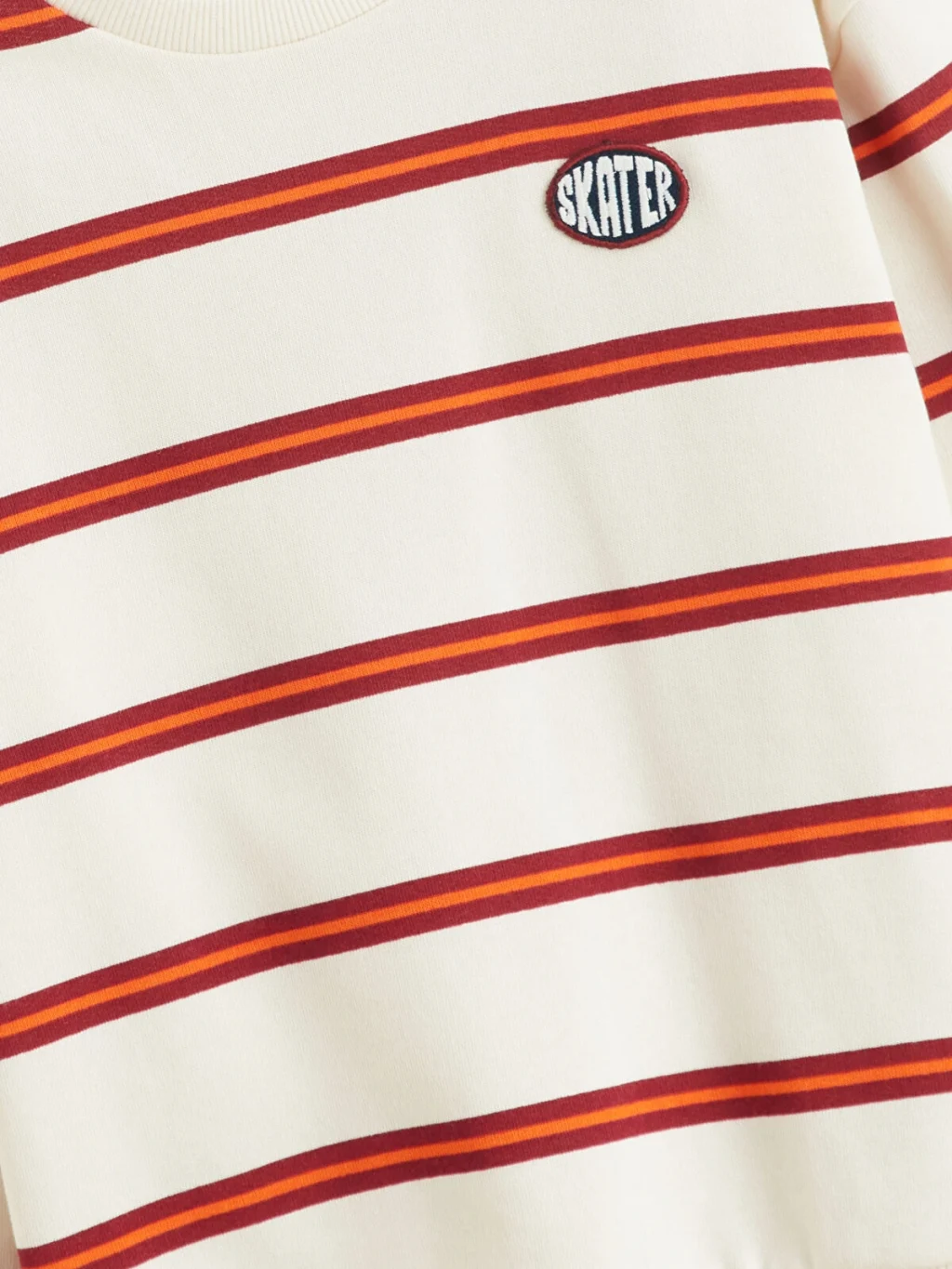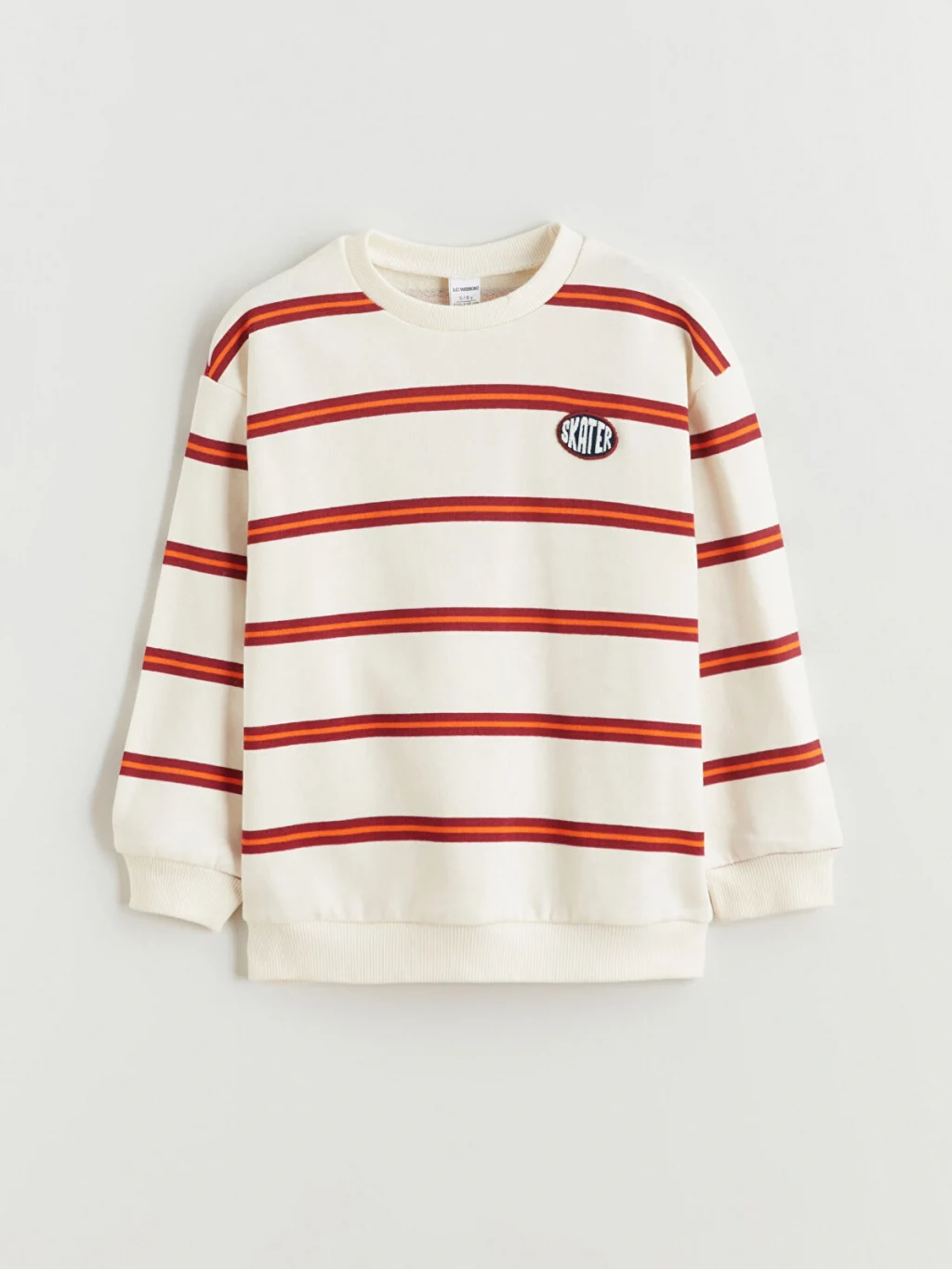 Bisiklet yaka ve uzun kollu erkek çocuk sweatshirt, çizgili desene sahiptir. Göğsünde aplike detayı bulunur, kol ve etek uçları ribanalıdır.