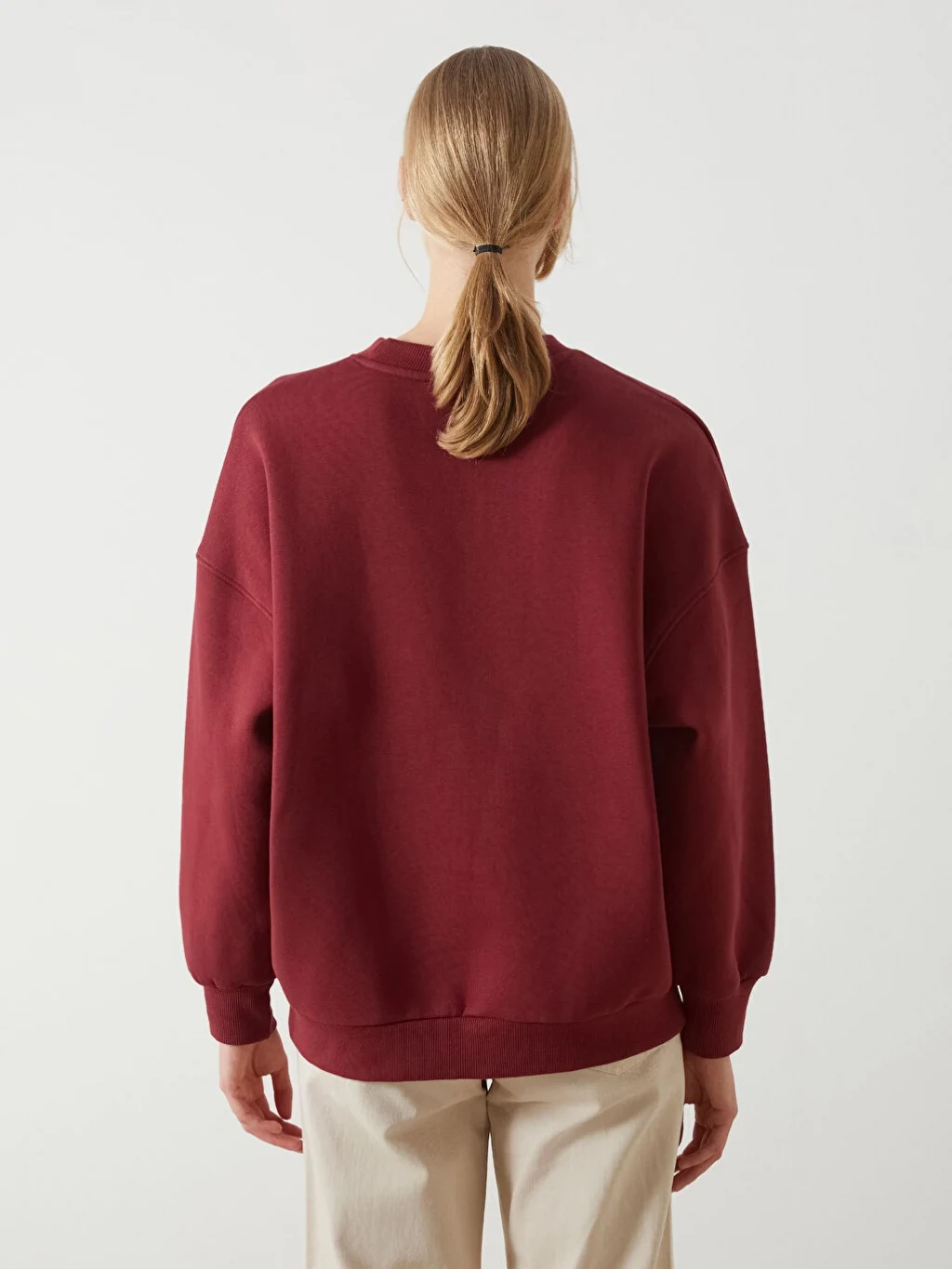Bisiklet yaka nakışlı uzun kollu oversize sweatshirt, üç iplik şardonlu kumaştan üretilmiştir. Bilekleri ve alt kısmı ribanalı yapısıyla hem hoş ve rahat bir görünüm sunar. Oversize kesimiyle modern ve rahattır.