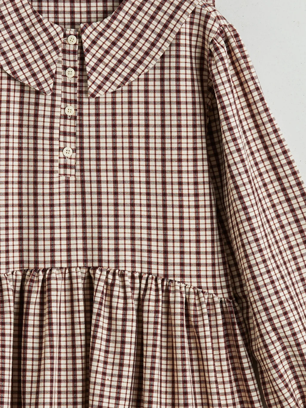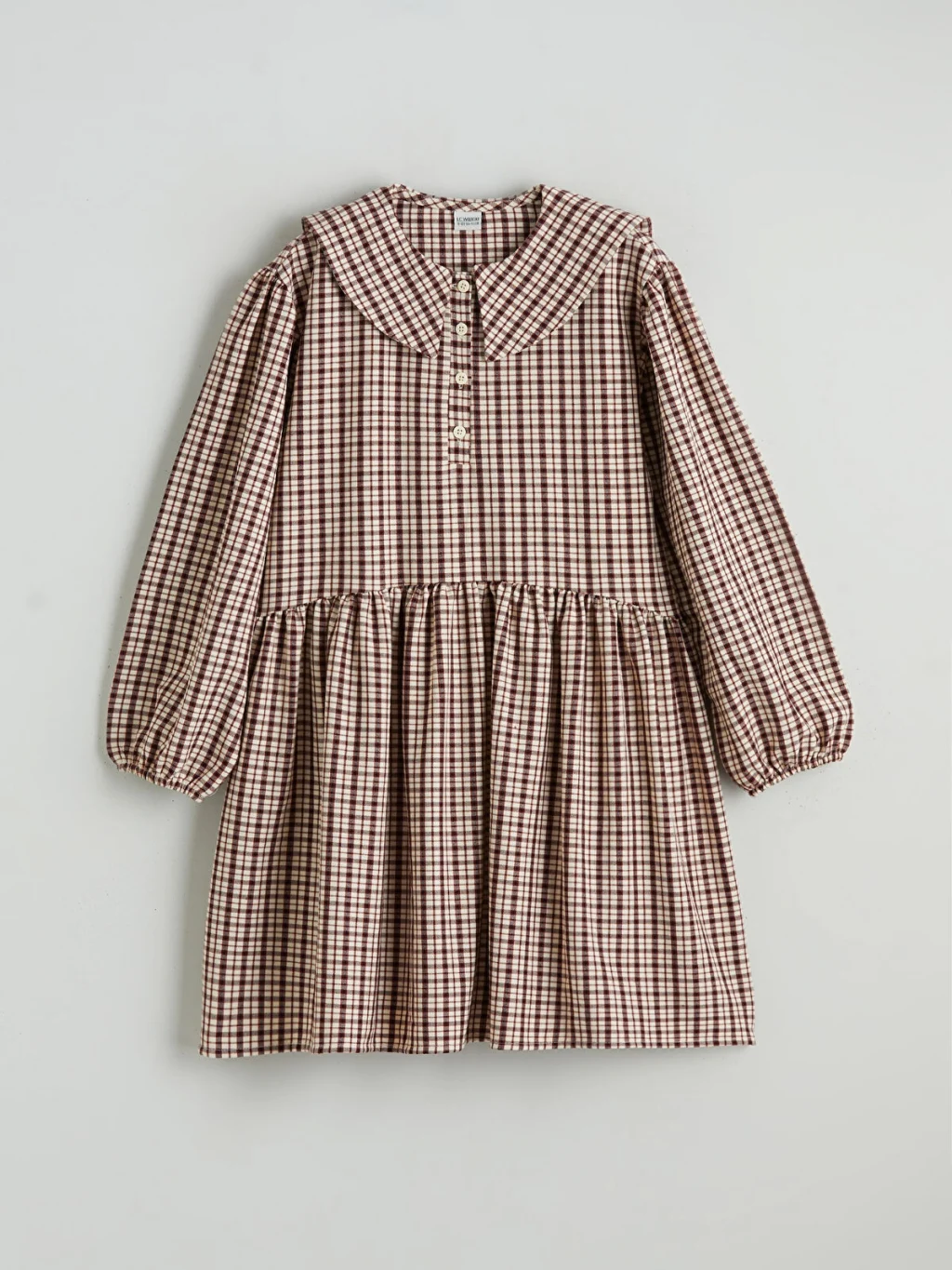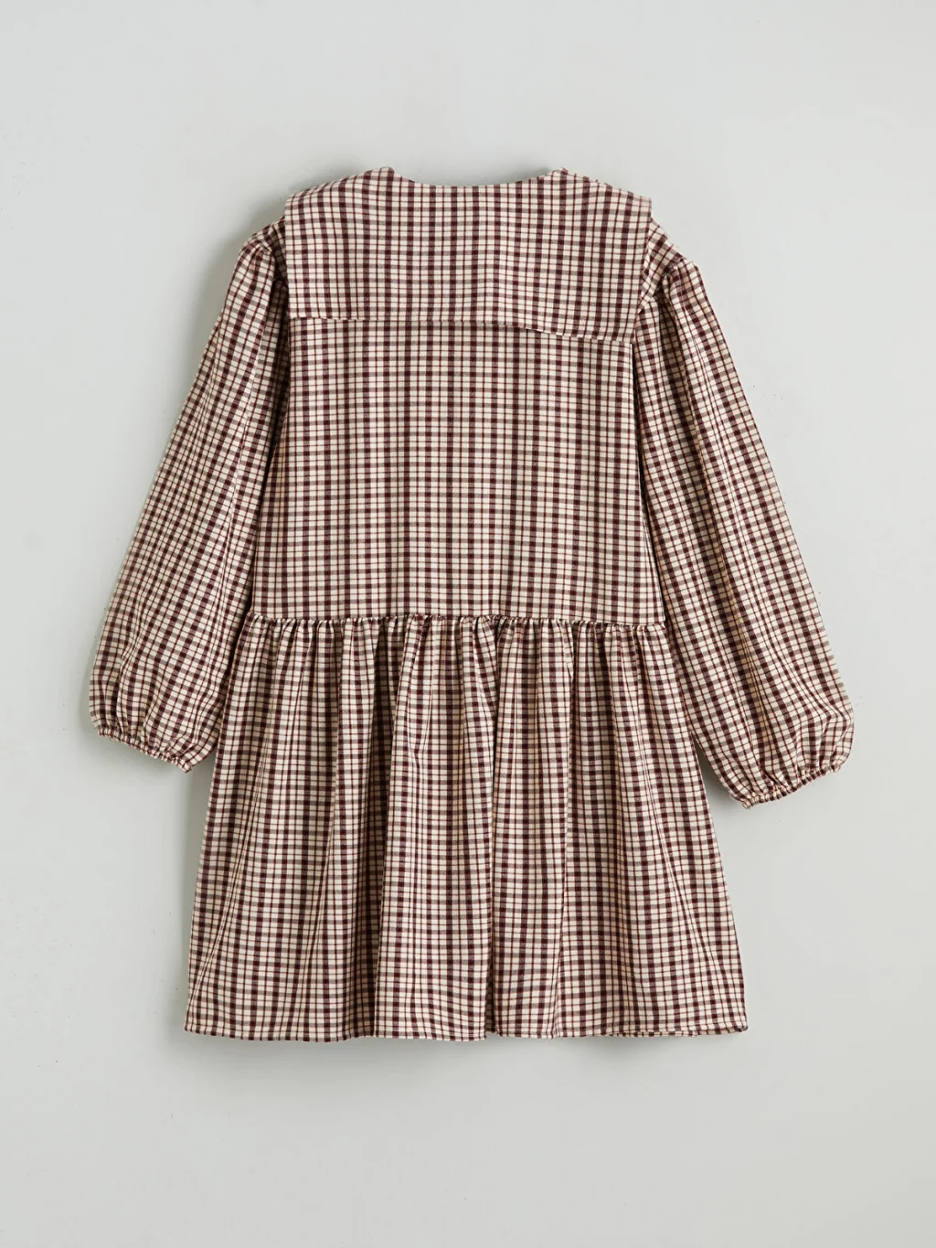 Kareli desenli, bebe yakalı kız çocuk elbise, uzun kollu ve manşetleri lastiklidir. Önden düğme kapamalı olup belden büzgülüdür.