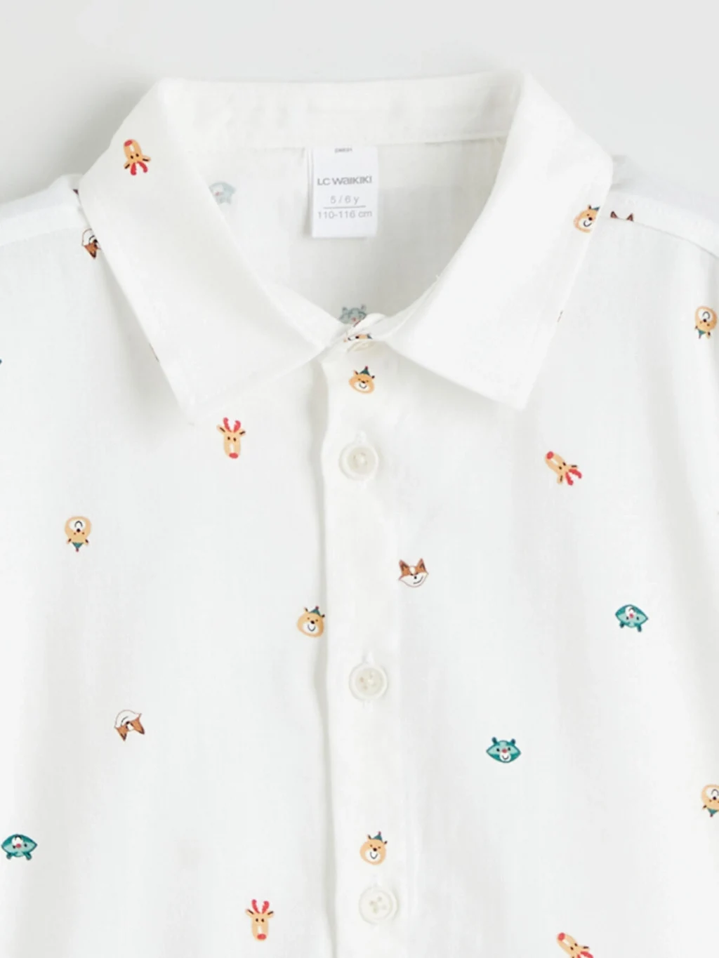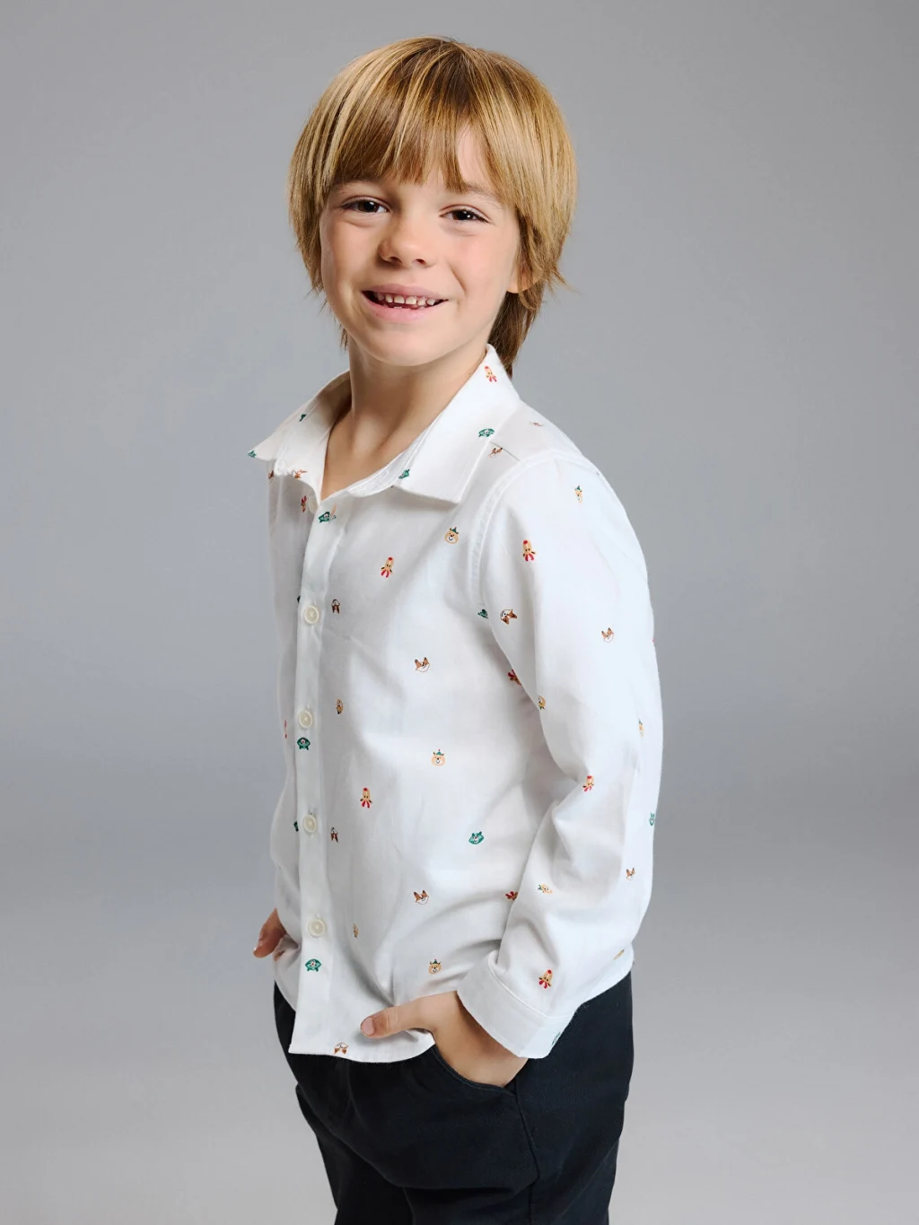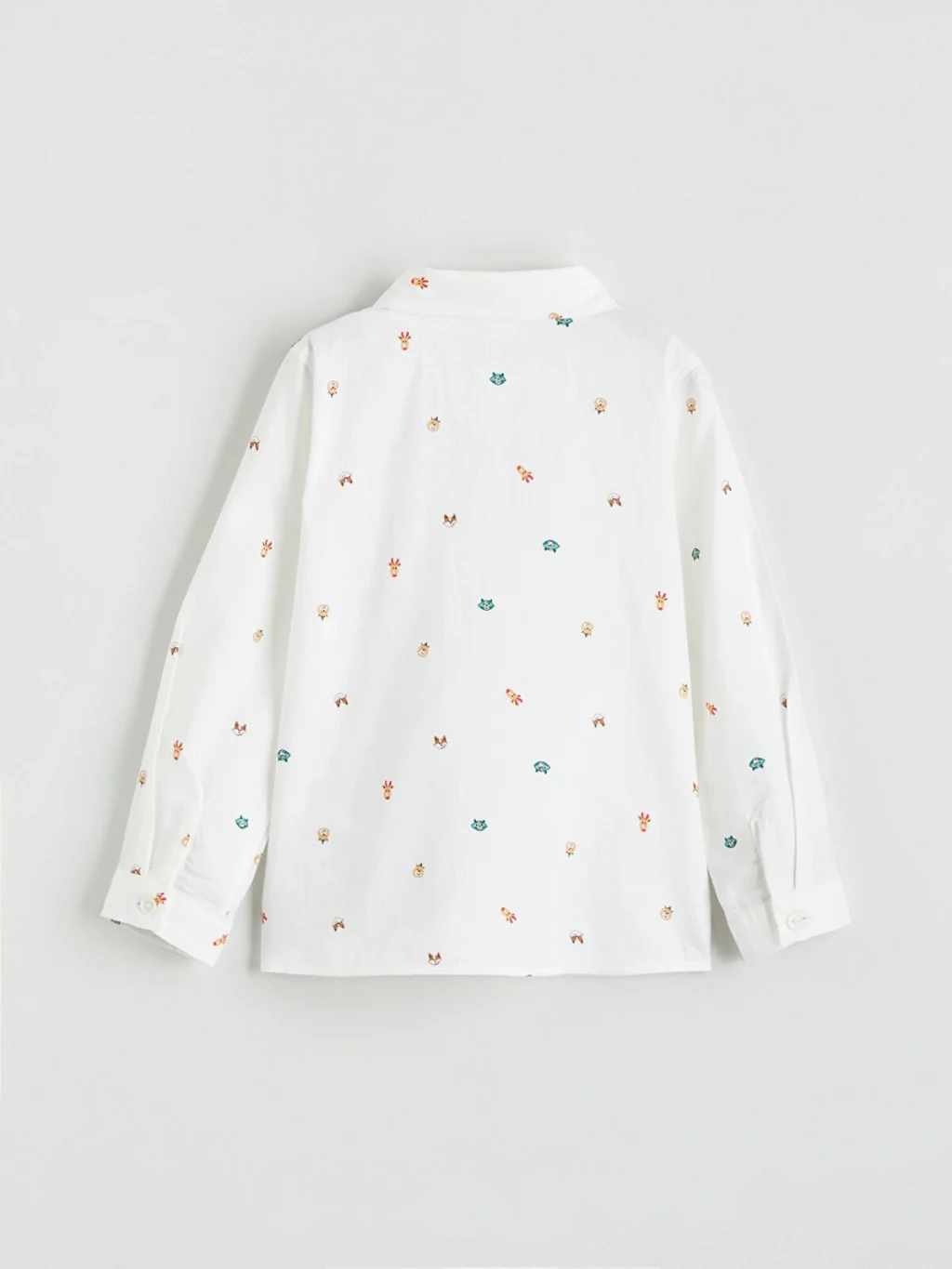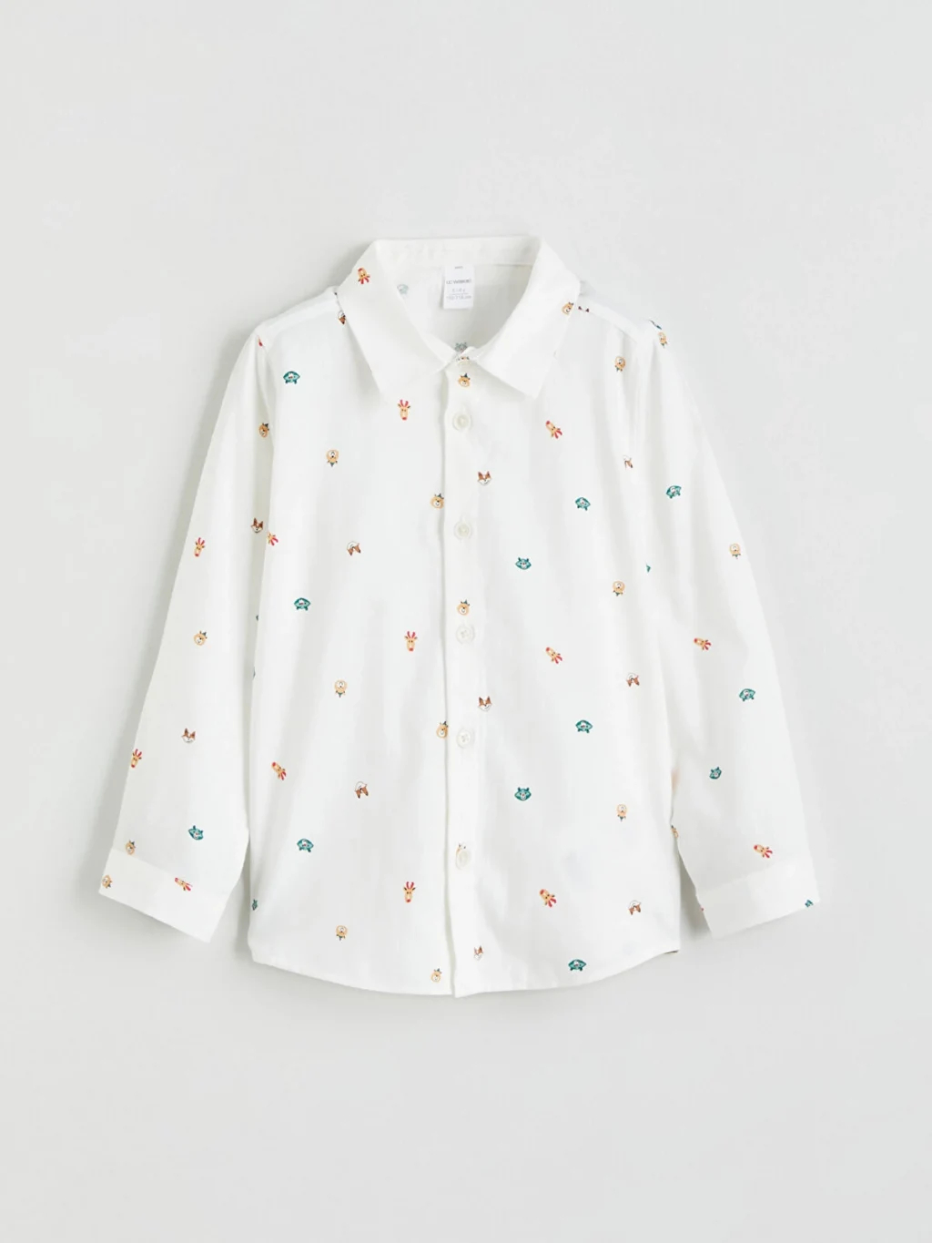 Erkek çocuk için üretilmiş gömlek, uzun kollu ve desenli bir tasarıma sahiptir. Önden düğme kapamalıdır.