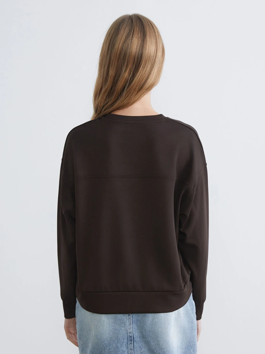 Bisiklet yakalı, uzun kollu kadın sweatshirt, ince interlok kumaştan üretilmiştir. Düşük omuzlu olup, kol ve etek ucu ribanalıdır.
